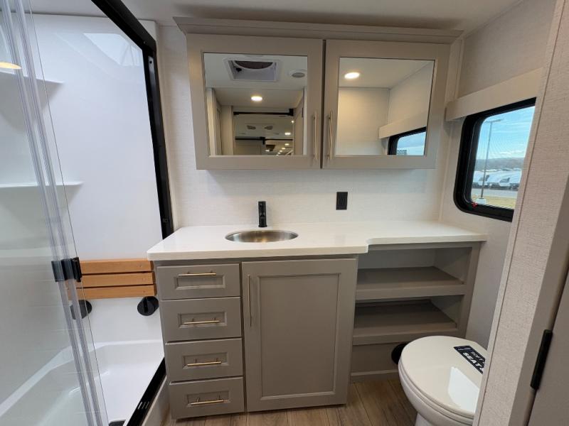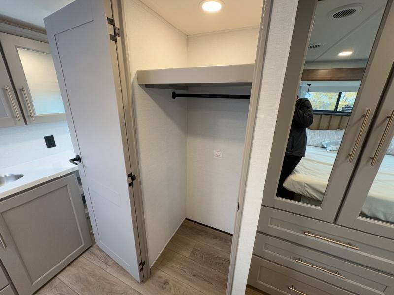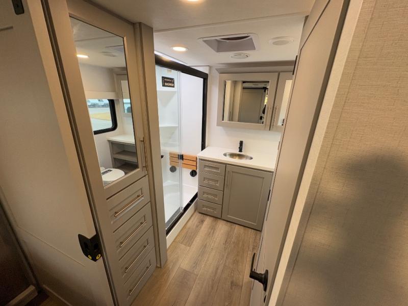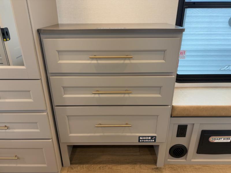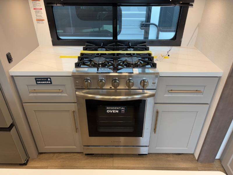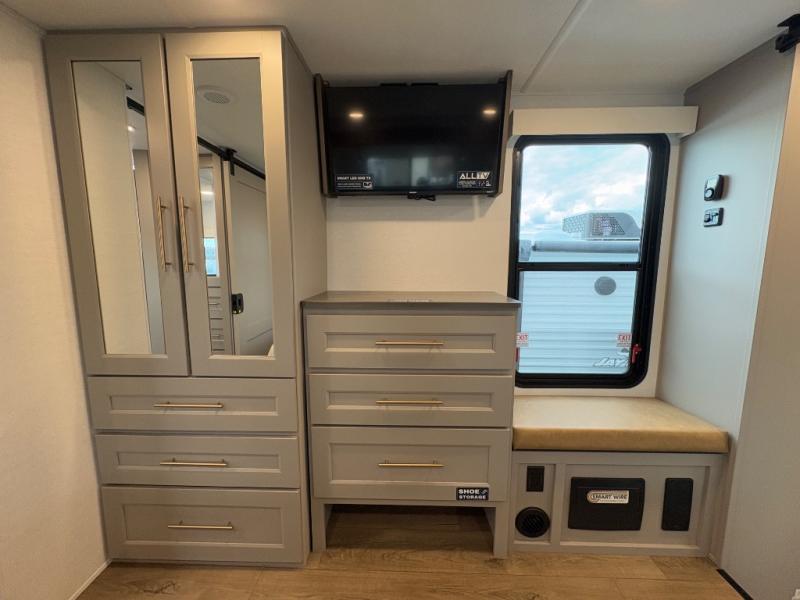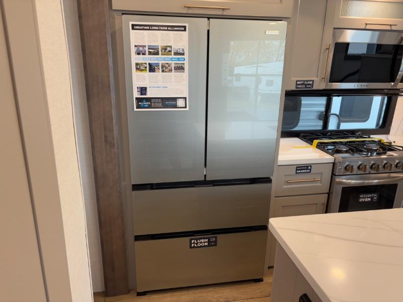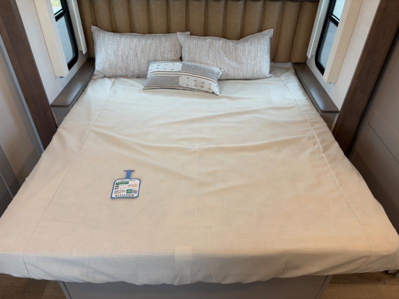 The Paradigm fifth wheels by Alliance RV are functional, high-quality, and luxurious for an unforgettable camping experience. There are three A/C units and a 40K BTU furnace to keep you comfortable year around, and you'll appreciate additional convenient amenities, like the all-in-one enclosed/heated utility center and the color coded and numbered wiring. A Helux Series coil spring pin box comes standard for hassle-free towing, along with Super-G 4,400 lb. rated tires and Dexter 7,000 lb. axles. You'll love the kitchen with its LG solid surface countertops and Lusso range, plus there is LED motion lighting in the pantry and a Maxx fan with a rain sensor to keep everything fresh when making dinner. Each model also includes an HD Smart TV in the living room and bedroom, plus a Winegard Air 360 antenna to keep you connected to the outside world. And of course there are a variety of options you can choose from to further customize your fifth wheel; dual pane windows, Super Solar Plus, slide out awning toppers, and generator prep or a generator to name a few!