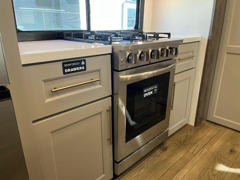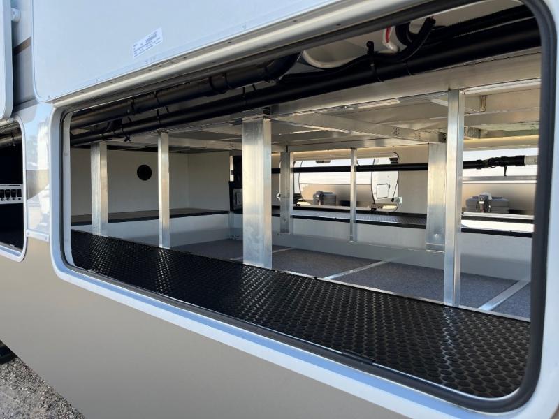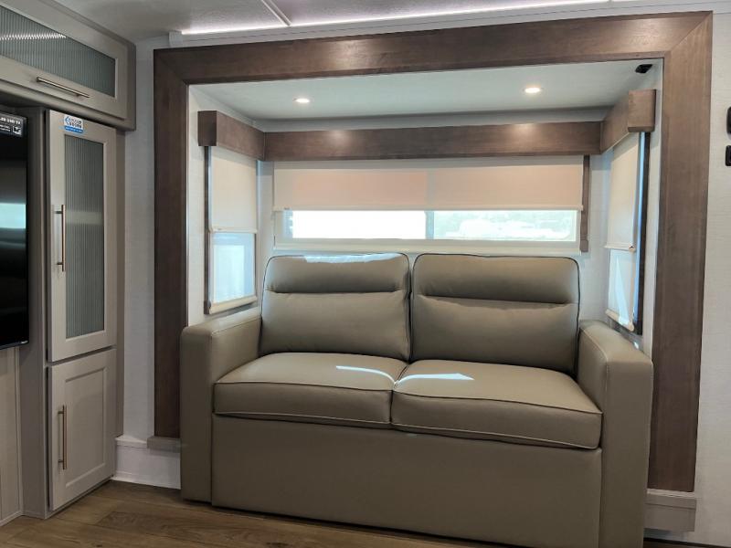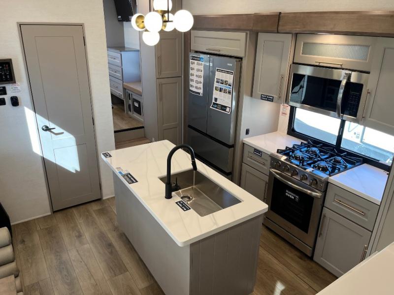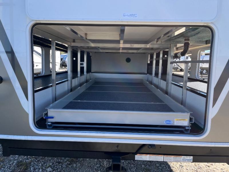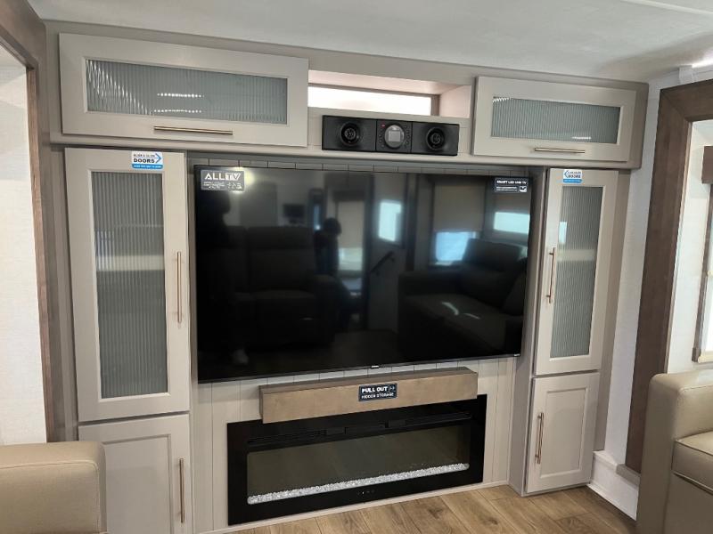 An active family will want this fifth wheel with its 48" x 115" exterior basement pull-out tray for kayaks or extra storage. Just above this area is the master suite with a rear bathroom that offers a residential shower, a porcelain toilet with soft close seat, plus a wardrobe and shelf storage. The king bed slide gives you more floor space, and you will have a seat, a flip-top dresser, and a Smart TV to watch movies in bed. The half bath is next to the main entry which is super convenient, and the middle kitchen is separate from the front living area. The cook will love the residential microwave, range and oven, plus the 19 cu. ft. 12 volt residential refrigerator. There is also a pantry and extra counter space on the kitchen island with a large sink. The views out of the atrium windows in the slide out, which includes the swivel table and desk, are a must see. And when you need to watch the big game, the 55" Smart TV with a pull-out fireplace storage are up front with the dual recliner love seat and two sleeper sofas.