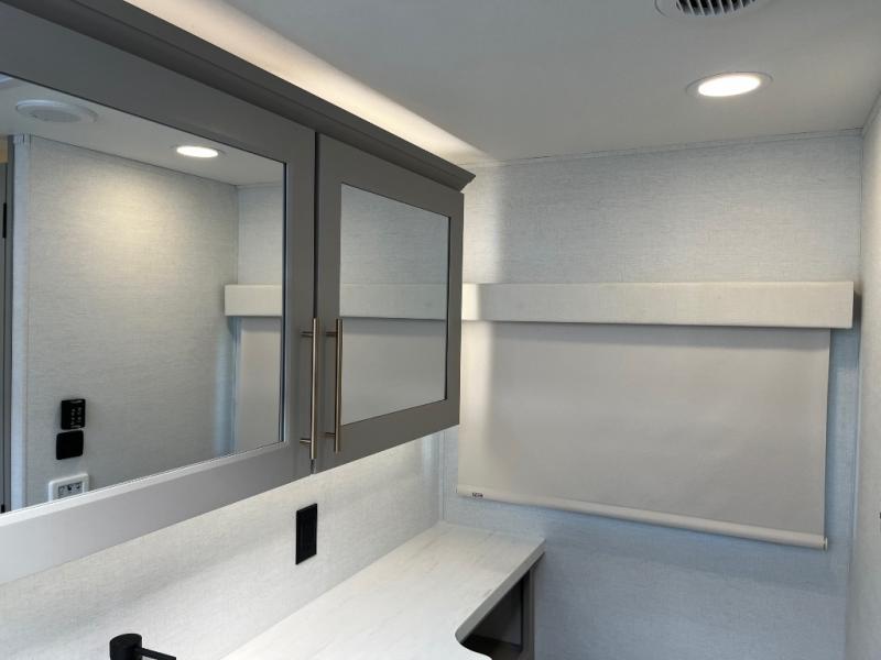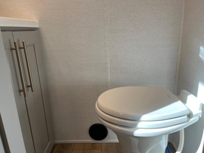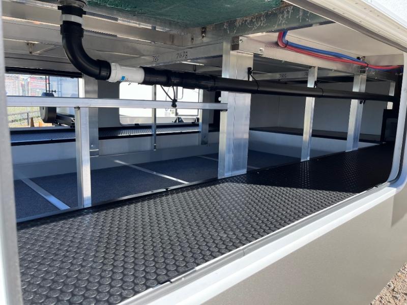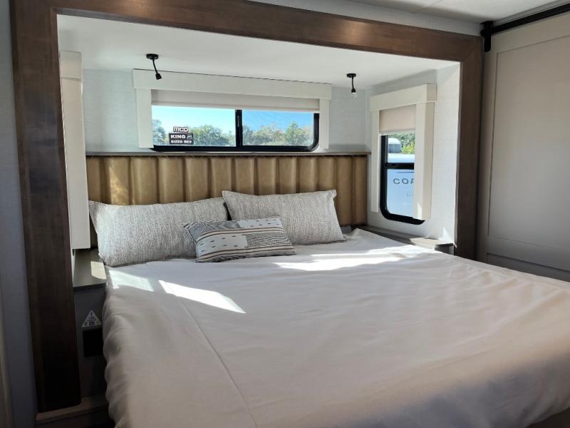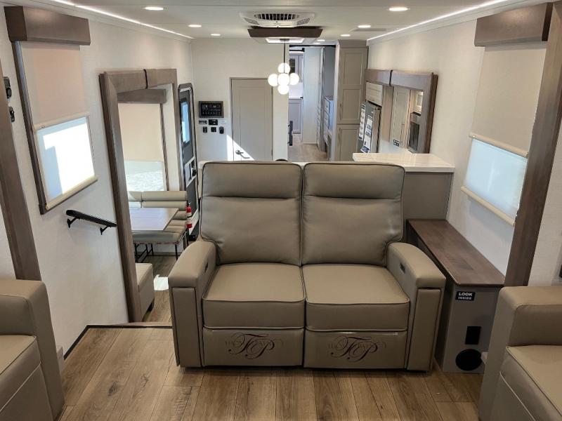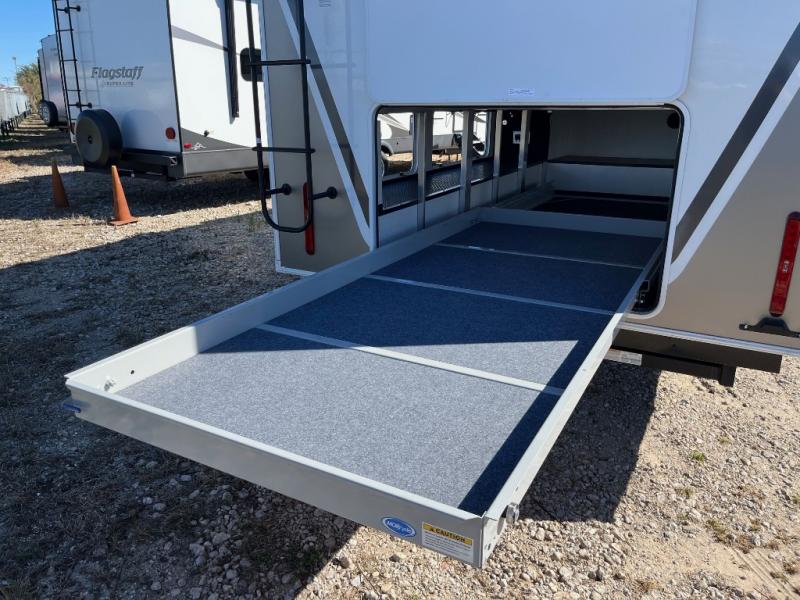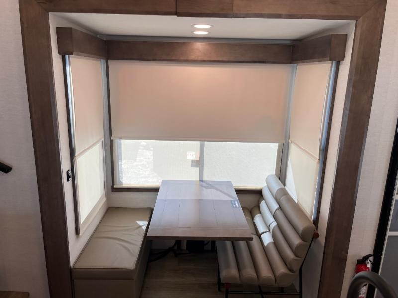 An active family will want this fifth wheel with its 48" x 115" exterior basement pull-out tray for kayaks or extra storage. Just above this area is the master suite with a rear bathroom that offers a residential shower, a porcelain toilet with soft close seat, plus a wardrobe and shelf storage. The king bed slide gives you more floor space, and you will have a seat, a flip-top dresser, and a Smart TV to watch movies in bed. The half bath is next to the main entry which is super convenient, and the middle kitchen is separate from the front living area. The cook will love the residential microwave, range and oven, plus the 19 cu. ft. 12 volt residential refrigerator. There is also a pantry and extra counter space on the kitchen island with a large sink. The views out of the atrium windows in the slide out, which includes the swivel table and desk, are a must see. And when you need to watch the big game, the 55" Smart TV with a pull-out fireplace storage are up front with the dual recliner love seat and two sleeper sofas.
