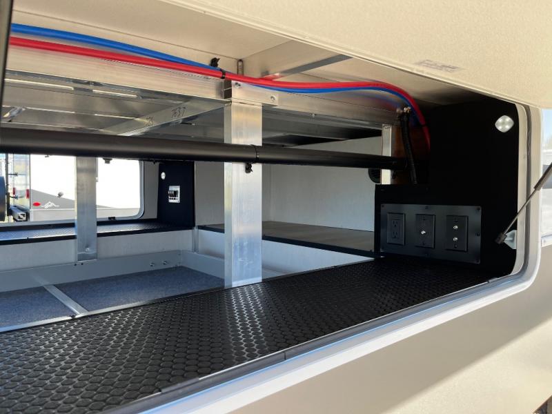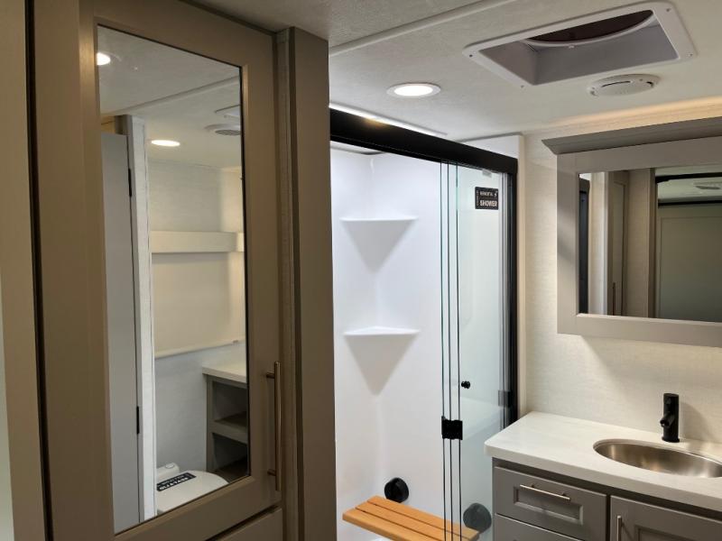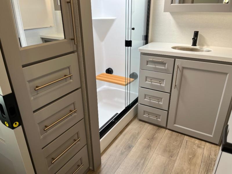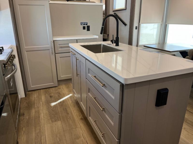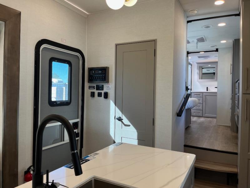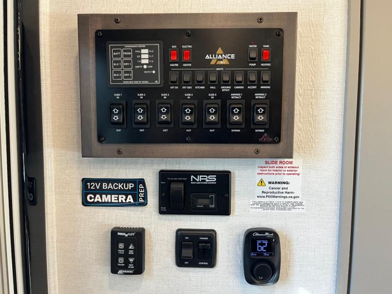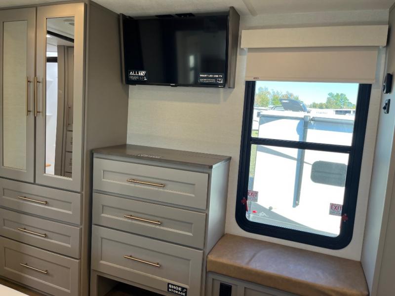 The Paradigm fifth wheels by Alliance RV are functional, high-quality, and luxurious for an unforgettable camping experience. There are three A/C units and a 40K BTU furnace to keep you comfortable year around, and you'll appreciate additional convenient amenities, like the all-in-one enclosed/heated utility center and the color coded and numbered wiring. A Helux Series coil spring pin box comes standard for hassle-free towing, along with Super-G 4,400 lb. rated tires and Dexter 7,000 lb. axles. You'll love the kitchen with its LG solid surface countertops and Lusso range, plus there is LED motion lighting in the pantry and a Maxx fan with a rain sensor to keep everything fresh when making dinner. Each model also includes an HD Smart TV in the living room and bedroom, plus a Winegard Air 360 antenna to keep you connected to the outside world. And of course there are a variety of options you can choose from to further customize your fifth wheel; dual pane windows, Super Solar Plus, slide out awning toppers, and generator prep or a generator to name a few!