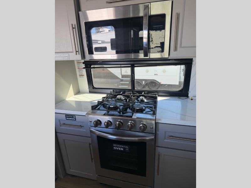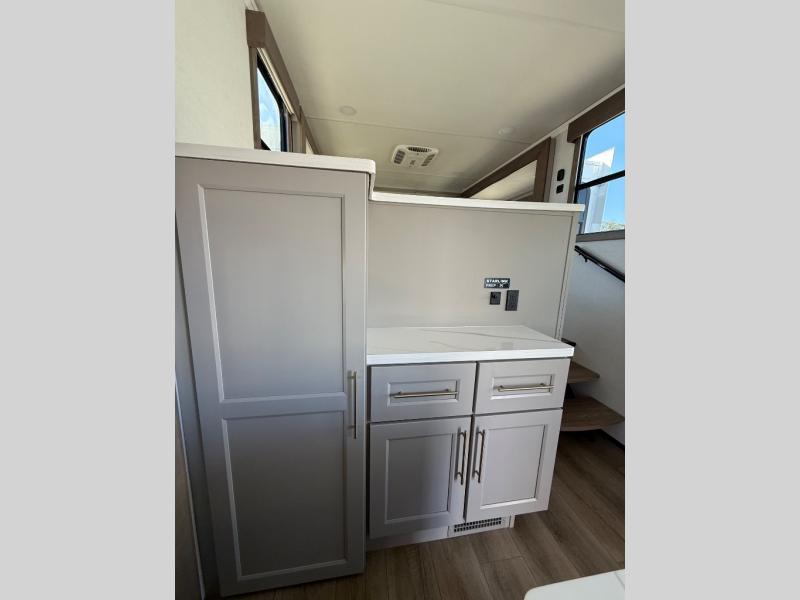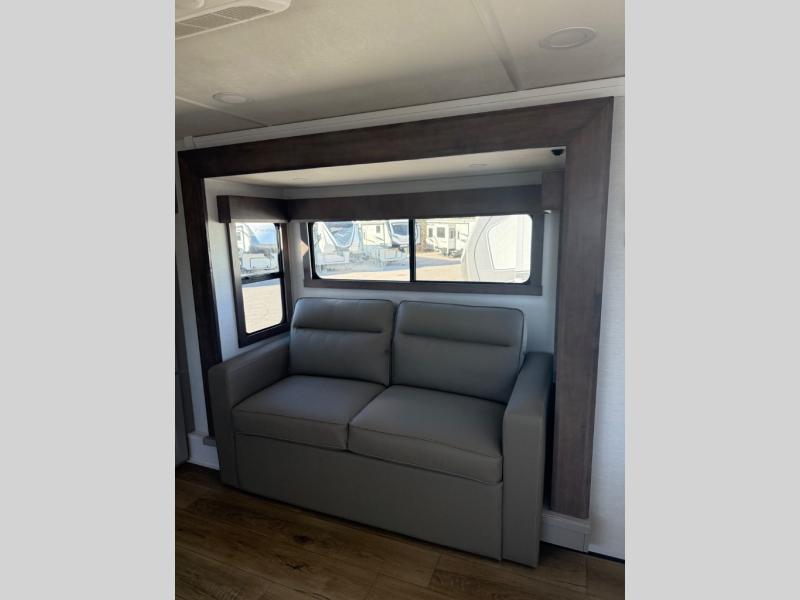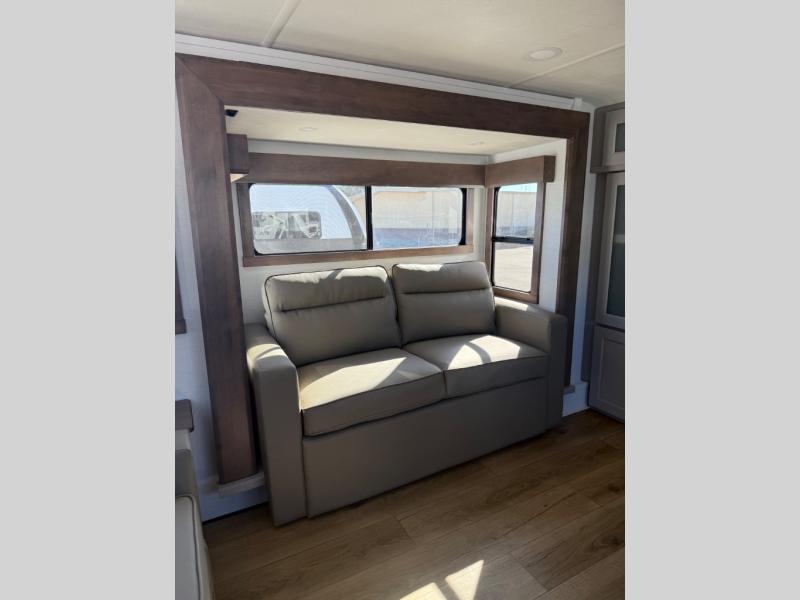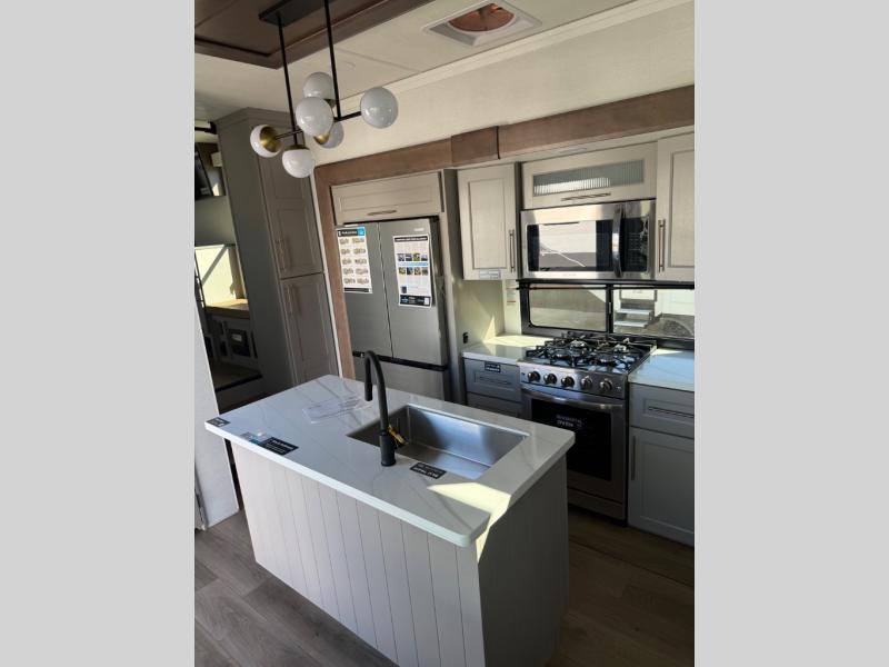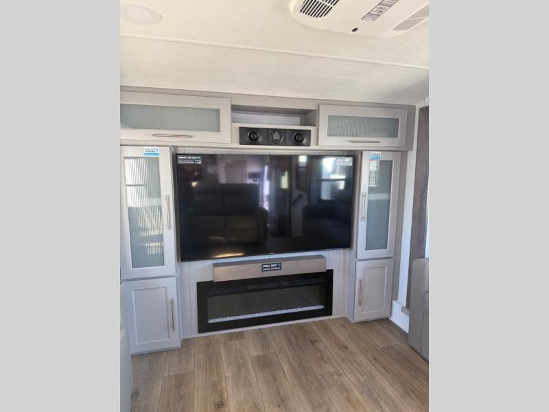 An active family will want this fifth wheel with its 48" x 115" exterior basement pull-out tray for kayaks or extra storage. Just above this area is the master suite with a rear bathroom that offers a residential shower, a porcelain toilet with soft close seat, plus a wardrobe and shelf storage. The king bed slide gives you more floor space, and you will have a seat, a flip-top dresser, and a Smart TV to watch movies in bed. The half bath is next to the main entry which is super convenient, and the middle kitchen is separate from the front living area. The cook will love the residential microwave, range and oven, plus the 19 cu. ft. 12 volt residential refrigerator. There is also a pantry and extra counter space on the kitchen island with a large sink. The views out of the atrium windows in the slide out, which includes the swivel table and desk, are a must see. And when you need to watch the big game, the 55" Smart TV with a pull-out fireplace storage are up front with the dual recliner love seat and two sleeper sofas.