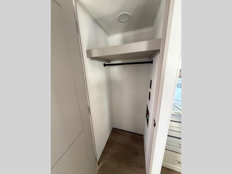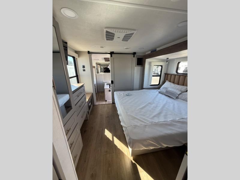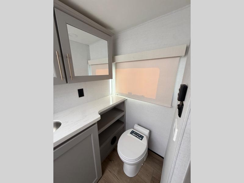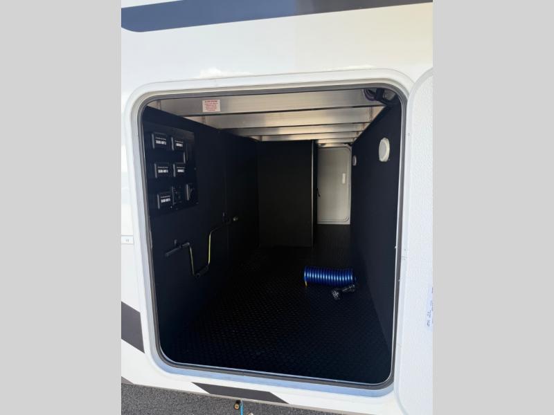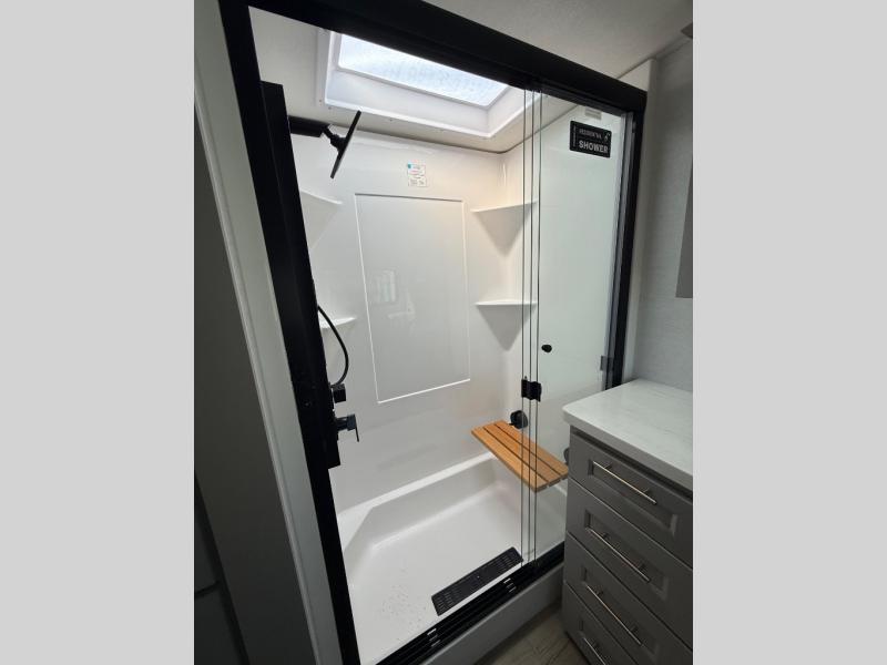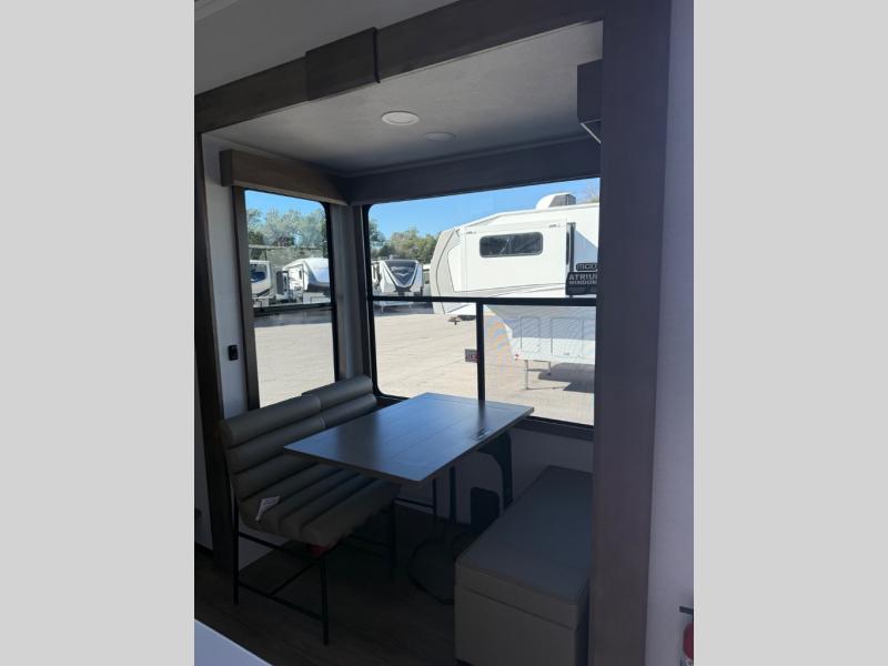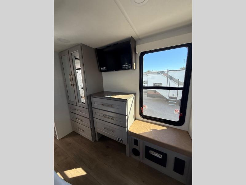 An active family will want this fifth wheel with its 48" x 115" exterior basement pull-out tray for kayaks or extra storage. Just above this area is the master suite with a rear bathroom that offers a residential shower, a porcelain toilet with soft close seat, plus a wardrobe and shelf storage. The king bed slide gives you more floor space, and you will have a seat, a flip-top dresser, and a Smart TV to watch movies in bed. The half bath is next to the main entry which is super convenient, and the middle kitchen is separate from the front living area. The cook will love the residential microwave, range and oven, plus the 19 cu. ft. 12 volt residential refrigerator. There is also a pantry and extra counter space on the kitchen island with a large sink. The views out of the atrium windows in the slide out, which includes the swivel table and desk, are a must see. And when you need to watch the big game, the 55" Smart TV with a pull-out fireplace storage are up front with the dual recliner love seat and two sleeper sofas.