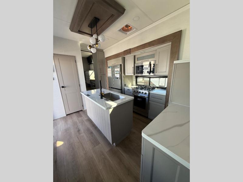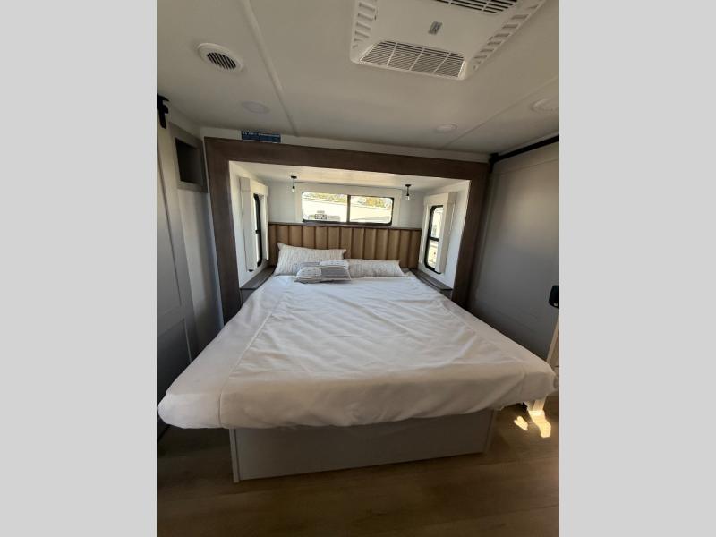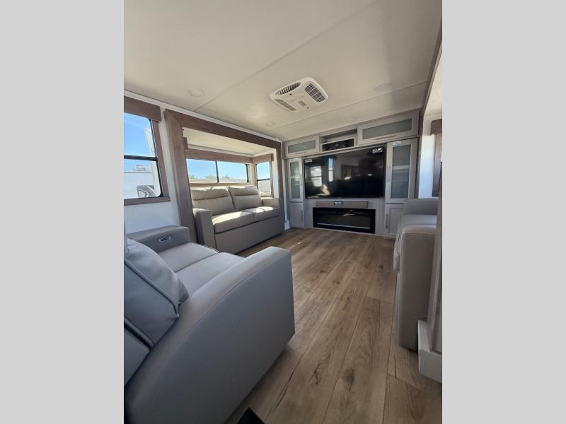 The Paradigm fifth wheels by Alliance RV are functional, high-quality, and luxurious for an unforgettable camping experience. There are three A/C units and a 40K BTU furnace to keep you comfortable year around, and you'll appreciate additional convenient amenities, like the all-in-one enclosed/heated utility center and the color coded and numbered wiring. A Helux Series coil spring pin box comes standard for hassle-free towing, along with Super-G 4,400 lb. rated tires and Dexter 7,000 lb. axles. You'll love the kitchen with its LG solid surface countertops and Lusso range, plus there is LED motion lighting in the pantry and a Maxx fan with a rain sensor to keep everything fresh when making dinner. Each model also includes an HD Smart TV in the living room and bedroom, plus a Winegard Air 360 antenna to keep you connected to the outside world. And of course there are a variety of options you can choose from to further customize your fifth wheel; dual pane windows, Super Solar Plus, slide out awning toppers, and generator prep or a generator to name a few!