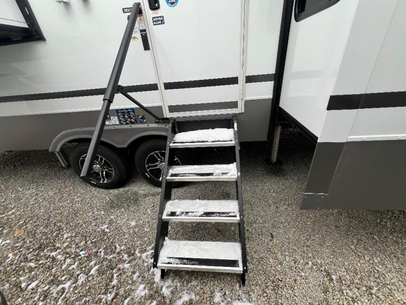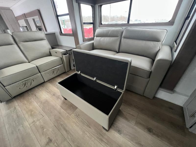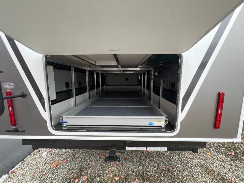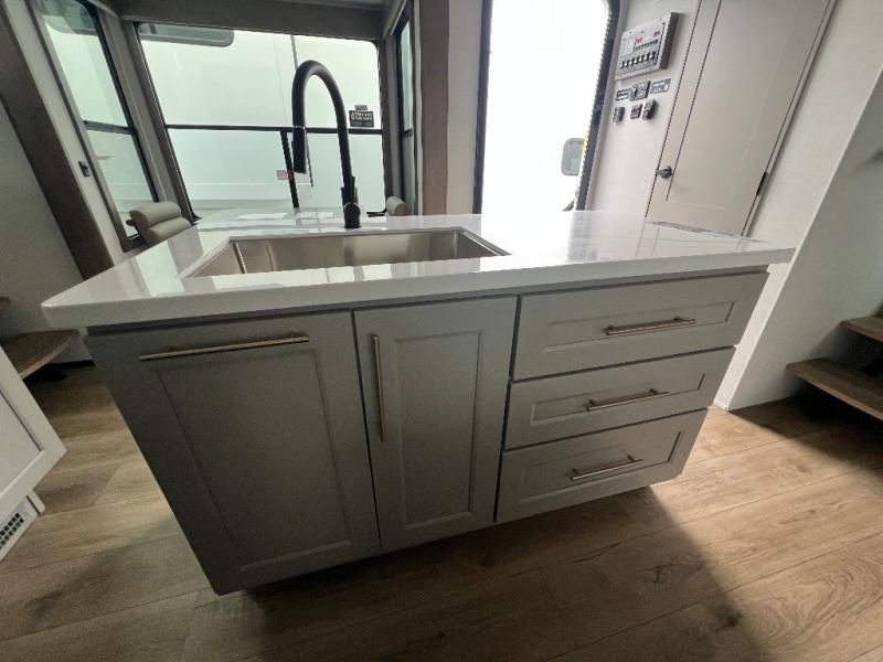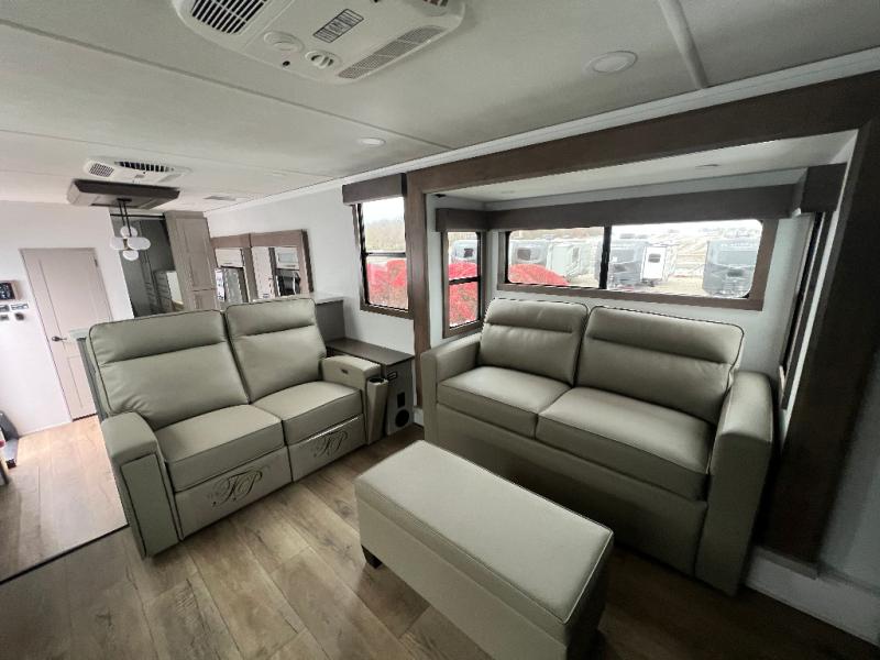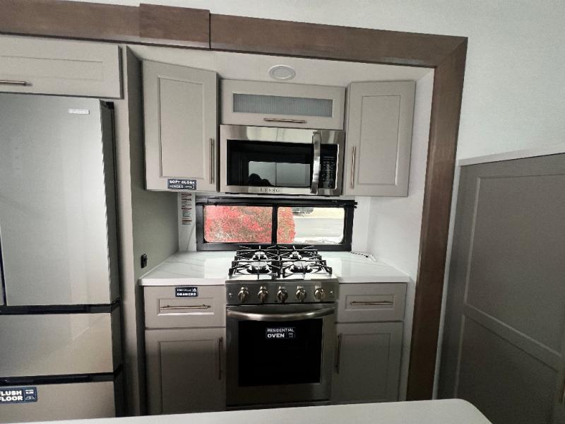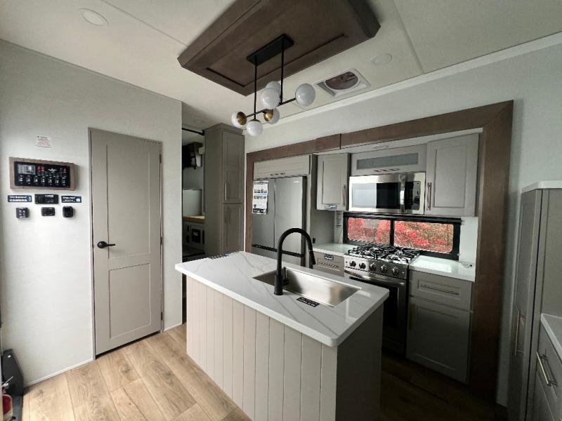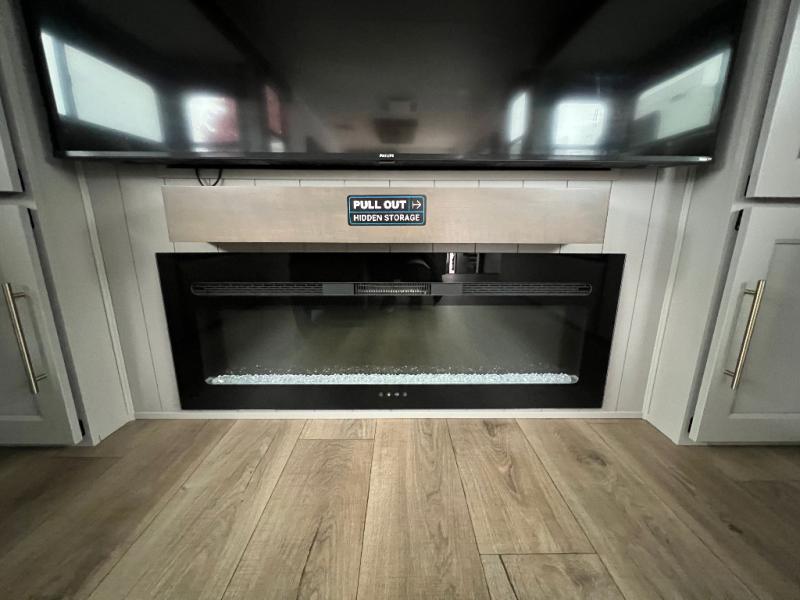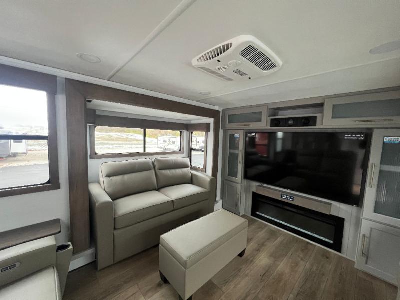 An active family will want this fifth wheel with its 48" x 115" exterior basement pull-out tray for kayaks or extra storage. Just above this area is the master suite with a rear bathroom that offers a residential shower, a porcelain toilet with soft close seat, plus a wardrobe and shelf storage. The king bed slide gives you more floor space, and you will have a seat, a flip-top dresser, and a Smart TV to watch movies in bed. The half bath is next to the main entry which is super convenient, and the middle kitchen is separate from the front living area. The cook will love the residential microwave, range and oven, plus the 19 cu. ft. 12 volt residential refrigerator. There is also a pantry and extra counter space on the kitchen island with a large sink. The views out of the atrium windows in the slide out, which includes the swivel table and desk, are a must see. And when you need to watch the big game, the 55" Smart TV with a pull-out fireplace storage are up front with the dual recliner love seat and two sleeper sofas.