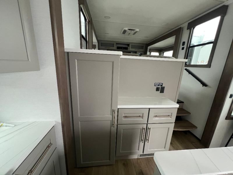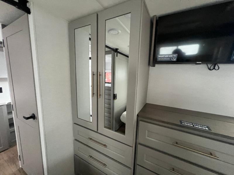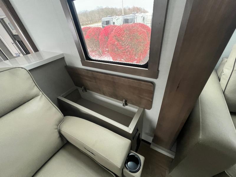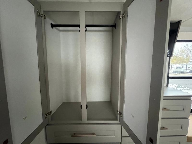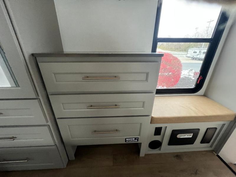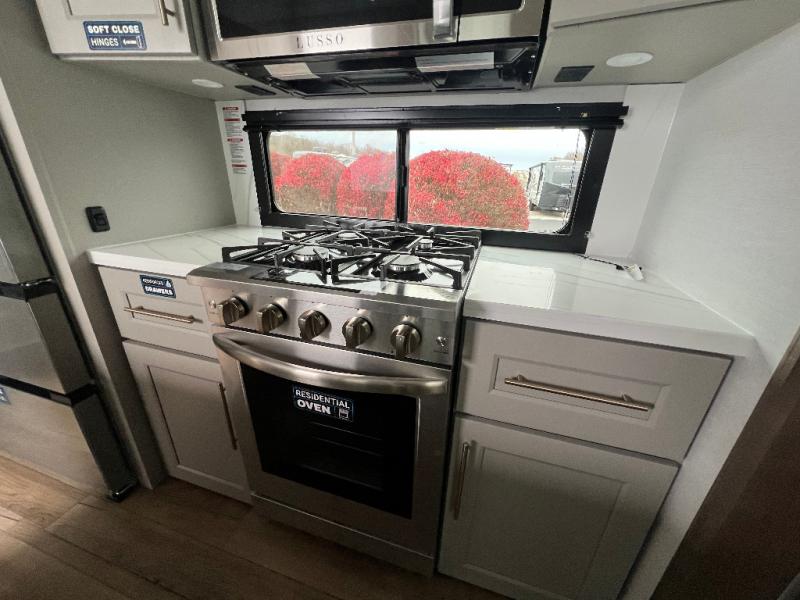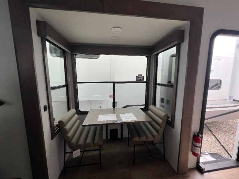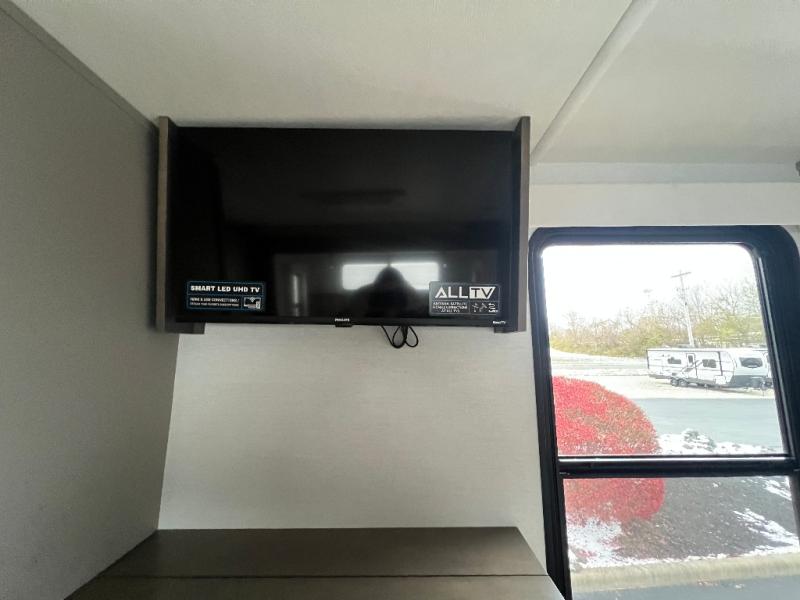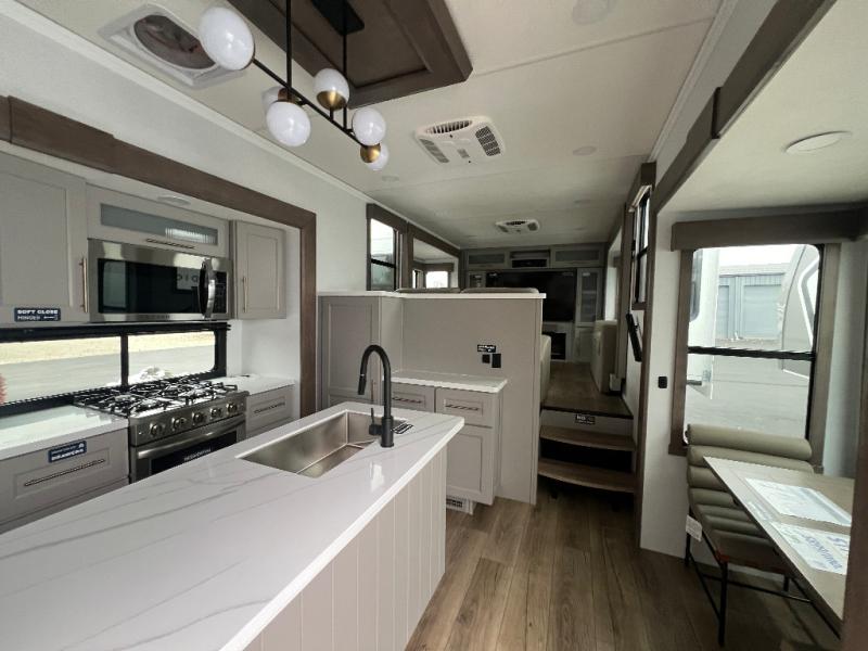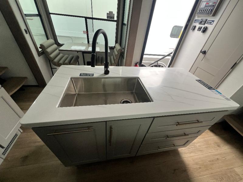 An active family will want this fifth wheel with its 48" x 115" exterior basement pull-out tray for kayaks or extra storage. Just above this area is the master suite with a rear bathroom that offers a residential shower, a porcelain toilet with soft close seat, plus a wardrobe and shelf storage. The king bed slide gives you more floor space, and you will have a seat, a flip-top dresser, and a Smart TV to watch movies in bed. The half bath is next to the main entry which is super convenient, and the middle kitchen is separate from the front living area. The cook will love the residential microwave, range and oven, plus the 19 cu. ft. 12 volt residential refrigerator. There is also a pantry and extra counter space on the kitchen island with a large sink. The views out of the atrium windows in the slide out, which includes the swivel table and desk, are a must see. And when you need to watch the big game, the 55" Smart TV with a pull-out fireplace storage are up front with the dual recliner love seat and two sleeper sofas.