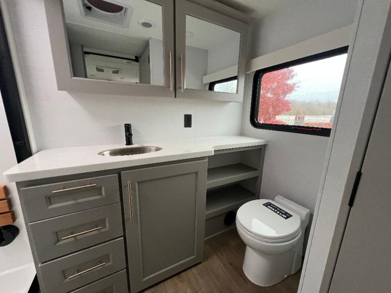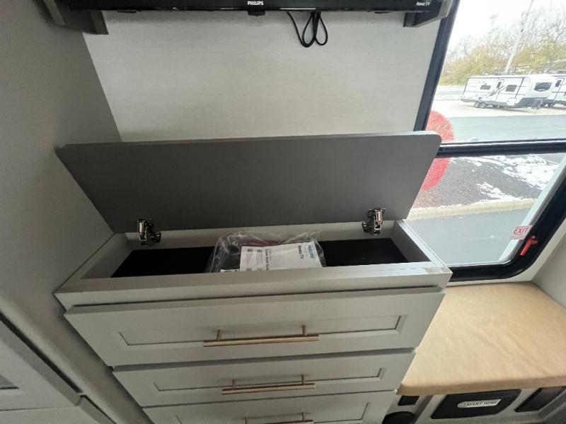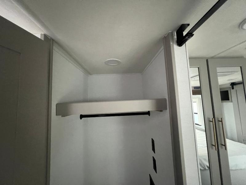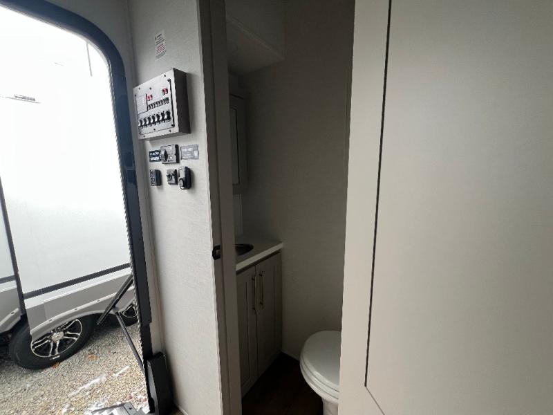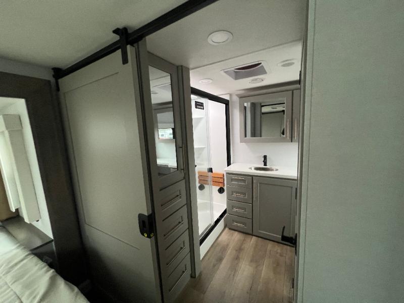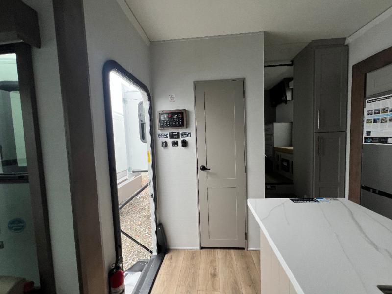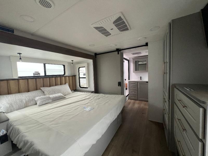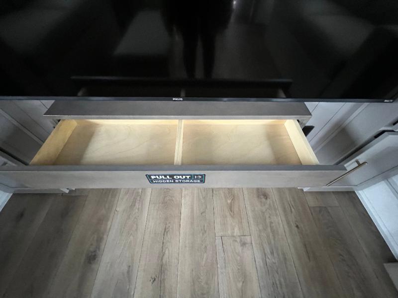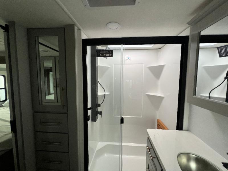 An active family will want this fifth wheel with its 48" x 115" exterior basement pull-out tray for kayaks or extra storage. Just above this area is the master suite with a rear bathroom that offers a residential shower, a porcelain toilet with soft close seat, plus a wardrobe and shelf storage. The king bed slide gives you more floor space, and you will have a seat, a flip-top dresser, and a Smart TV to watch movies in bed. The half bath is next to the main entry which is super convenient, and the middle kitchen is separate from the front living area. The cook will love the residential microwave, range and oven, plus the 19 cu. ft. 12 volt residential refrigerator. There is also a pantry and extra counter space on the kitchen island with a large sink. The views out of the atrium windows in the slide out, which includes the swivel table and desk, are a must see. And when you need to watch the big game, the 55" Smart TV with a pull-out fireplace storage are up front with the dual recliner love seat and two sleeper sofas.