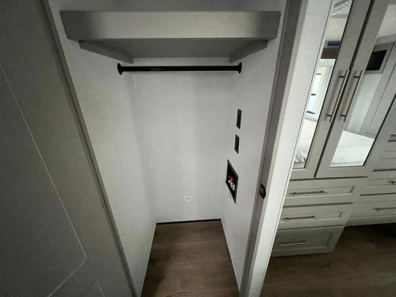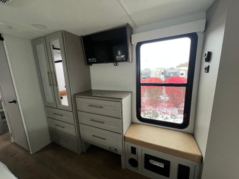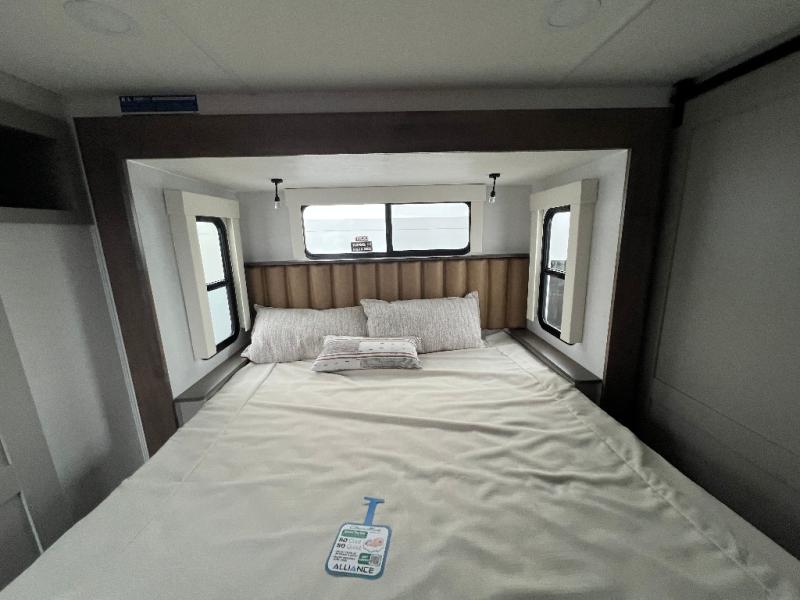 The Paradigm fifth wheels by Alliance RV are functional, high-quality, and luxurious for an unforgettable camping experience. There are three A/C units and a 40K BTU furnace to keep you comfortable year around, and you'll appreciate additional convenient amenities, like the all-in-one enclosed/heated utility center and the color coded and numbered wiring. A Helux Series coil spring pin box comes standard for hassle-free towing, along with Curt 8,000 lb. axles. You'll love the kitchen with its LG solid surface countertops and Lusso range, plus there is LED motion lighting in the pantry and a Maxx fan with a rain sensor to keep everything fresh when making dinner. Each model also includes an HD Smart TV in the living room and bedroom. And of course there are a variety of options you can choose from to further customize your fifth wheel; dual pane windows, Super Solar Plus, slide out awning toppers, and generator prep or a generator to name a few!