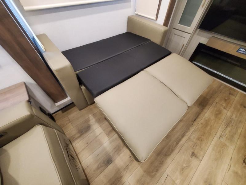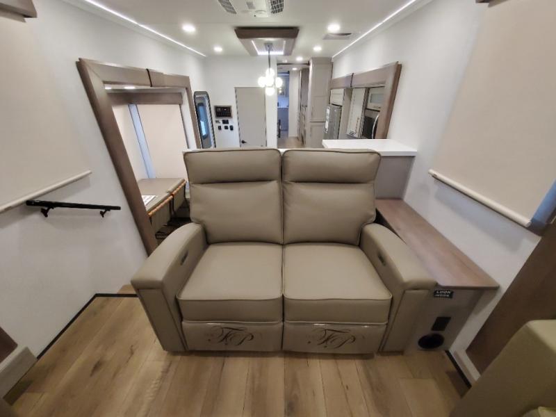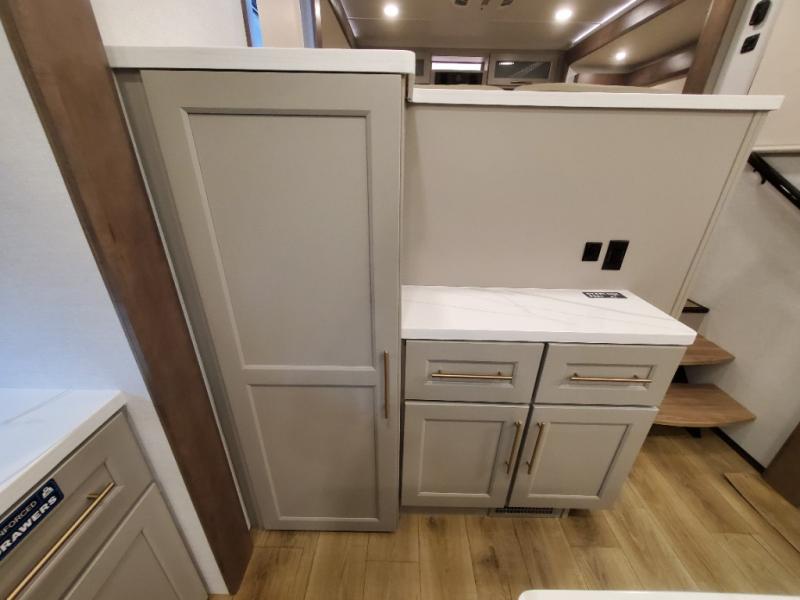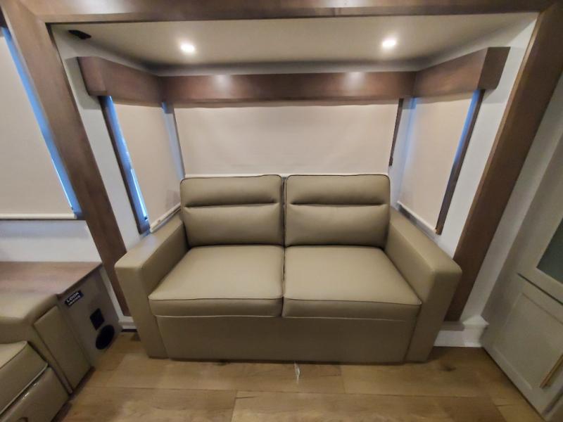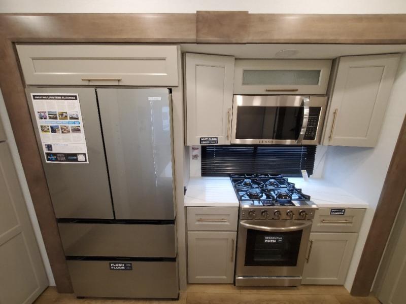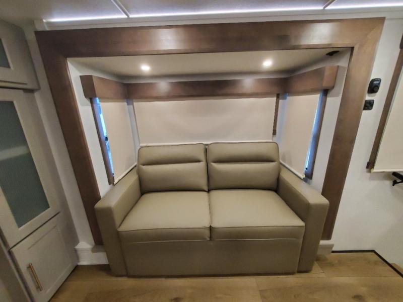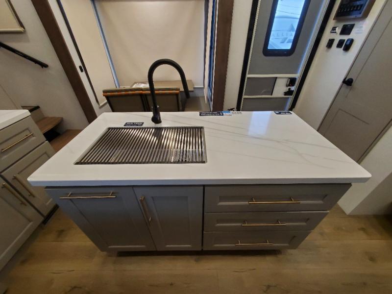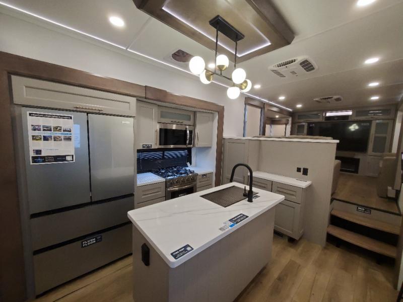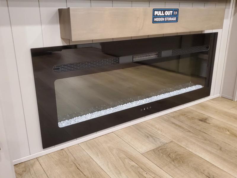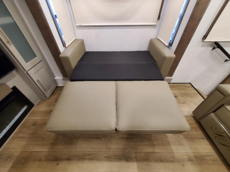 An active family will want this fifth wheel with its 48" x 115" exterior basement pull-out tray for kayaks or extra storage. Just above this area is the master suite with a rear bathroom that offers a residential shower, a porcelain toilet with soft close seat, plus a wardrobe and shelf storage. The king bed slide gives you more floor space, and you will have a seat, a flip-top dresser, and a Smart TV to watch movies in bed. The half bath is next to the main entry which is super convenient, and the middle kitchen is separate from the front living area. The cook will love the residential microwave, range and oven, plus the 19 cu. ft. 12 volt residential refrigerator. There is also a pantry and extra counter space on the kitchen island with a large sink. The views out of the atrium windows in the slide out, which includes the swivel table and desk, are a must see. And when you need to watch the big game, the 55" Smart TV with a pull-out fireplace storage are up front with the dual recliner love seat and two sleeper sofas.