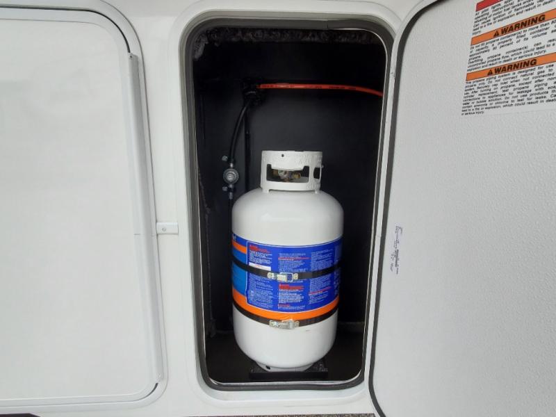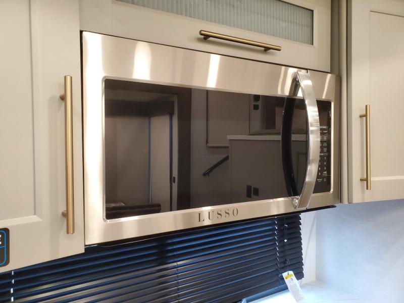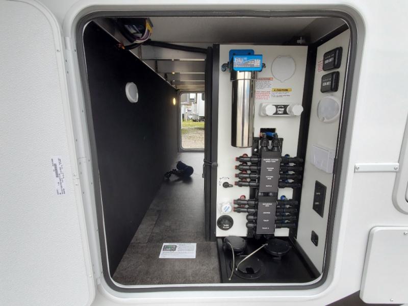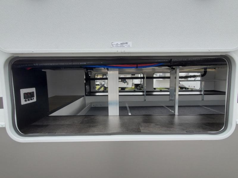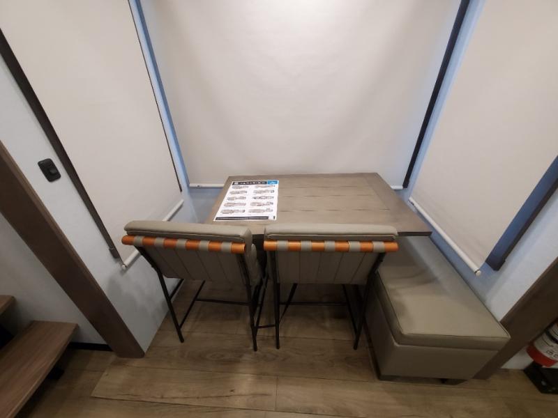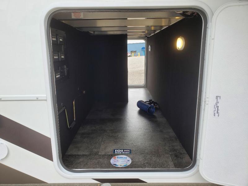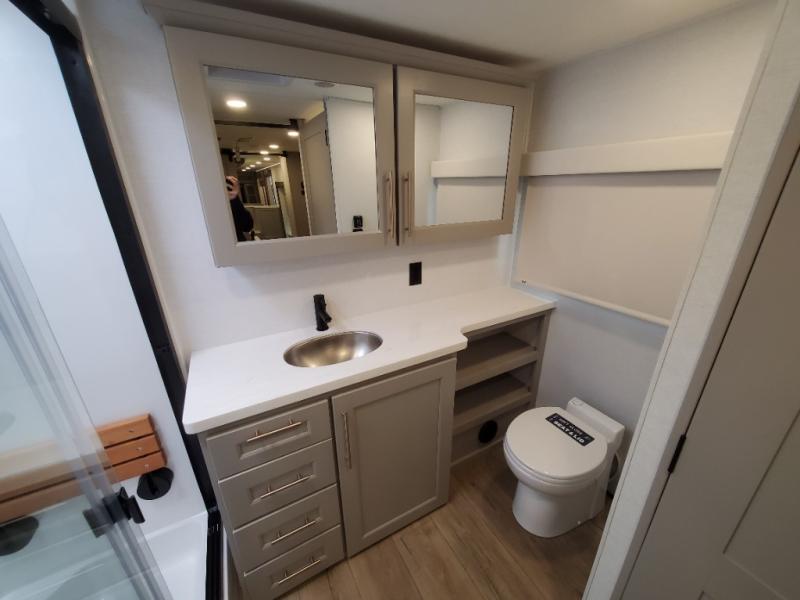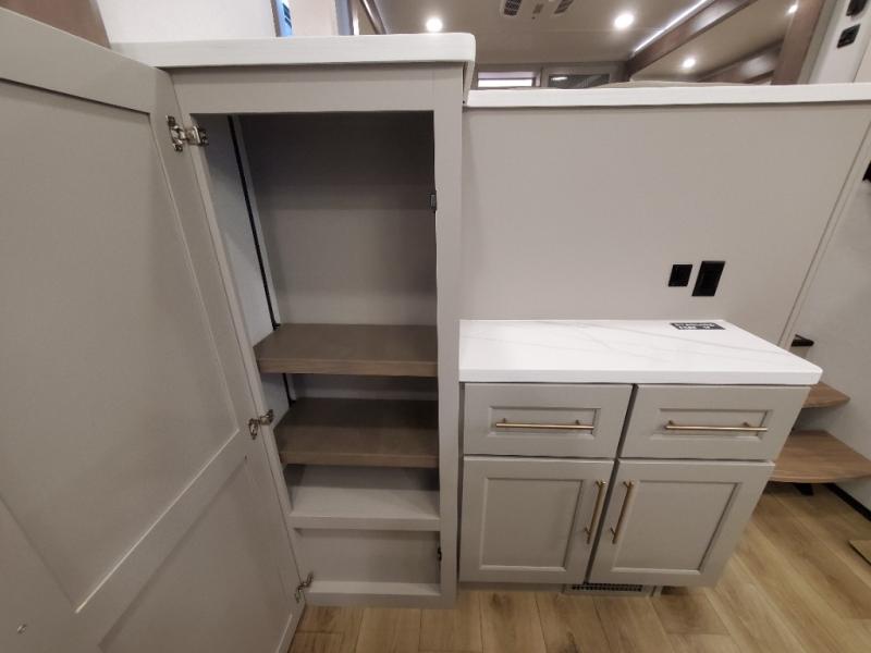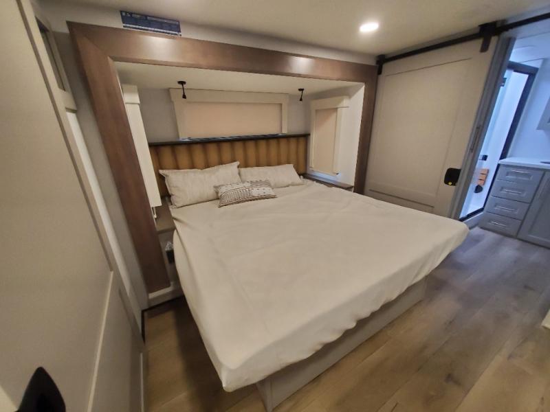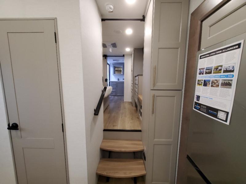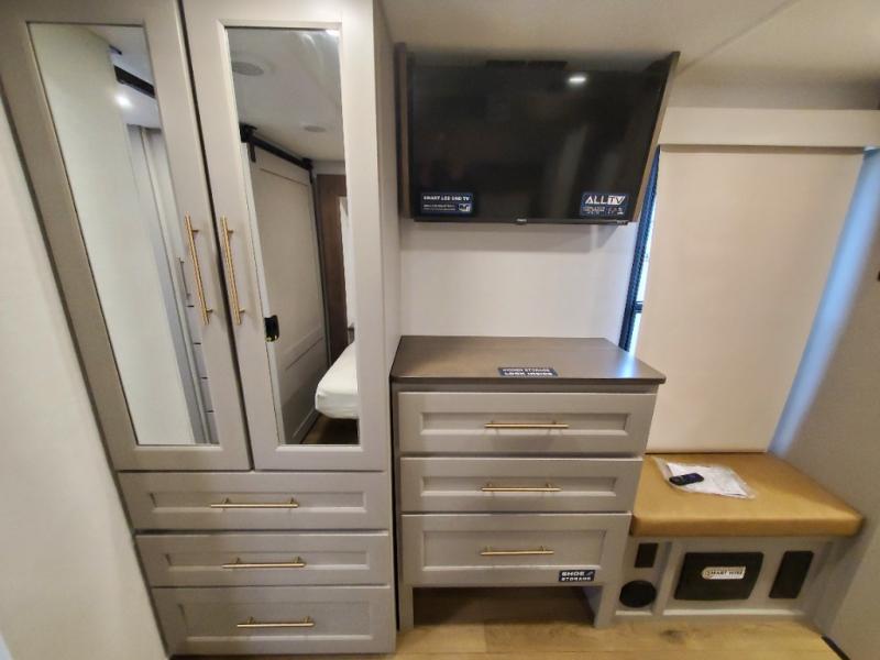 An active family will want this fifth wheel with its 48" x 115" exterior basement pull-out tray for kayaks or extra storage. Just above this area is the master suite with a rear bathroom that offers a residential shower, a porcelain toilet with soft close seat, plus a wardrobe and shelf storage. The king bed slide gives you more floor space, and you will have a seat, a flip-top dresser, and a Smart TV to watch movies in bed. The half bath is next to the main entry which is super convenient, and the middle kitchen is separate from the front living area. The cook will love the residential microwave, range and oven, plus the 19 cu. ft. 12 volt residential refrigerator. There is also a pantry and extra counter space on the kitchen island with a large sink. The views out of the atrium windows in the slide out, which includes the swivel table and desk, are a must see. And when you need to watch the big game, the 55" Smart TV with a pull-out fireplace storage are up front with the dual recliner love seat and two sleeper sofas.