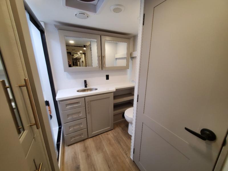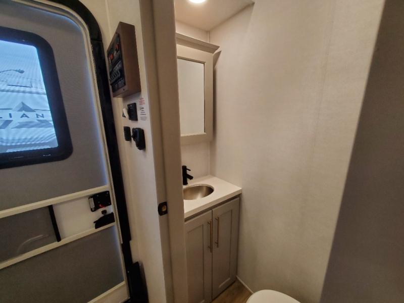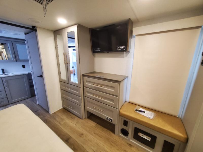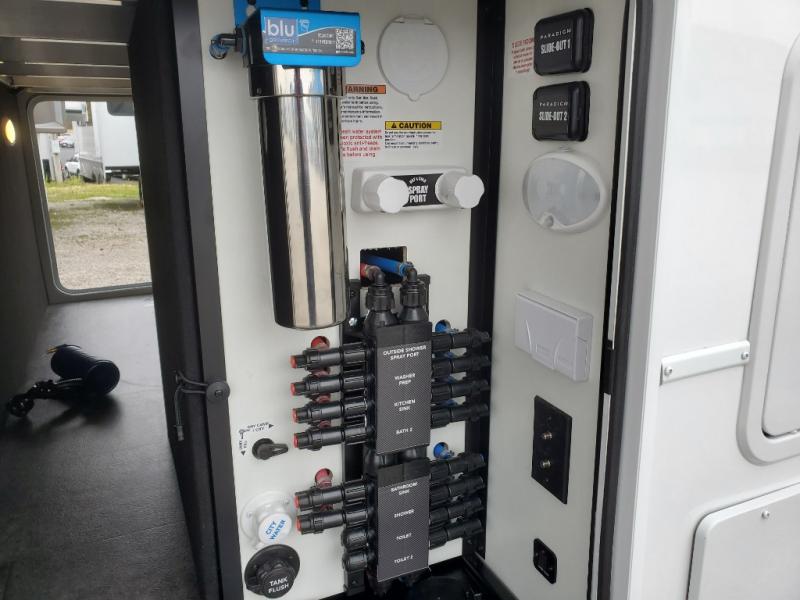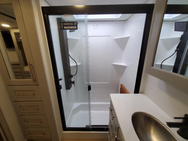 The Paradigm fifth wheels by Alliance RV are functional, high-quality, and luxurious for an unforgettable camping experience. There are three A/C units and a 40K BTU furnace to keep you comfortable year around, and you'll appreciate additional convenient amenities, like the all-in-one enclosed/heated utility center and the color coded and numbered wiring. A Helux Series coil spring pin box comes standard for hassle-free towing, along with Curt 8,000 lb. axles. You'll love the kitchen with its LG solid surface countertops and Lusso range, plus there is LED motion lighting in the pantry and a Maxx fan with a rain sensor to keep everything fresh when making dinner. Each model also includes an HD Smart TV in the living room and bedroom. And of course there are a variety of options you can choose from to further customize your fifth wheel; dual pane windows, Super Solar Plus, slide out awning toppers, and generator prep or a generator to name a few!