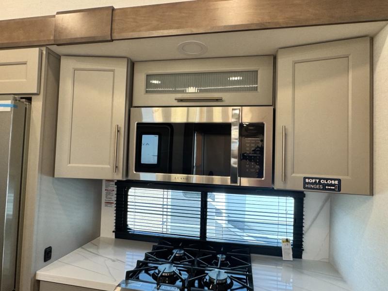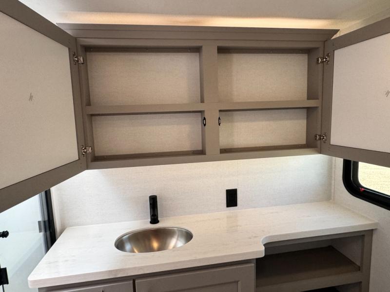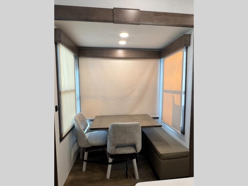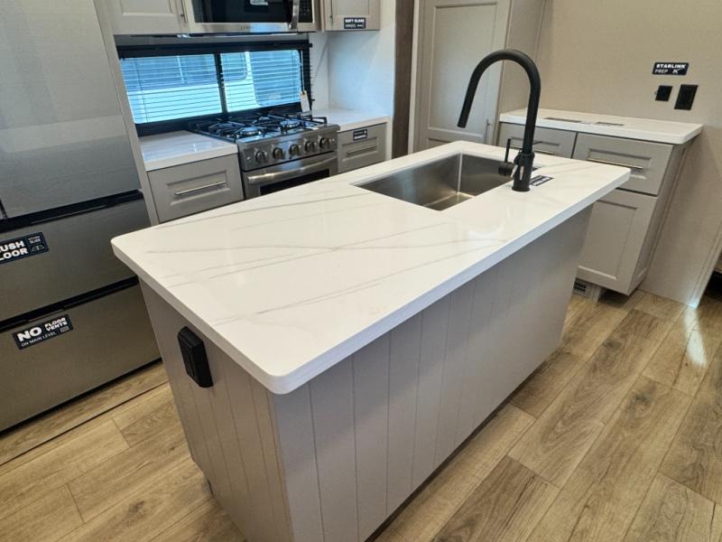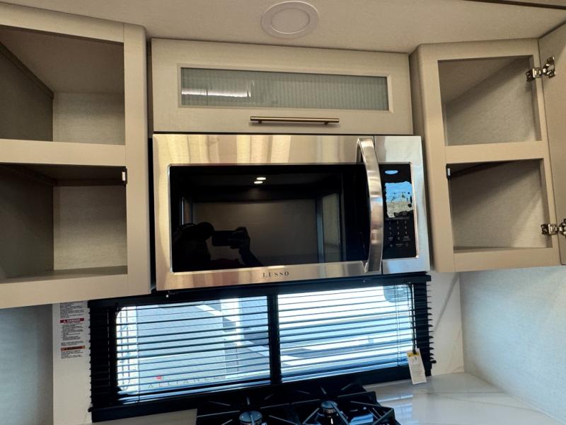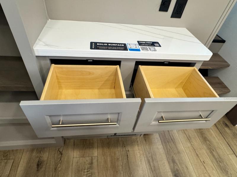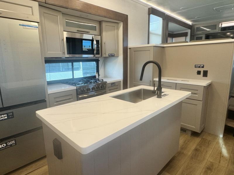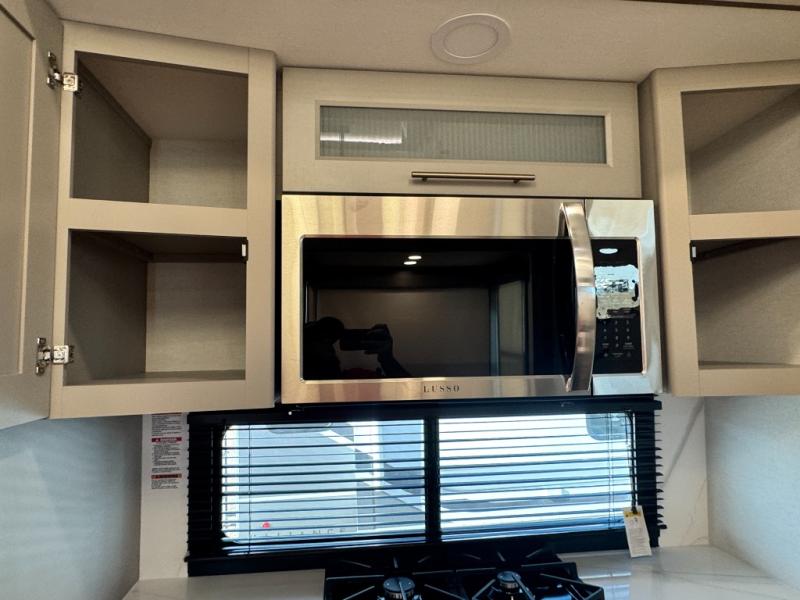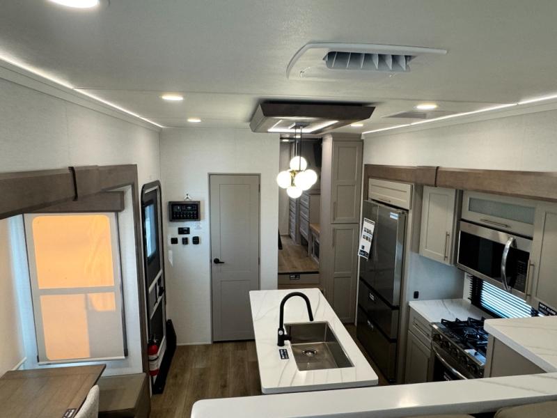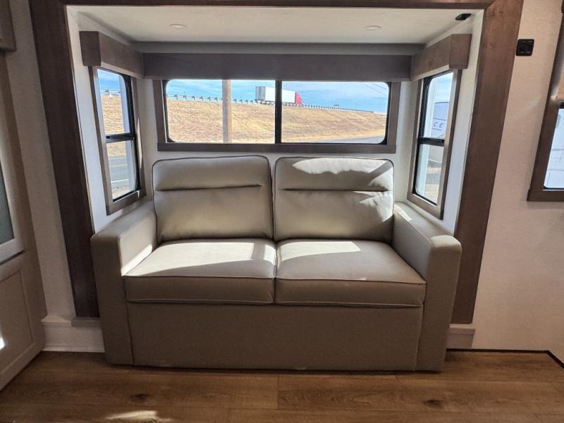 An active family will want this fifth wheel with its 48" x 115" exterior basement pull-out tray for kayaks or extra storage. Just above this area is the master suite with a rear bathroom that offers a residential shower, a porcelain toilet with soft close seat, plus a wardrobe and shelf storage. The king bed slide gives you more floor space, and you will have a seat, a flip-top dresser, and a Smart TV to watch movies in bed. The half bath is next to the main entry which is super convenient, and the middle kitchen is separate from the front living area. The cook will love the residential microwave, range and oven, plus the 19 cu. ft. 12 volt residential refrigerator. There is also a pantry and extra counter space on the kitchen island with a large sink. The views out of the atrium windows in the slide out, which includes the swivel table and desk, are a must see. And when you need to watch the big game, the 55" Smart TV with a pull-out fireplace storage are up front with the dual recliner love seat and two sleeper sofas.