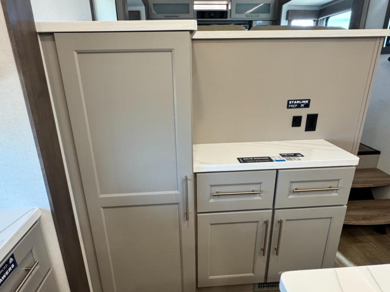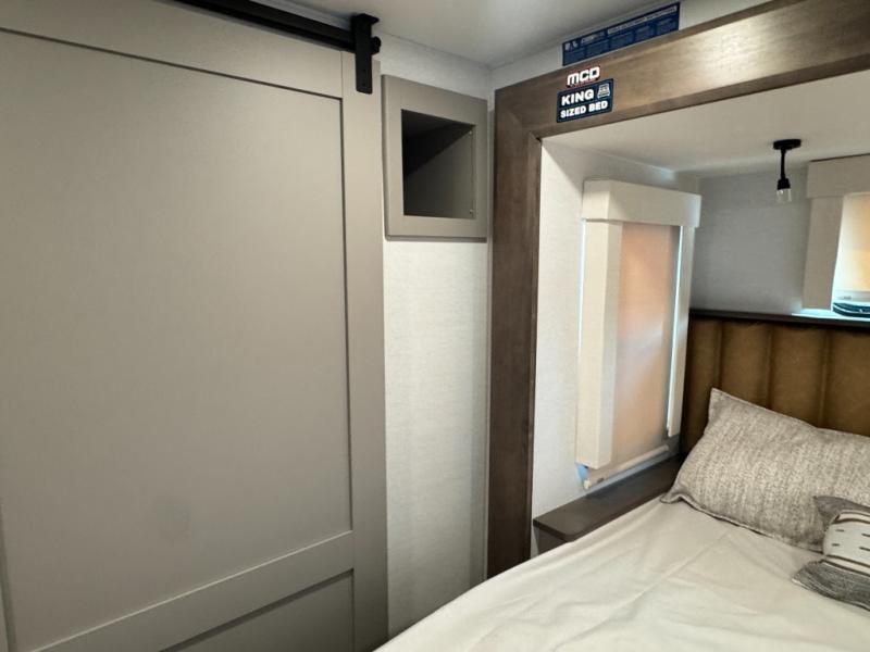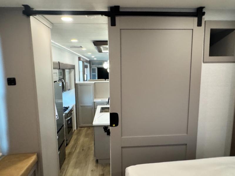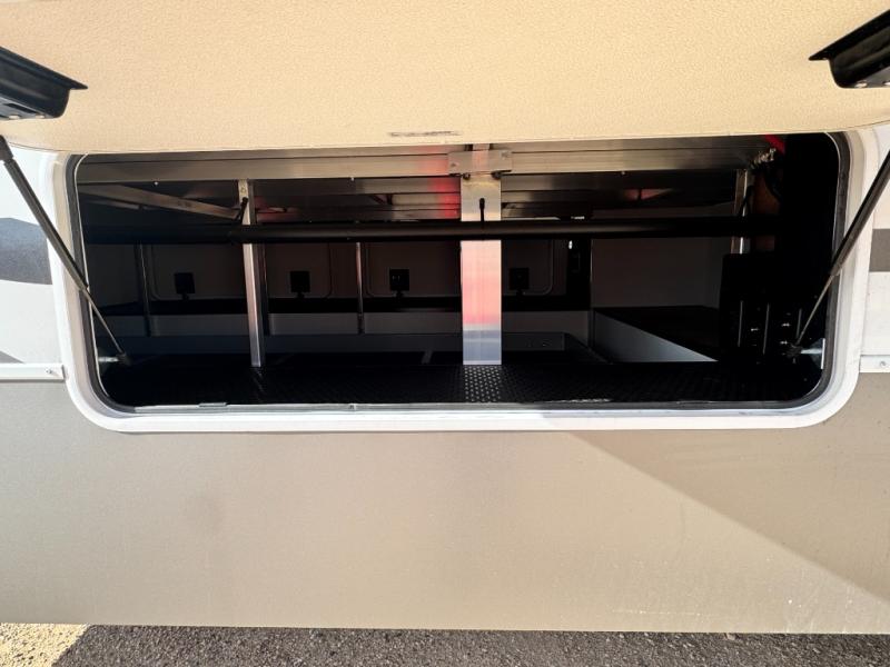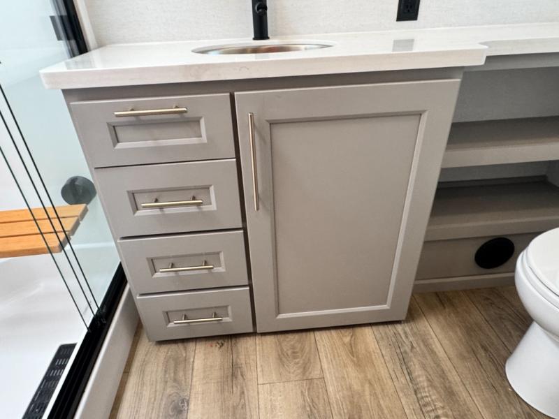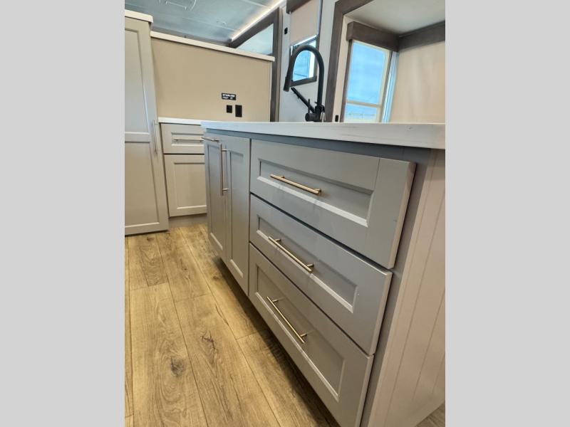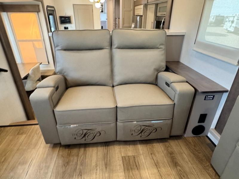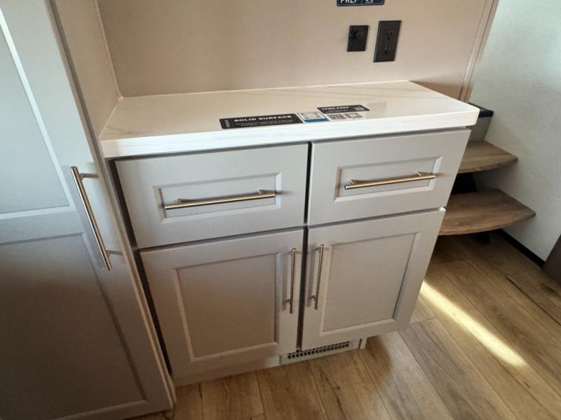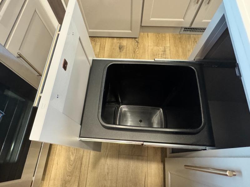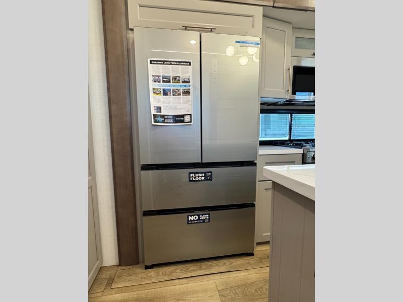 An active family will want this fifth wheel with its 48" x 115" exterior basement pull-out tray for kayaks or extra storage. Just above this area is the master suite with a rear bathroom that offers a residential shower, a porcelain toilet with soft close seat, plus a wardrobe and shelf storage. The king bed slide gives you more floor space, and you will have a seat, a flip-top dresser, and a Smart TV to watch movies in bed. The half bath is next to the main entry which is super convenient, and the middle kitchen is separate from the front living area. The cook will love the residential microwave, range and oven, plus the 19 cu. ft. 12 volt residential refrigerator. There is also a pantry and extra counter space on the kitchen island with a large sink. The views out of the atrium windows in the slide out, which includes the swivel table and desk, are a must see. And when you need to watch the big game, the 55" Smart TV with a pull-out fireplace storage are up front with the dual recliner love seat and two sleeper sofas.