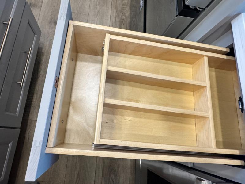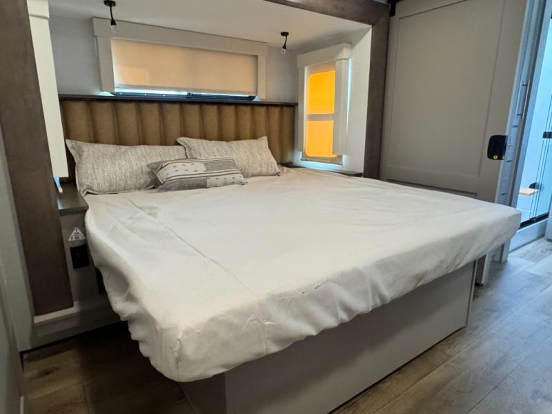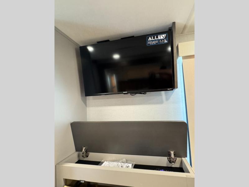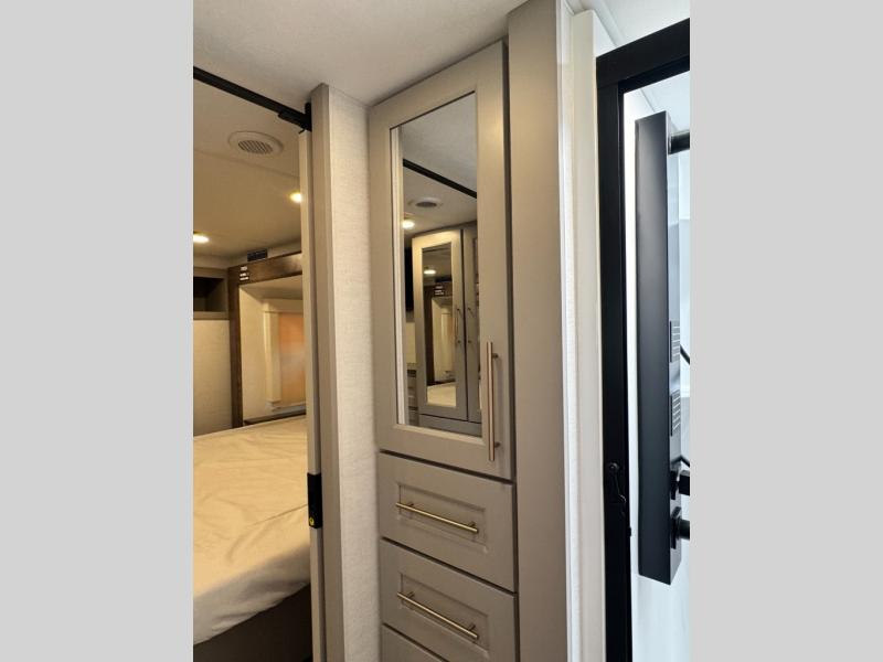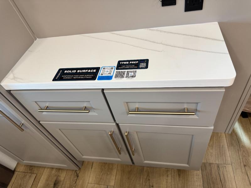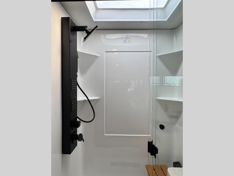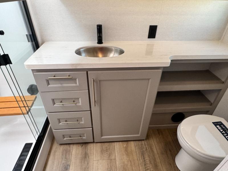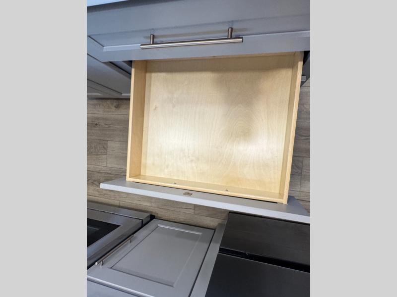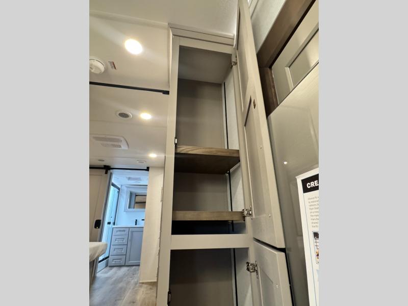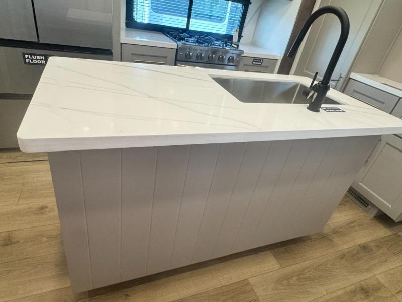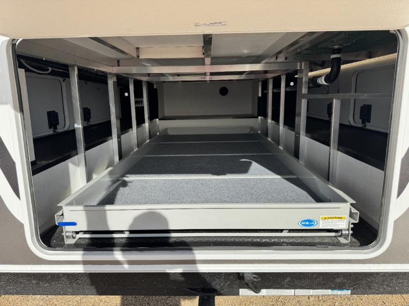 An active family will want this fifth wheel with its 48" x 115" exterior basement pull-out tray for kayaks or extra storage. Just above this area is the master suite with a rear bathroom that offers a residential shower, a porcelain toilet with soft close seat, plus a wardrobe and shelf storage. The king bed slide gives you more floor space, and you will have a seat, a flip-top dresser, and a Smart TV to watch movies in bed. The half bath is next to the main entry which is super convenient, and the middle kitchen is separate from the front living area. The cook will love the residential microwave, range and oven, plus the 19 cu. ft. 12 volt residential refrigerator. There is also a pantry and extra counter space on the kitchen island with a large sink. The views out of the atrium windows in the slide out, which includes the swivel table and desk, are a must see. And when you need to watch the big game, the 55" Smart TV with a pull-out fireplace storage are up front with the dual recliner love seat and two sleeper sofas.