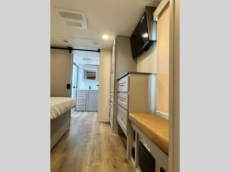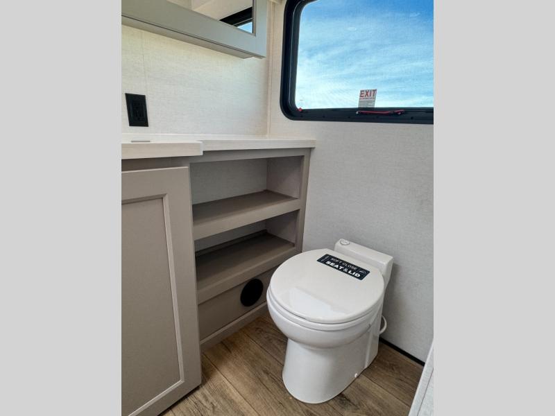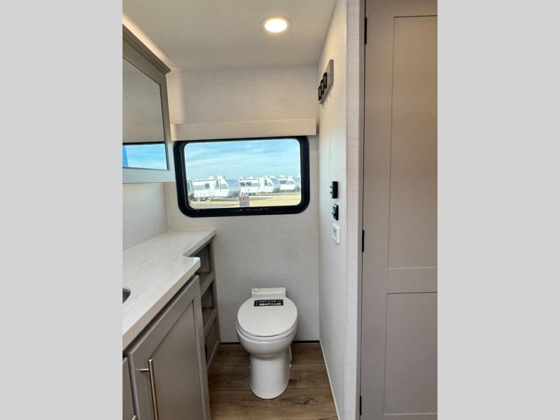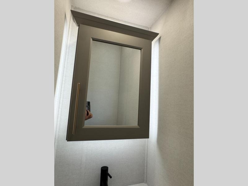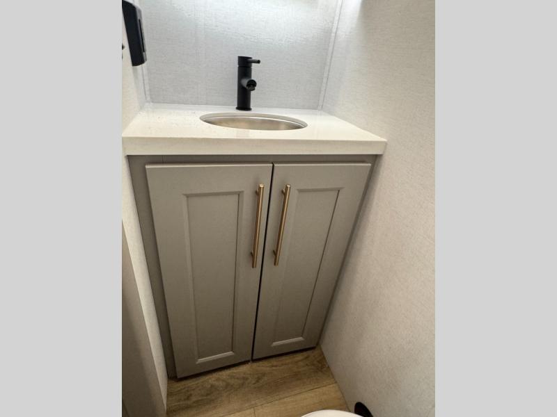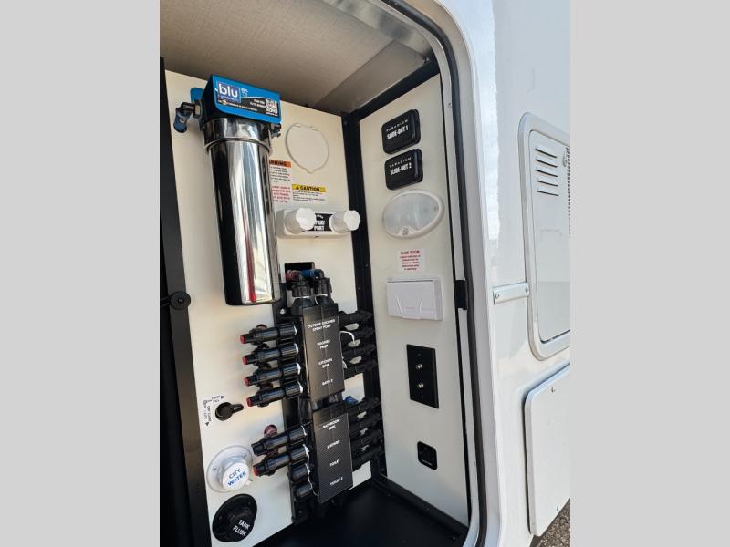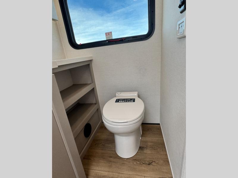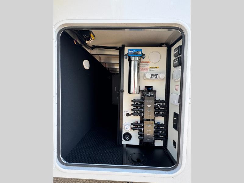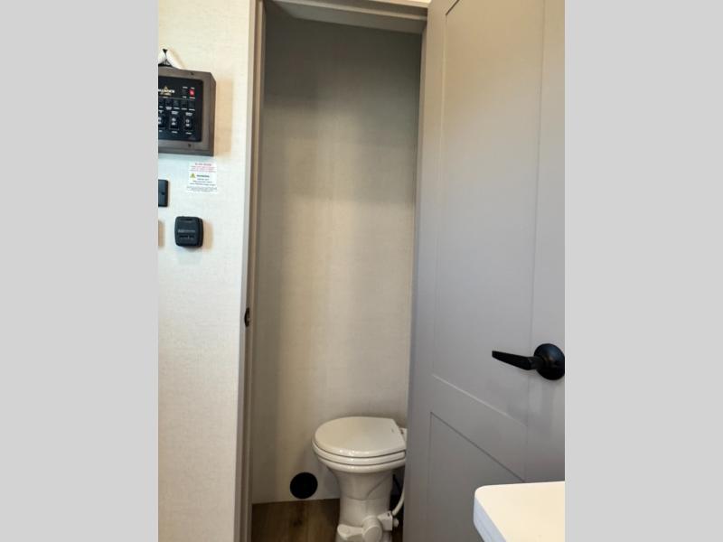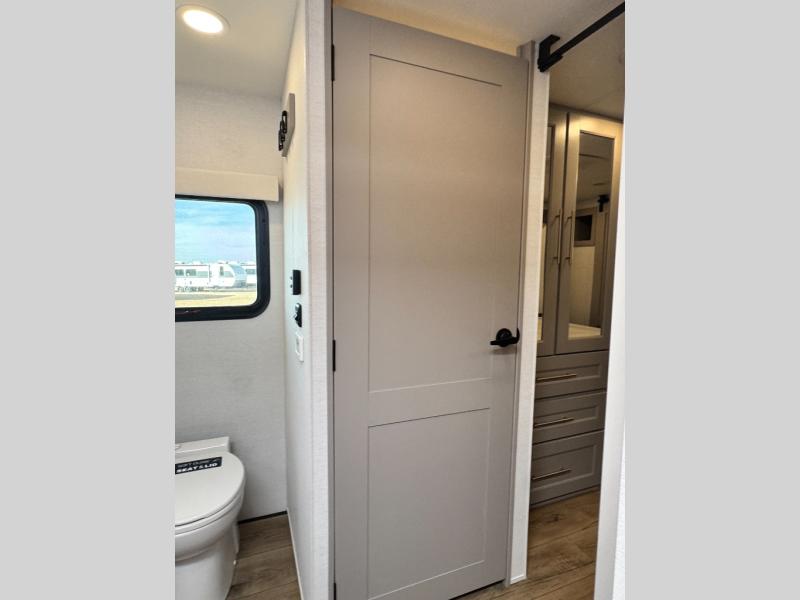An active family will want this fifth wheel with its 48" x 115" exterior basement pull-out tray for kayaks or extra storage. Just above this area is the master suite with a rear bathroom that offers a residential shower, a porcelain toilet with soft close seat, plus a wardrobe and shelf storage. The king bed slide gives you more floor space, and you will have a seat, a flip-top dresser, and a Smart TV to watch movies in bed. The half bath is next to the main entry which is super convenient, and the middle kitchen is separate from the front living area. The cook will love the residential microwave, range and oven, plus the 19 cu. ft. 12 volt residential refrigerator. There is also a pantry and extra counter space on the kitchen island with a large sink. The views out of the atrium windows in the slide out, which includes the swivel table and desk, are a must see. And when you need to watch the big game, the 55" Smart TV with a pull-out fireplace storage are up front with the dual recliner love seat and two sleeper sofas.