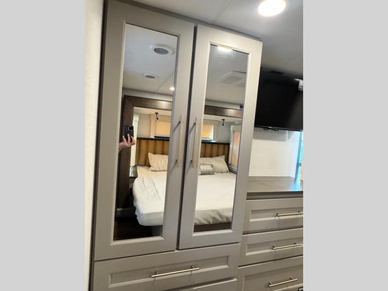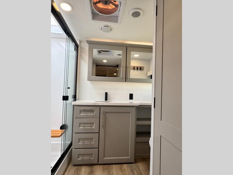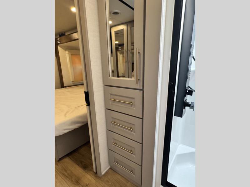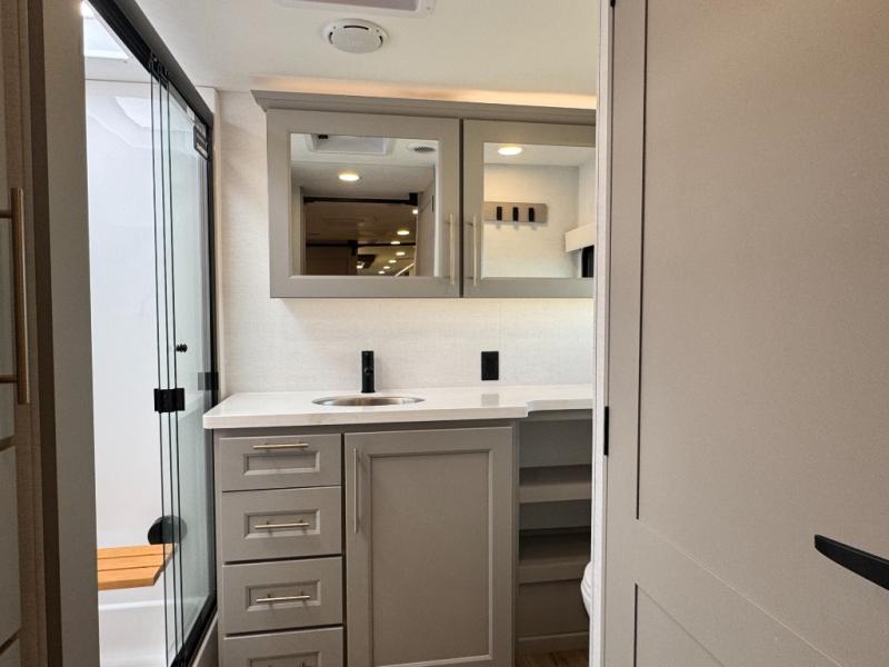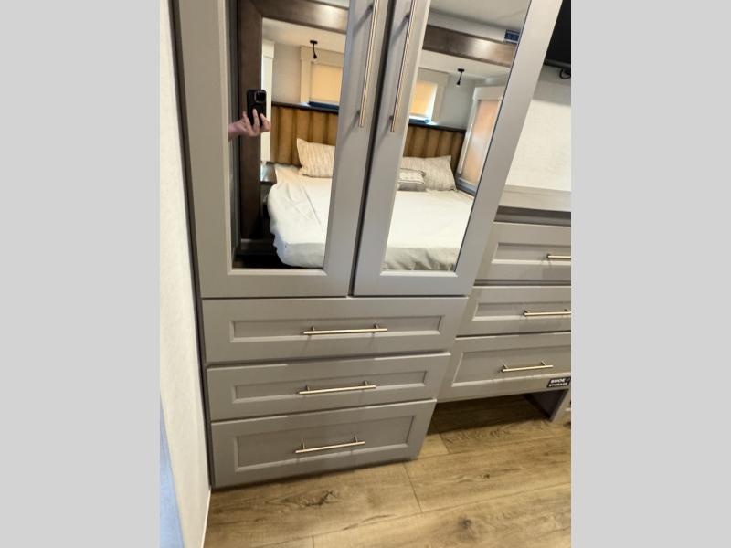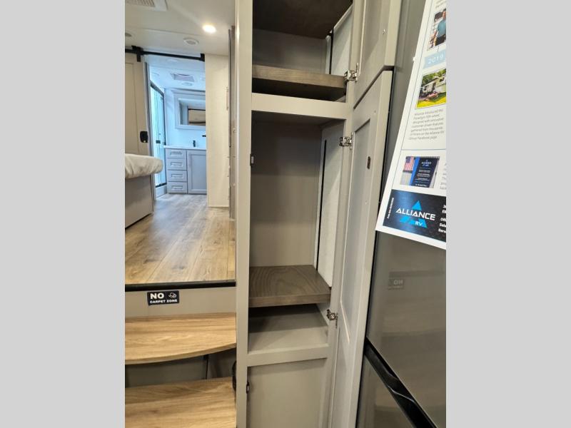 The Paradigm fifth wheels by Alliance RV are functional, high-quality, and luxurious for an unforgettable camping experience. There are three A/C units and a 40K BTU furnace to keep you comfortable year around, and you'll appreciate additional convenient amenities, like the all-in-one enclosed/heated utility center and the color coded and numbered wiring. A Helux Series coil spring pin box comes standard for hassle-free towing, along with Curt 8,000 lb. axles. You'll love the kitchen with its LG solid surface countertops and Lusso range, plus there is LED motion lighting in the pantry and a Maxx fan with a rain sensor to keep everything fresh when making dinner. Each model also includes an HD Smart TV in the living room and bedroom. And of course there are a variety of options you can choose from to further customize your fifth wheel; dual pane windows, Super Solar Plus, slide out awning toppers, and generator prep or a generator to name a few!