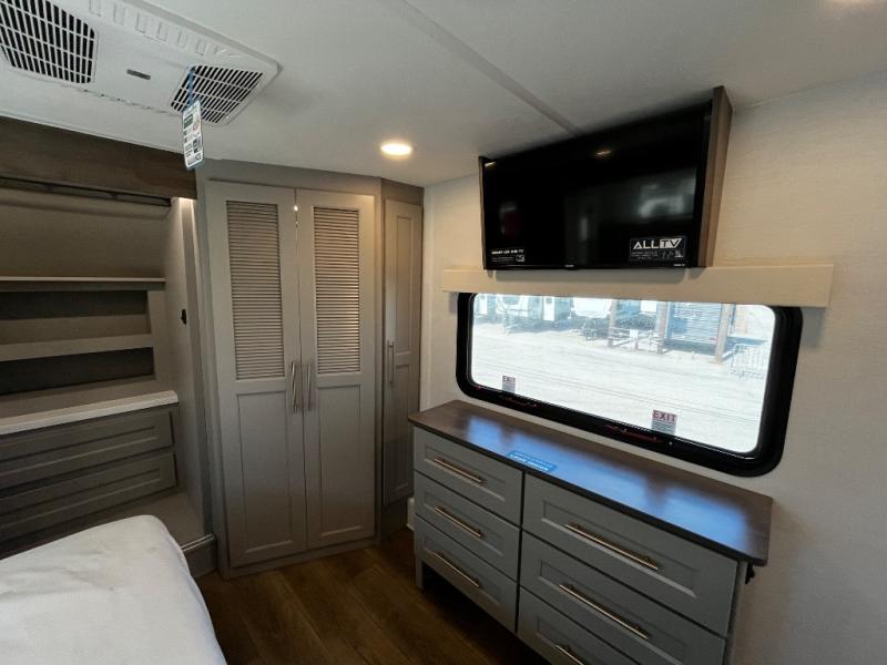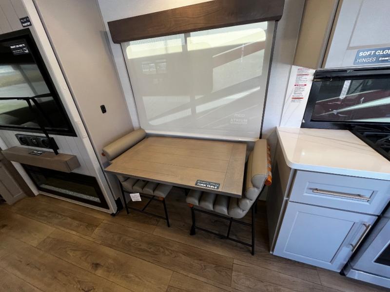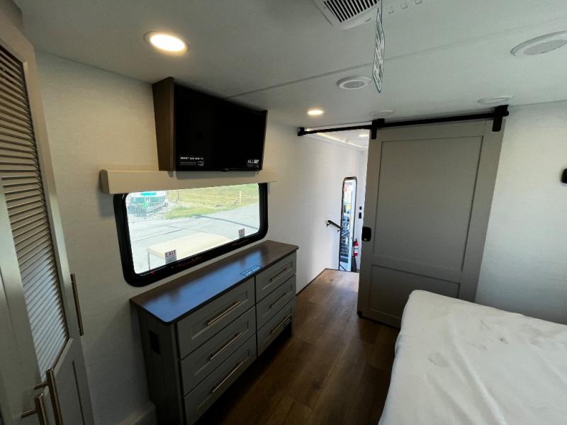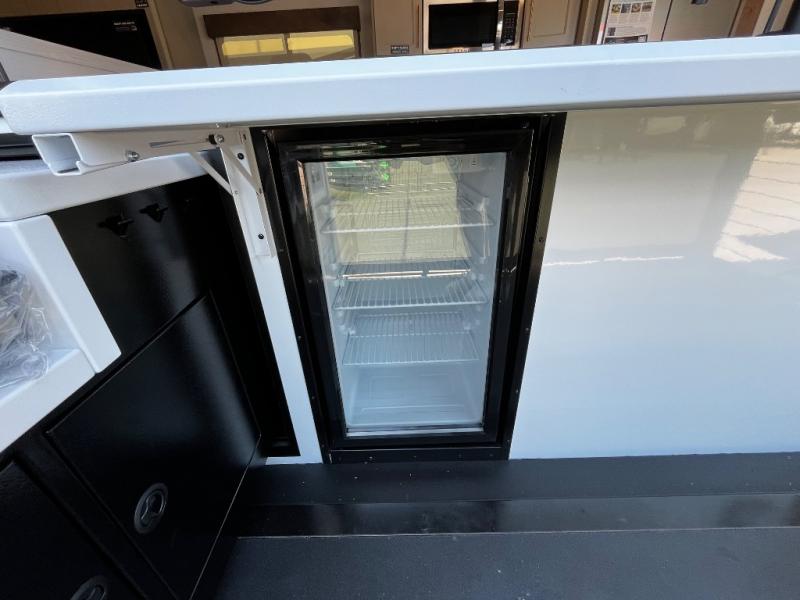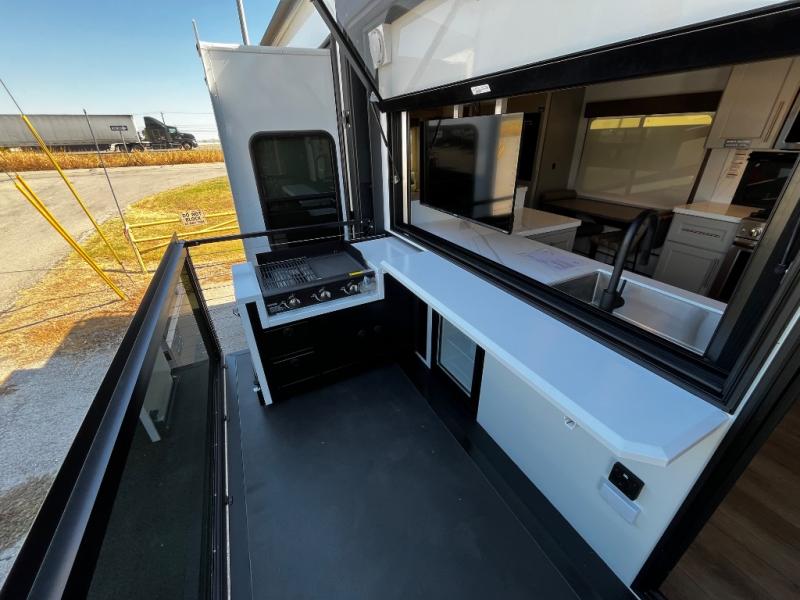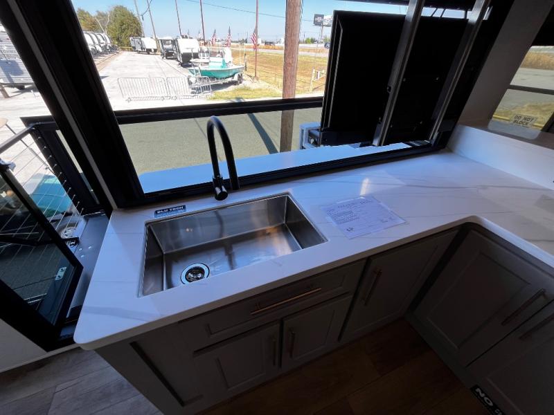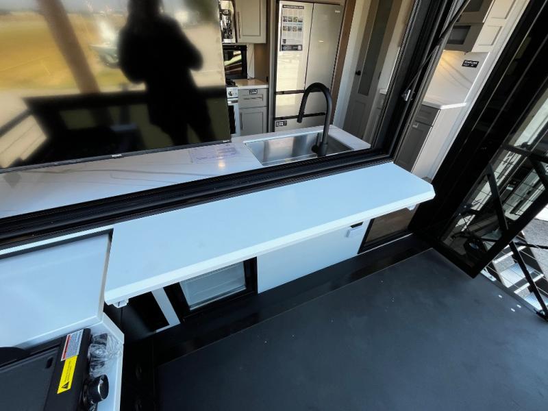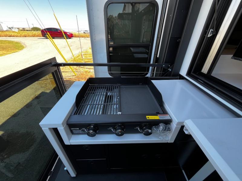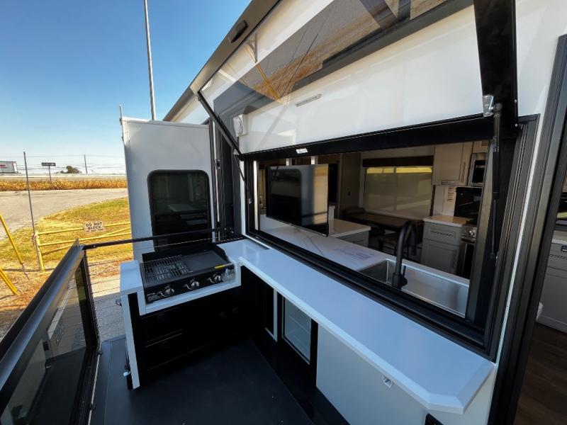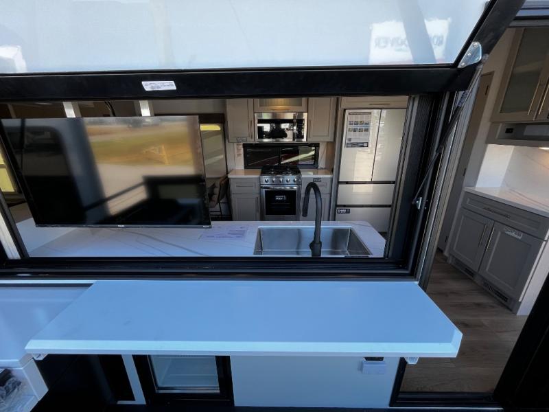 You will fall in love with this unit’s slide patio with picture window, the perfect spot to take in the breathtaking views. Enjoy outdoor cooking with the countertop prep area and pull-out grill, while the drop-down TV provides entertainment for all. Inside, rear living area features two sleeper sofas, perfect for lounging and relaxing. Overhead cabinets provide ample storage, while the 50” class smart TV offers endless entertainment options. Gather around the turn table dinette for meals or socializing. The kitchen is fully equipped with a microwave, sink, refrigerator, pantry, and hutch, making meal preparation and storage a breeze. Also this unit has a full bathroom and a cozy front bedroom which boast a king bed, ample closet, a TV, and so much more!
