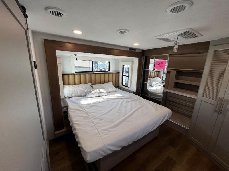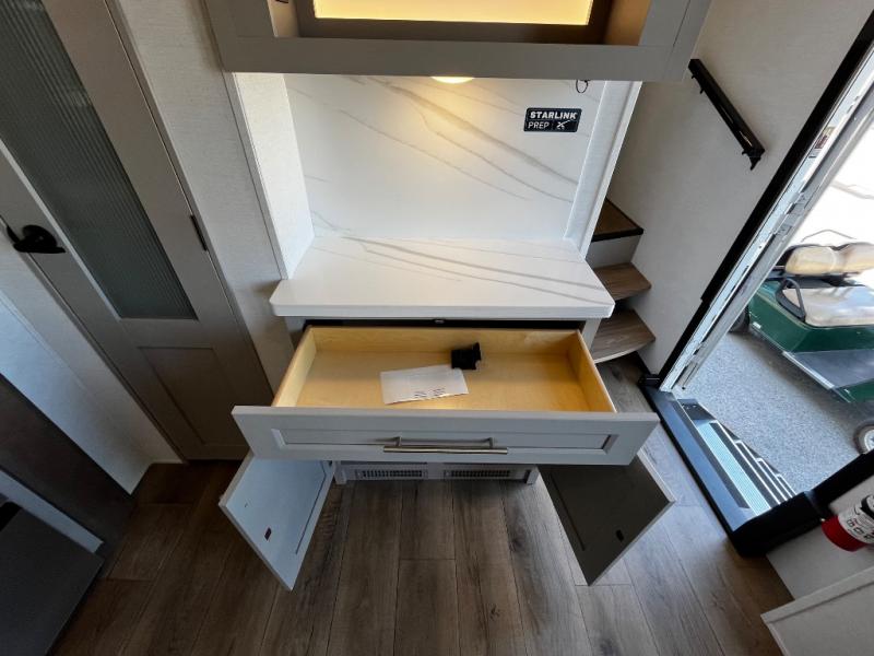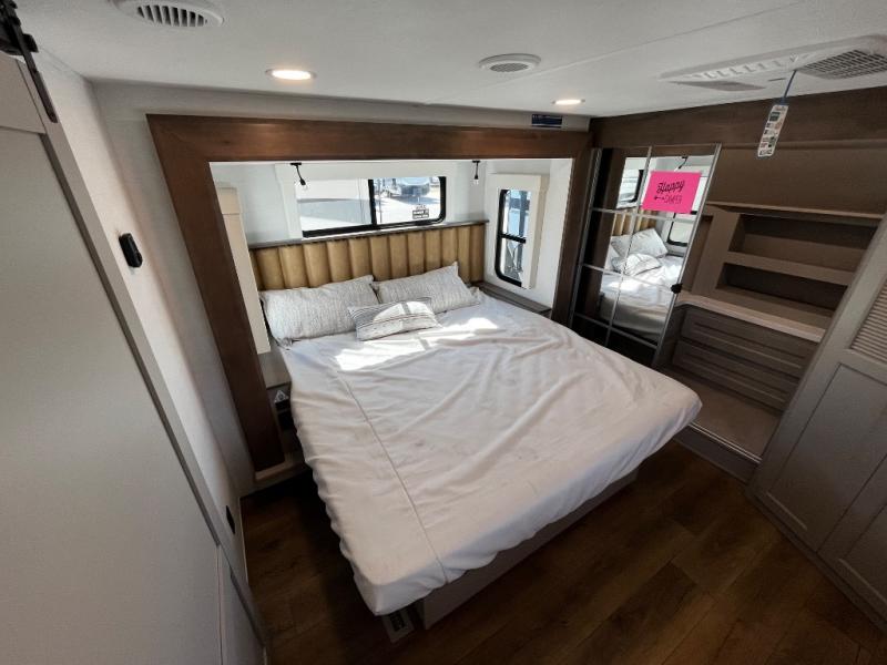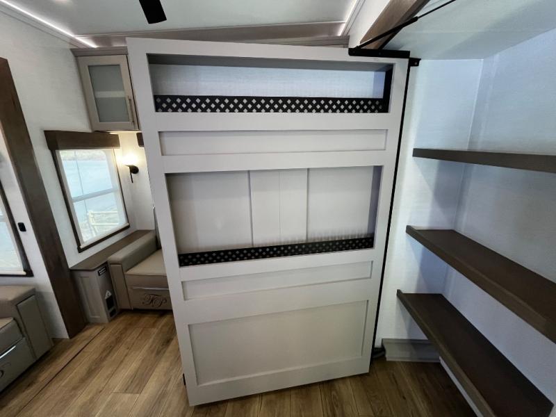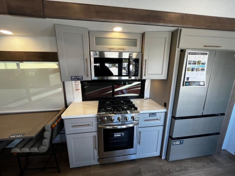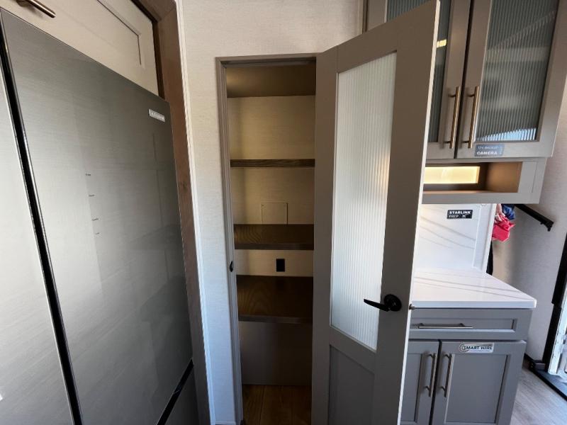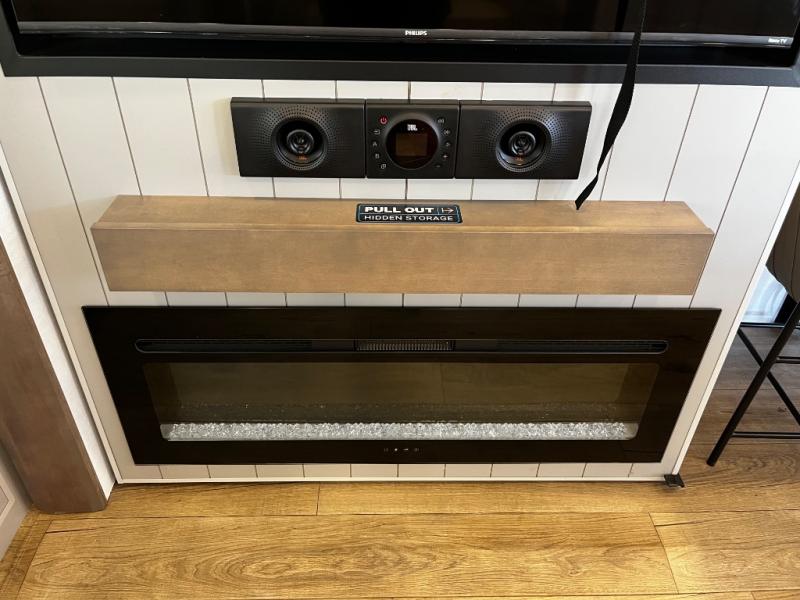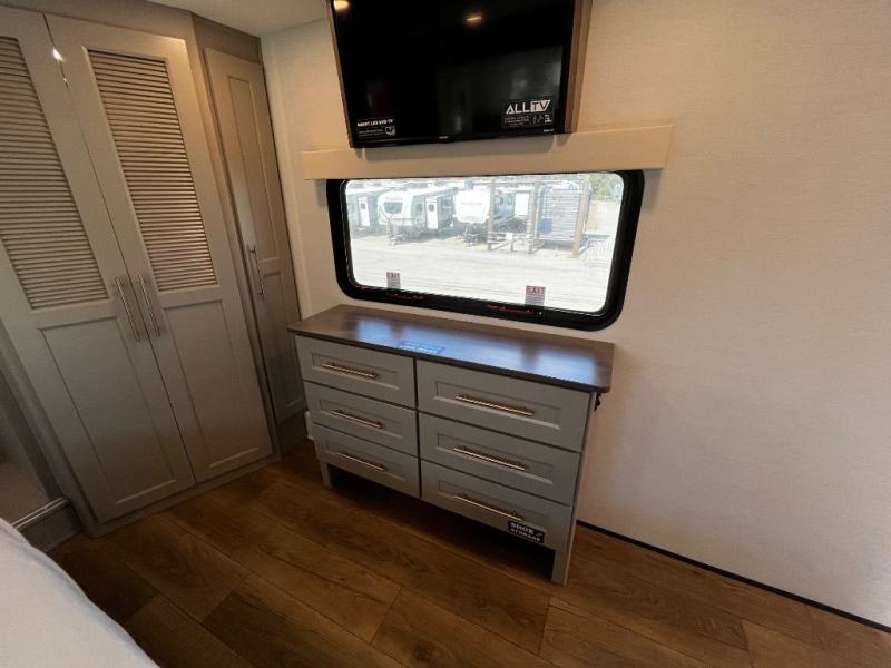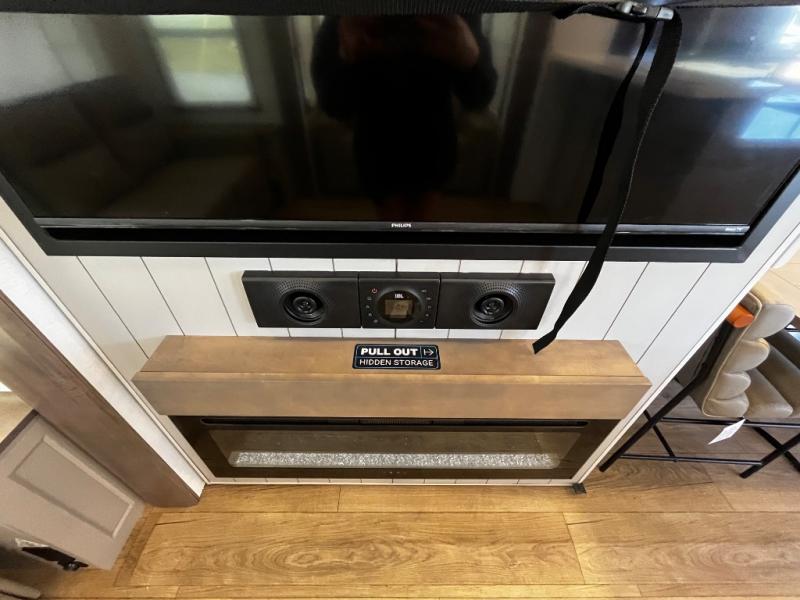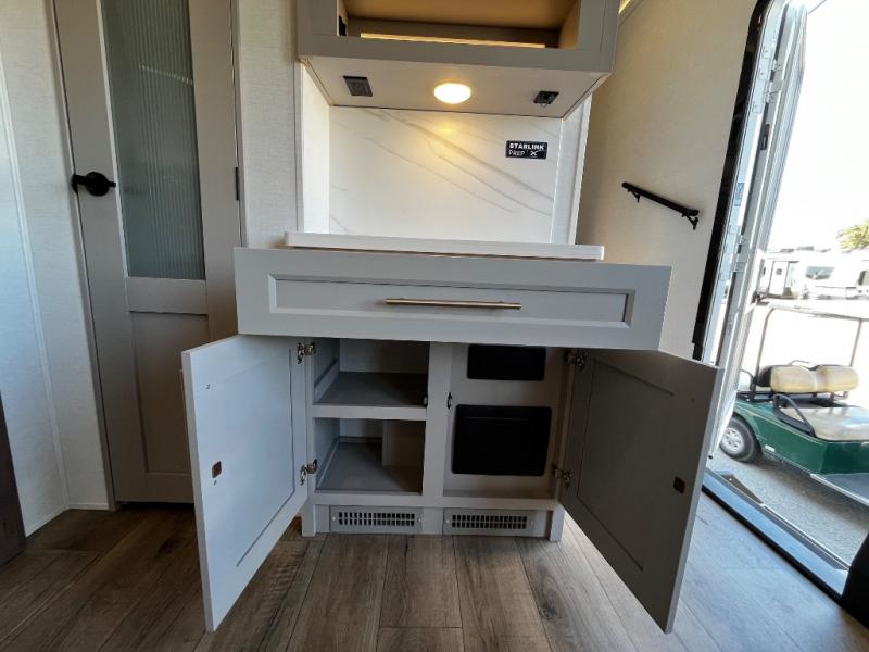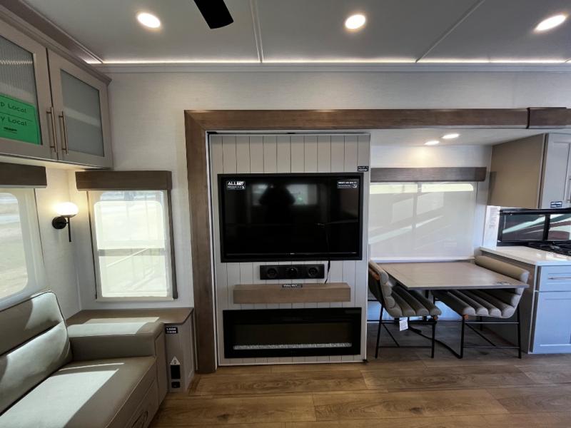 You will fall in love with this unit’s slide patio with picture window, the perfect spot to take in the breathtaking views. Enjoy outdoor cooking with the countertop prep area and pull-out grill, while the drop-down TV provides entertainment for all. Inside, rear living area features two sleeper sofas, perfect for lounging and relaxing. Overhead cabinets provide ample storage, while the 50” class smart TV offers endless entertainment options. Gather around the turn table dinette for meals or socializing. The kitchen is fully equipped with a microwave, sink, refrigerator, pantry, and hutch, making meal preparation and storage a breeze. Also this unit has a full bathroom and a cozy front bedroom which boast a king bed, ample closet, a TV, and so much more!