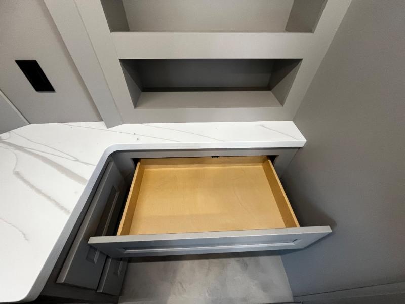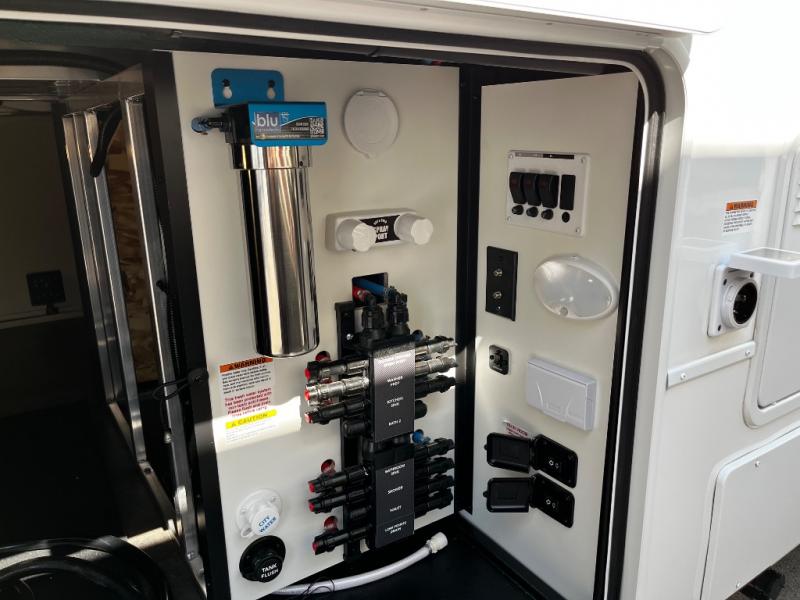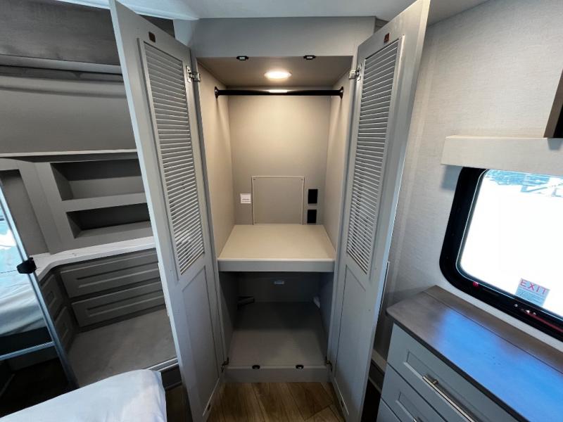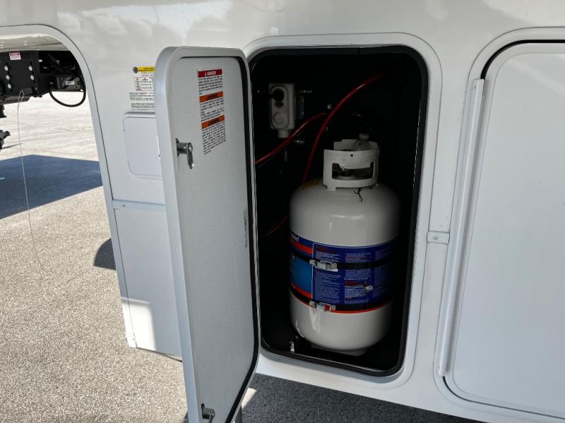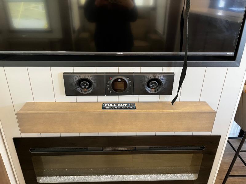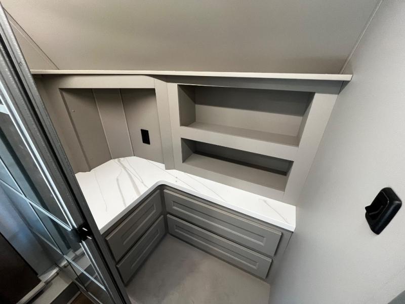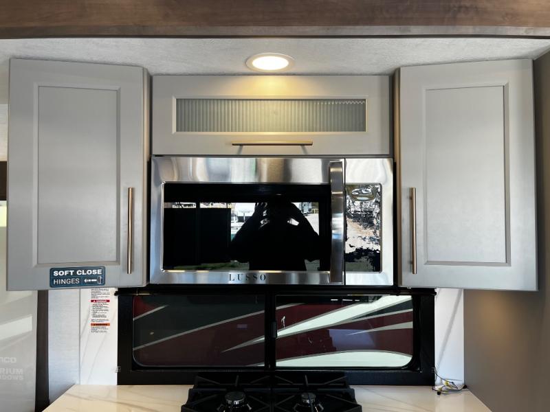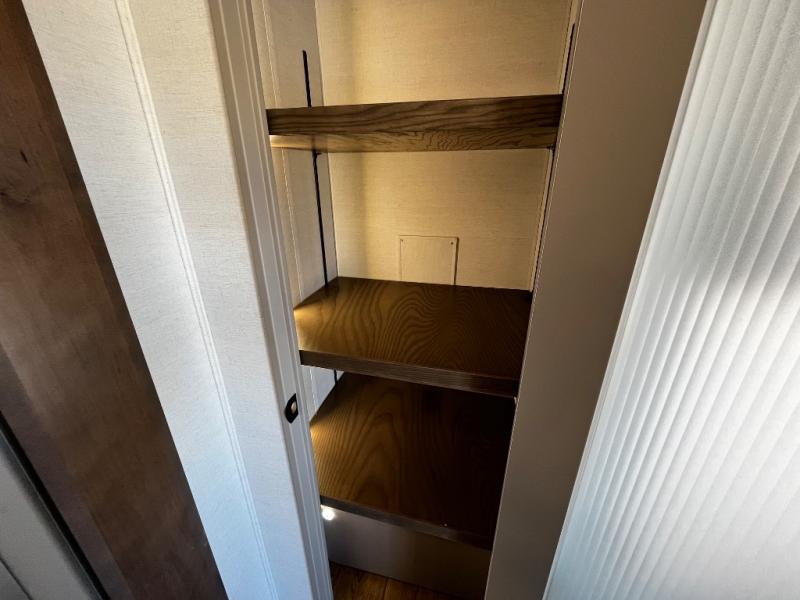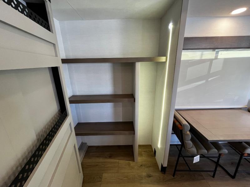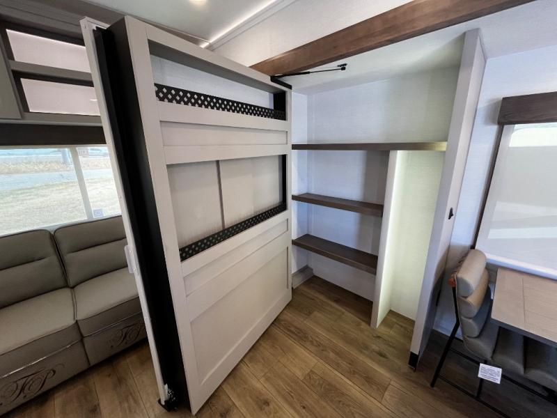 You will fall in love with this unit’s slide patio with picture window, the perfect spot to take in the breathtaking views. Enjoy outdoor cooking with the countertop prep area and pull-out grill, while the drop-down TV provides entertainment for all. Inside, rear living area features two sleeper sofas, perfect for lounging and relaxing. Overhead cabinets provide ample storage, while the 50” class smart TV offers endless entertainment options. Gather around the turn table dinette for meals or socializing. The kitchen is fully equipped with a microwave, sink, refrigerator, pantry, and hutch, making meal preparation and storage a breeze. Also this unit has a full bathroom and a cozy front bedroom which boast a king bed, ample closet, a TV, and so much more!