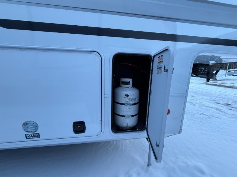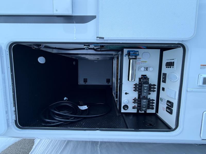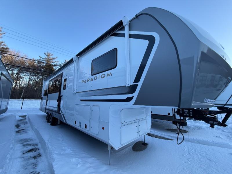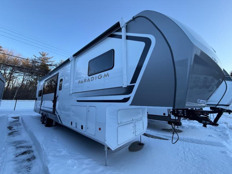 The Paradigm fifth wheels by Alliance RV are functional, high-quality, and luxurious for an unforgettable camping experience. There are three A/C units and a 40K BTU furnace to keep you comfortable year around, and you'll appreciate additional convenient amenities, like the all-in-one enclosed/heated utility center and the color coded and numbered wiring. A Helux Series coil spring pin box comes standard for hassle-free towing, along with Curt 8,000 lb. axles. You'll love the kitchen with its LG solid surface countertops and Lusso range, plus there is LED motion lighting in the pantry and a Maxx fan with a rain sensor to keep everything fresh when making dinner. Each model also includes an HD Smart TV in the living room and bedroom. And of course there are a variety of options you can choose from to further customize your fifth wheel; dual pane windows, Super Solar Plus, slide out awning toppers, and generator prep or a generator to name a few!