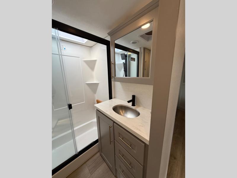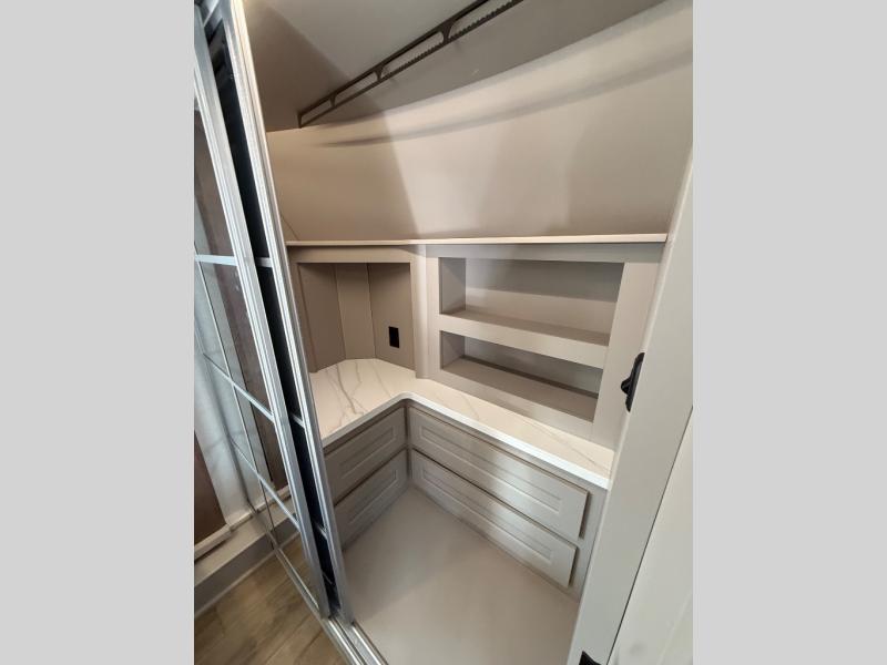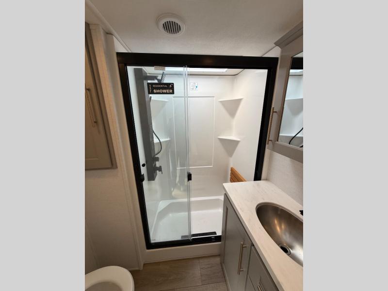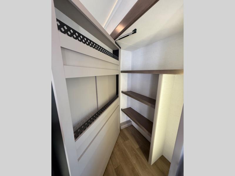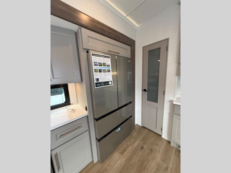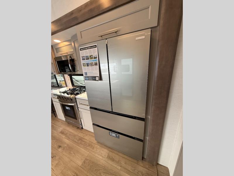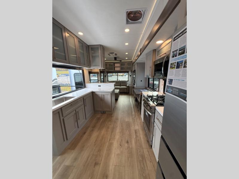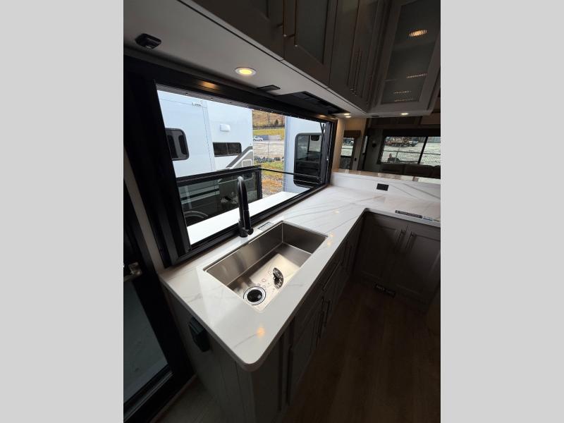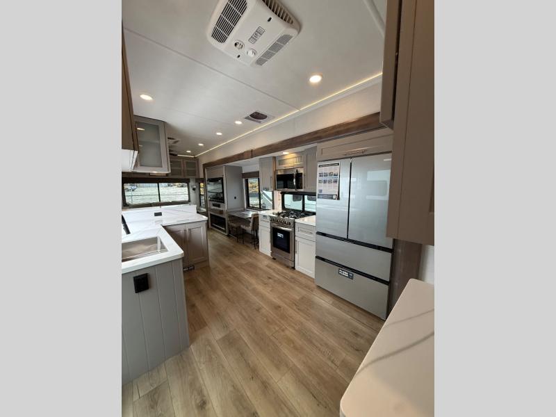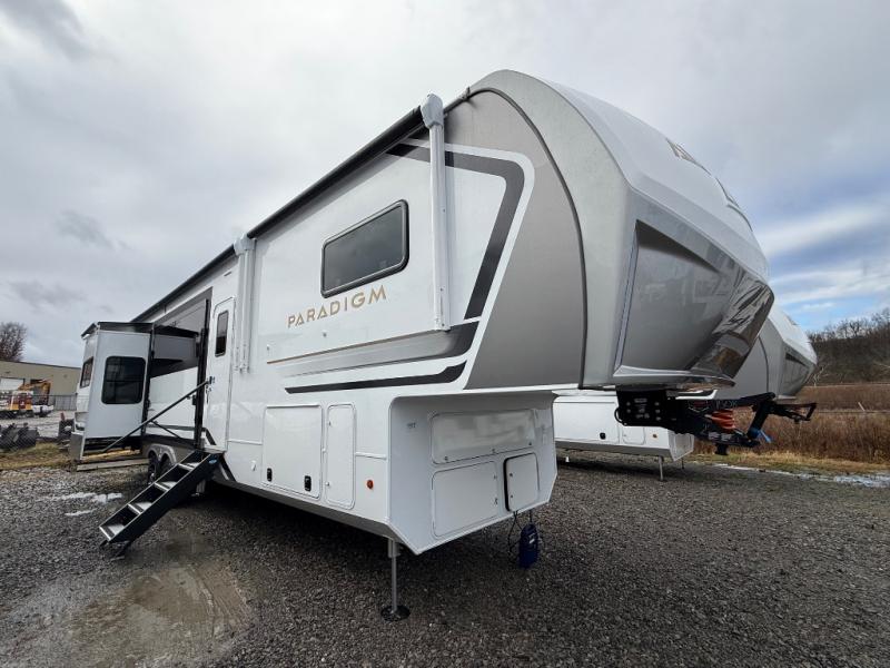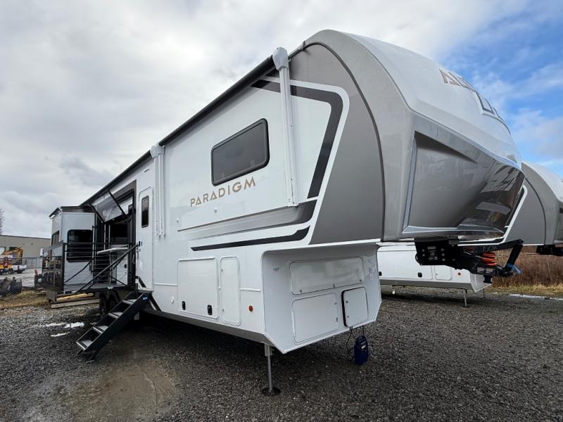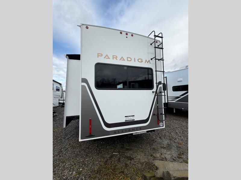 The Paradigm fifth wheels by Alliance RV are functional, high-quality, and luxurious for an unforgettable camping experience. There are three A/C units and a 40K BTU furnace to keep you comfortable year around, and you'll appreciate additional convenient amenities, like the all-in-one enclosed/heated utility center and the color coded and numbered wiring. A Helux Series coil spring pin box comes standard for hassle-free towing, along with Curt 8,000 lb. axles. You'll love the kitchen with its LG solid surface countertops and Lusso range, plus there is LED motion lighting in the pantry and a Maxx fan with a rain sensor to keep everything fresh when making dinner. Each model also includes an HD Smart TV in the living room and bedroom. And of course there are a variety of options you can choose from to further customize your fifth wheel; dual pane windows, Super Solar Plus, slide out awning toppers, and generator prep or a generator to name a few!