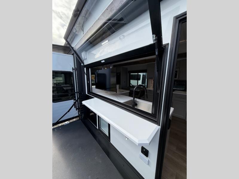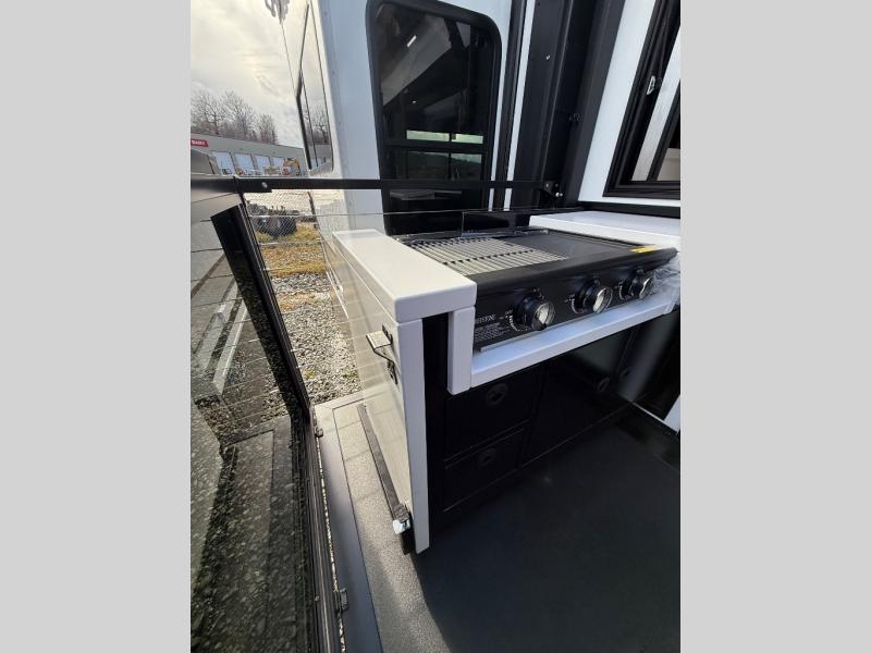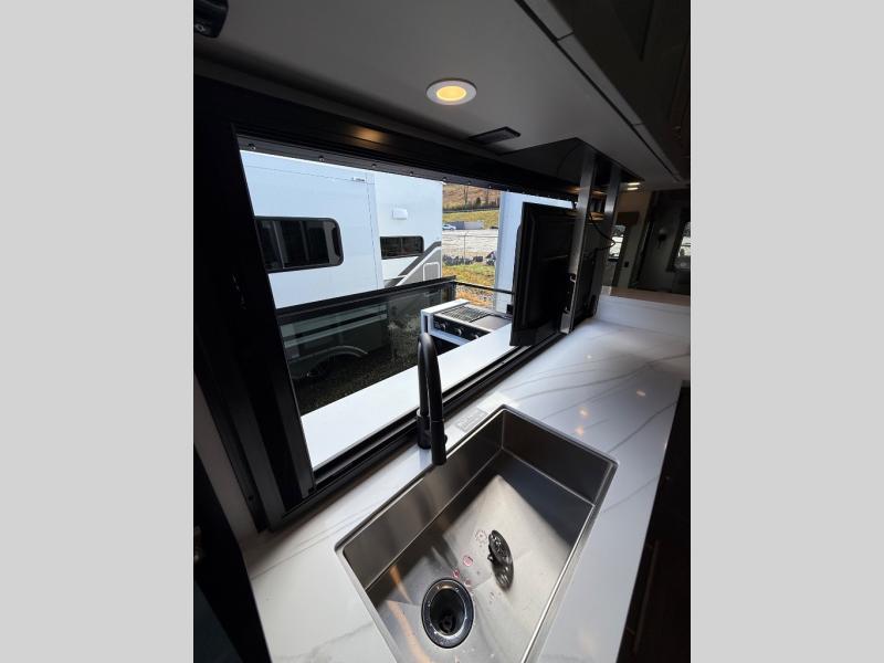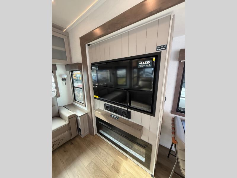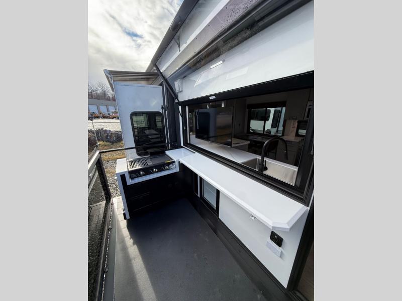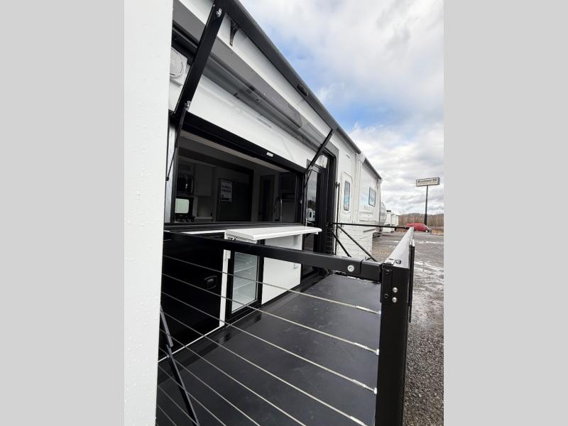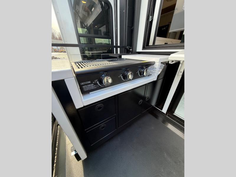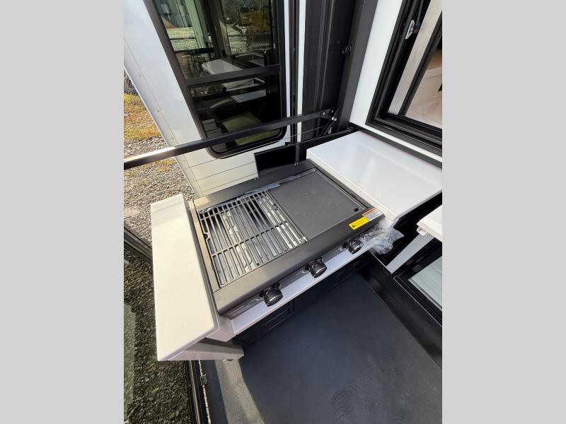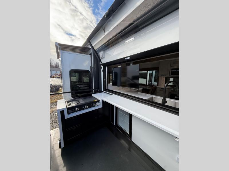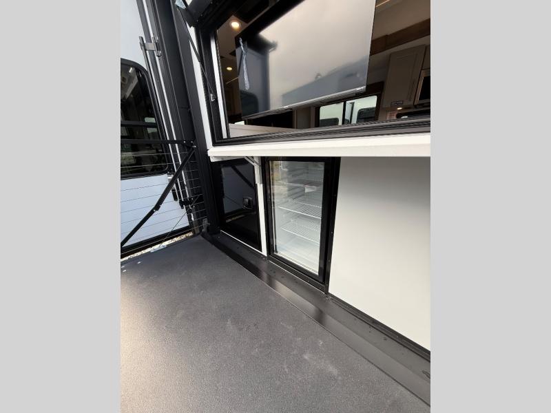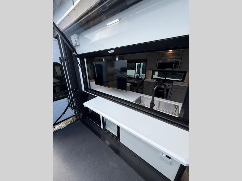 You will fall in love with this unit’s slide patio with picture window, the perfect spot to take in the breathtaking views. Enjoy outdoor cooking with the countertop prep area and pull-out grill, while the drop-down TV provides entertainment for all. Inside, rear living area features two sleeper sofas, perfect for lounging and relaxing. Overhead cabinets provide ample storage, while the 50” class smart TV offers endless entertainment options. Gather around the turn table dinette for meals or socializing. The kitchen is fully equipped with a microwave, sink, refrigerator, pantry, and hutch, making meal preparation and storage a breeze. Also this unit has a full bathroom and a cozy front bedroom which boast a king bed, ample closet, a TV, and so much more!
