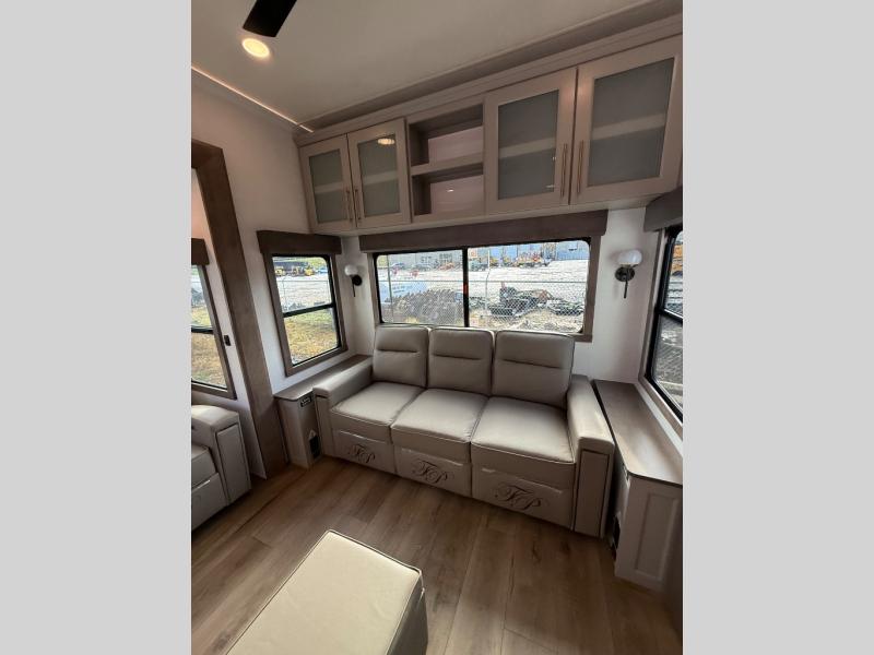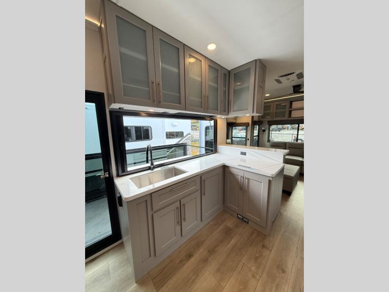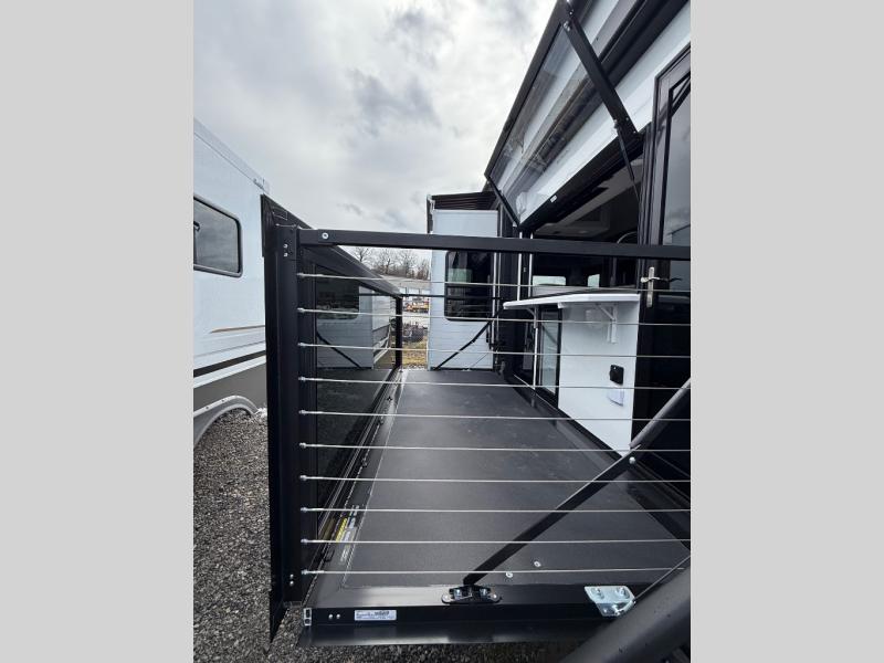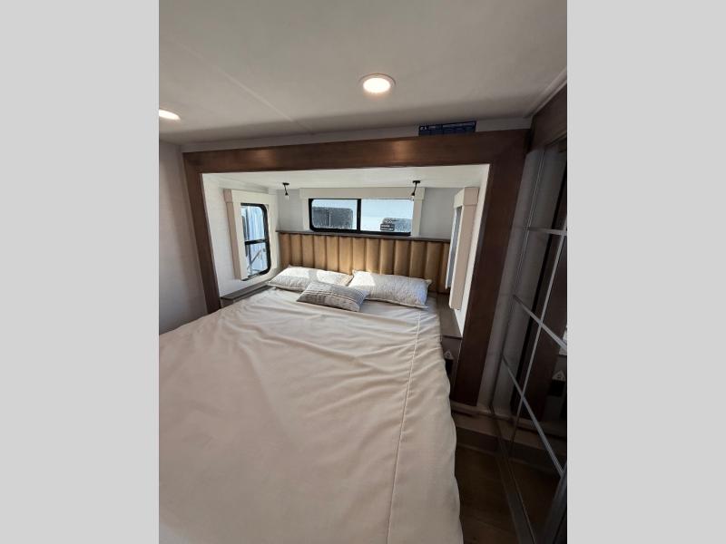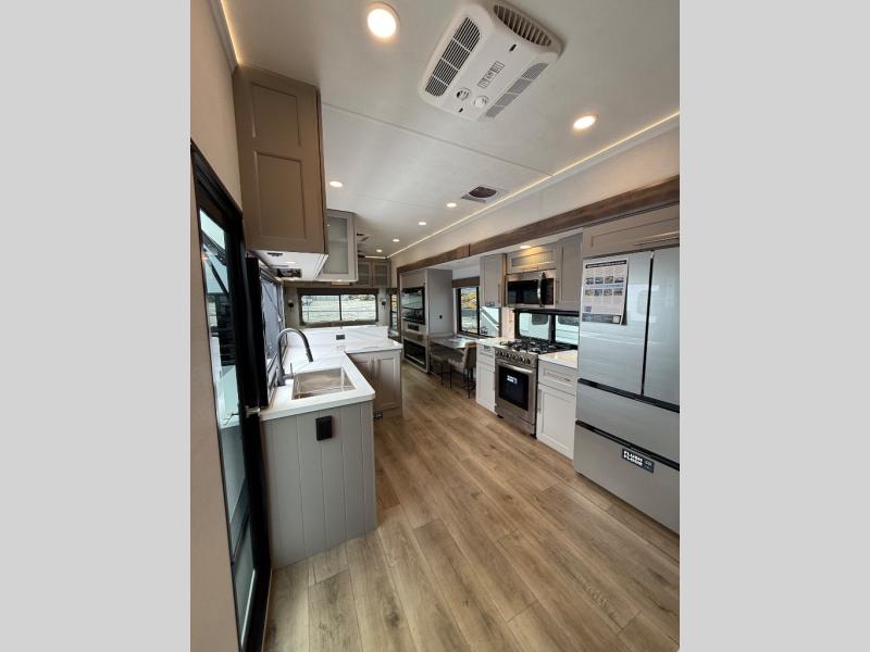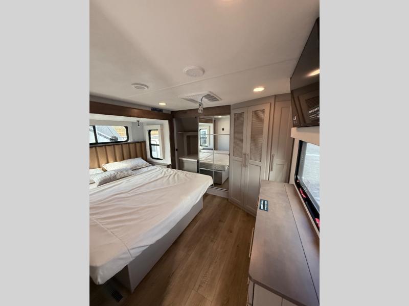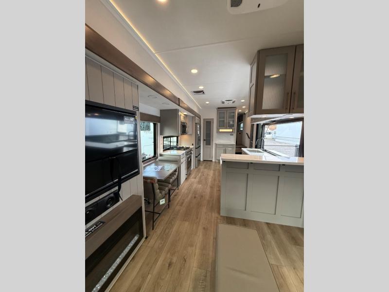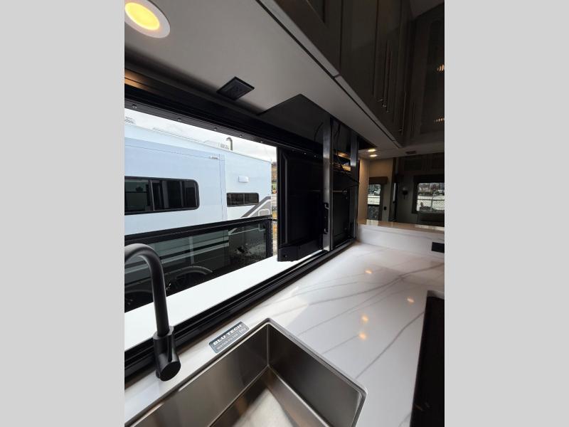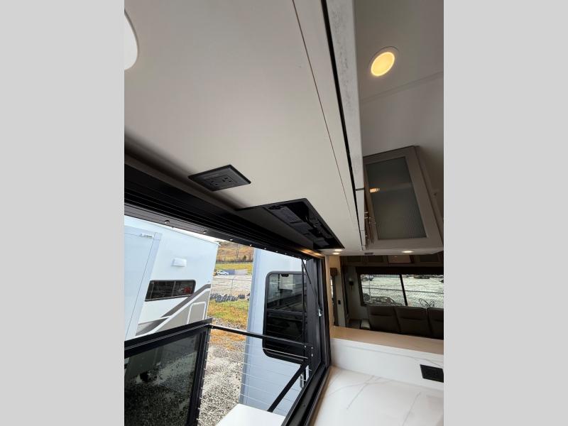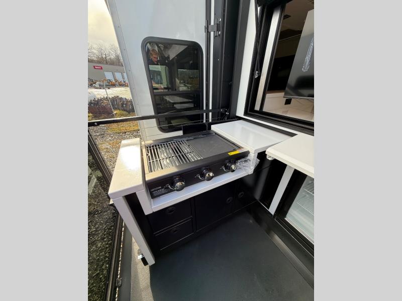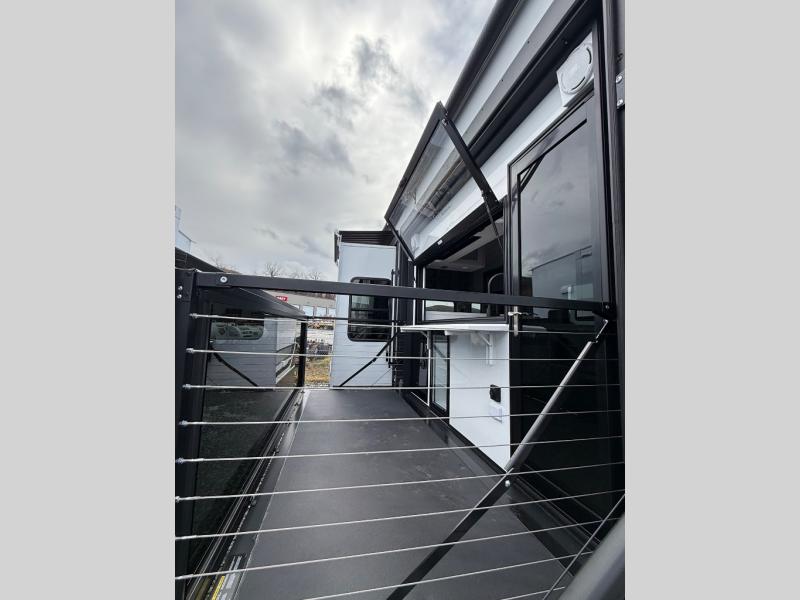 You will fall in love with this unit’s slide patio with picture window, the perfect spot to take in the breathtaking views. Enjoy outdoor cooking with the countertop prep area and pull-out grill, while the drop-down TV provides entertainment for all. Inside, rear living area features two sleeper sofas, perfect for lounging and relaxing. Overhead cabinets provide ample storage, while the 50” class smart TV offers endless entertainment options. Gather around the turn table dinette for meals or socializing. The kitchen is fully equipped with a microwave, sink, refrigerator, pantry, and hutch, making meal preparation and storage a breeze. Also this unit has a full bathroom and a cozy front bedroom which boast a king bed, ample closet, a TV, and so much more!