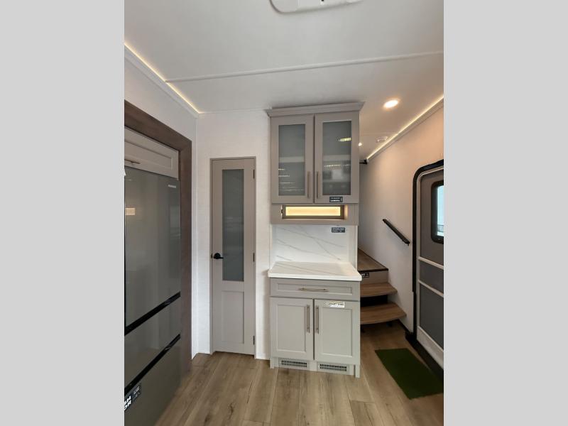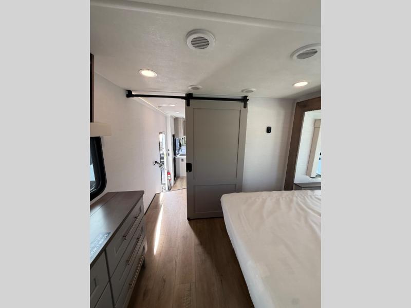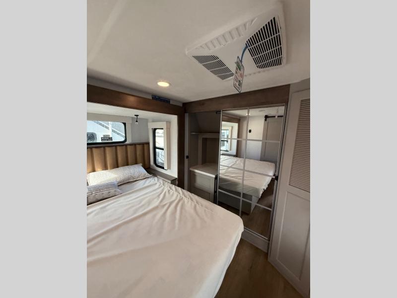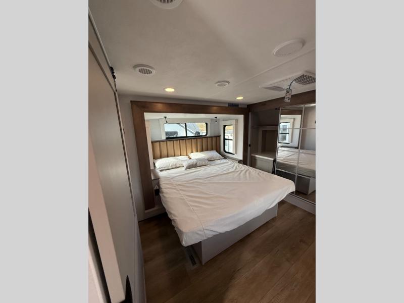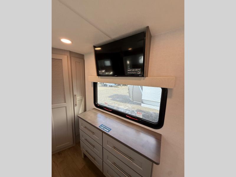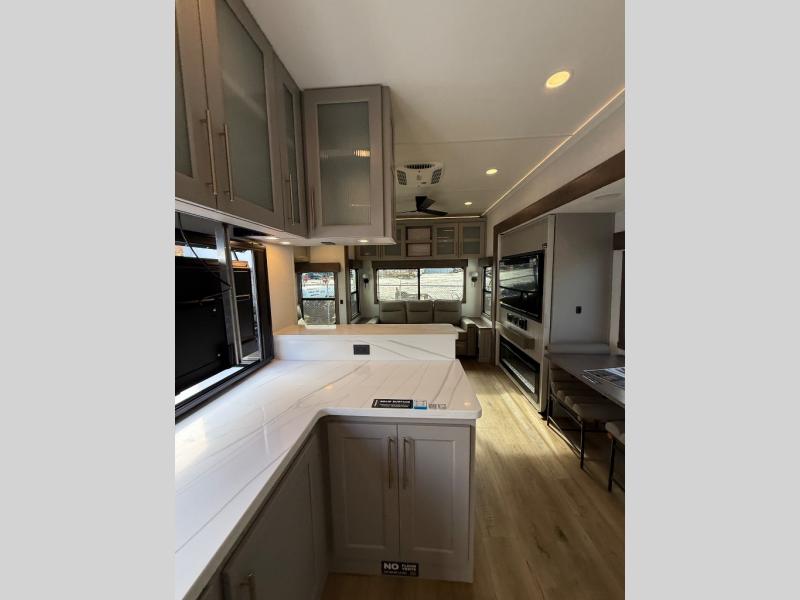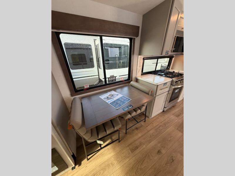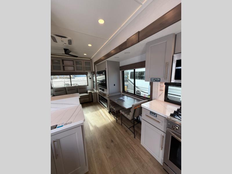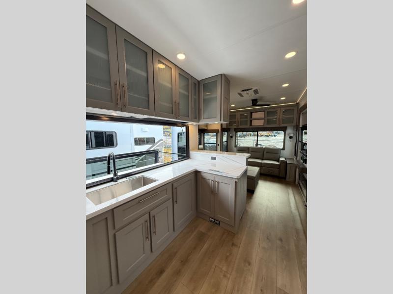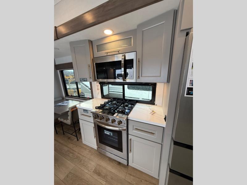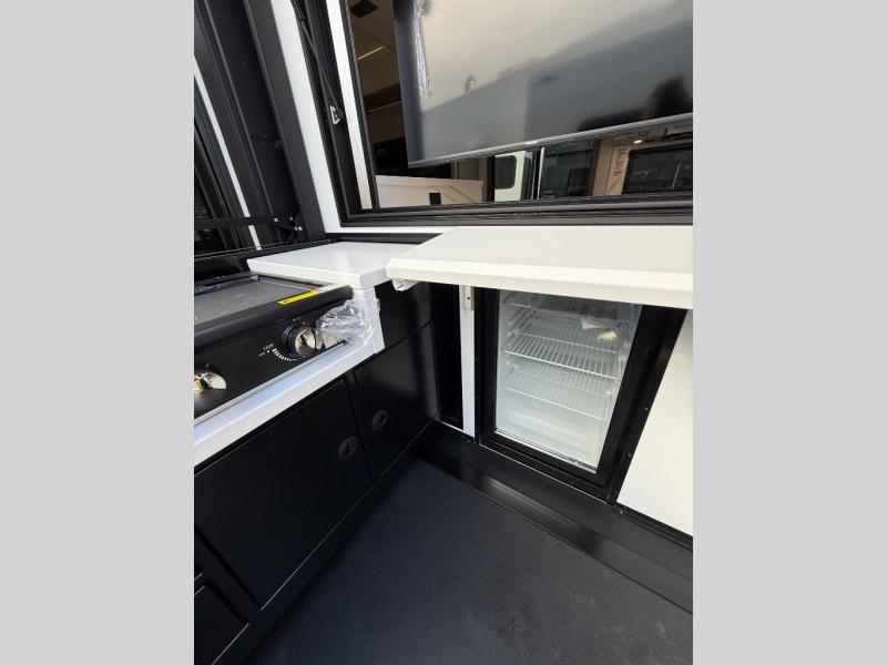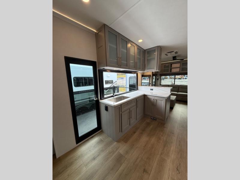 You will fall in love with this unit’s slide patio with picture window, the perfect spot to take in the breathtaking views. Enjoy outdoor cooking with the countertop prep area and pull-out grill, while the drop-down TV provides entertainment for all. Inside, rear living area features two sleeper sofas, perfect for lounging and relaxing. Overhead cabinets provide ample storage, while the 50” class smart TV offers endless entertainment options. Gather around the turn table dinette for meals or socializing. The kitchen is fully equipped with a microwave, sink, refrigerator, pantry, and hutch, making meal preparation and storage a breeze. Also this unit has a full bathroom and a cozy front bedroom which boast a king bed, ample closet, a TV, and so much more!