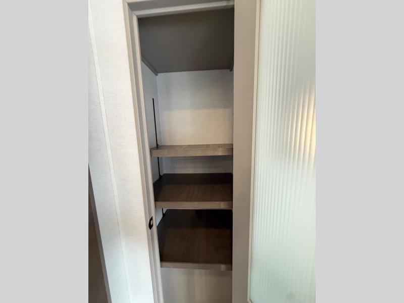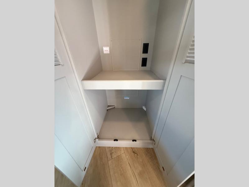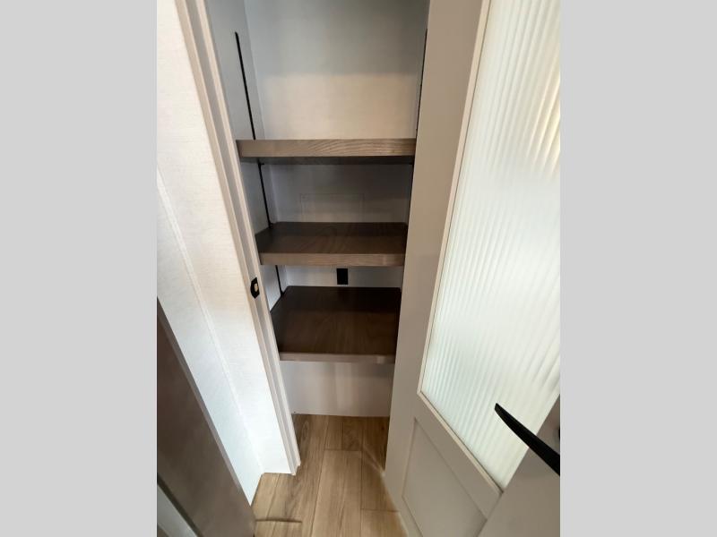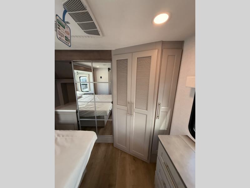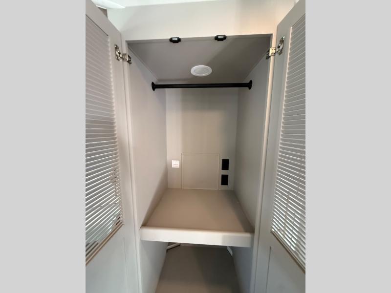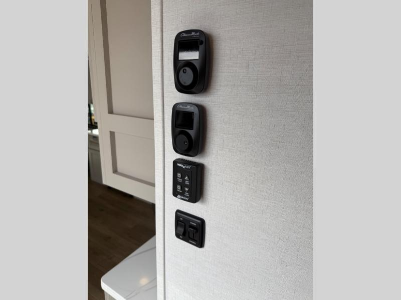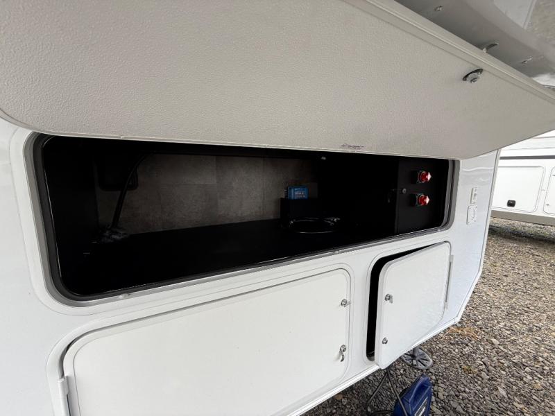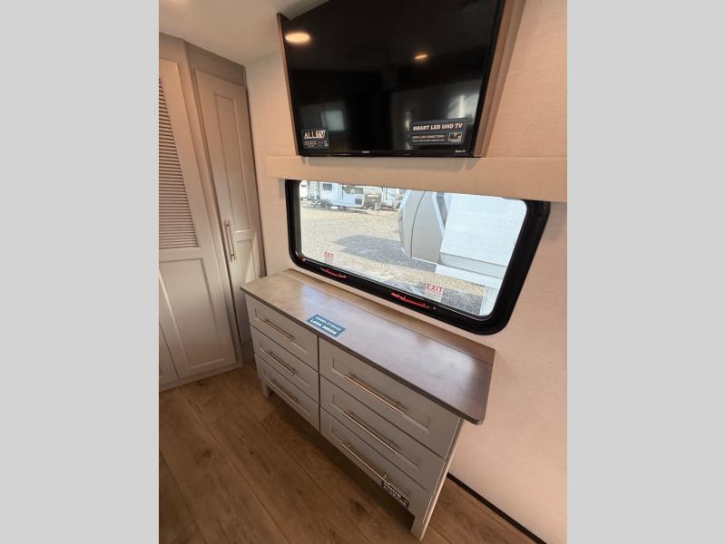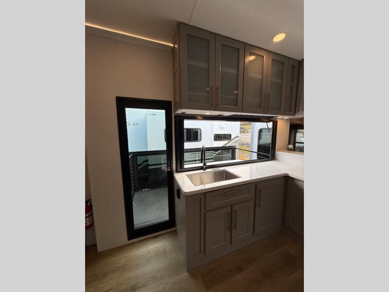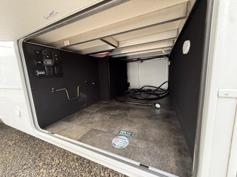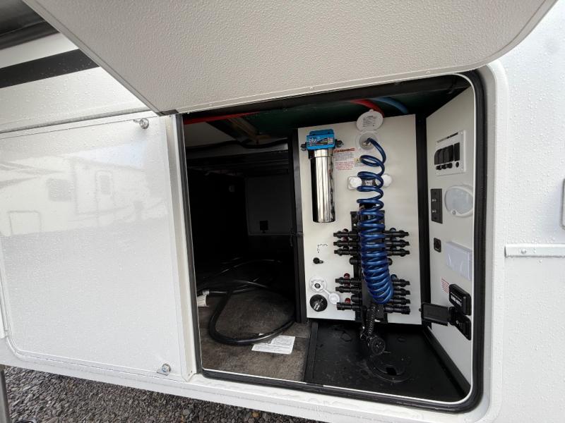 You will fall in love with this unit’s slide patio with picture window, the perfect spot to take in the breathtaking views. Enjoy outdoor cooking with the countertop prep area and pull-out grill, while the drop-down TV provides entertainment for all. Inside, rear living area features two sleeper sofas, perfect for lounging and relaxing. Overhead cabinets provide ample storage, while the 50” class smart TV offers endless entertainment options. Gather around the turn table dinette for meals or socializing. The kitchen is fully equipped with a microwave, sink, refrigerator, pantry, and hutch, making meal preparation and storage a breeze. Also this unit has a full bathroom and a cozy front bedroom which boast a king bed, ample closet, a TV, and so much more!