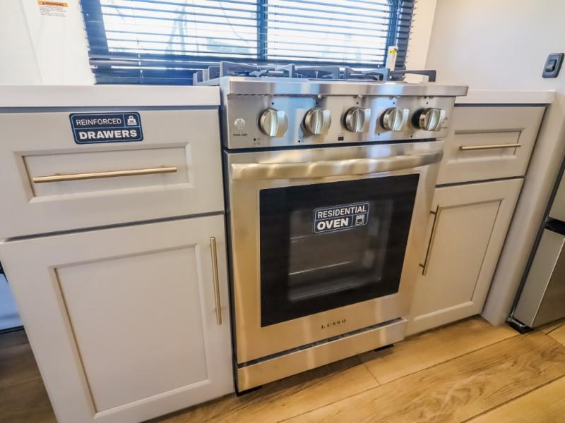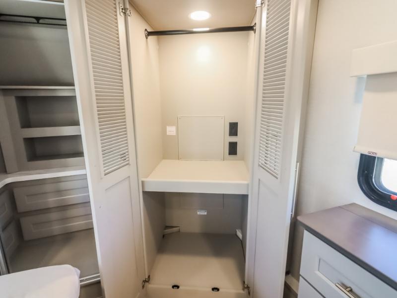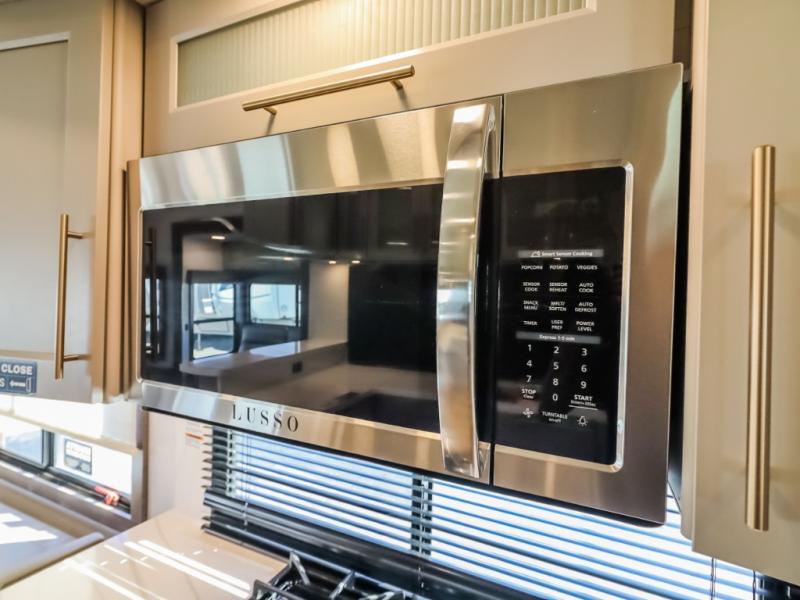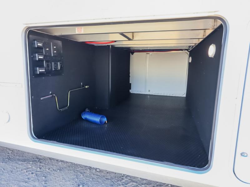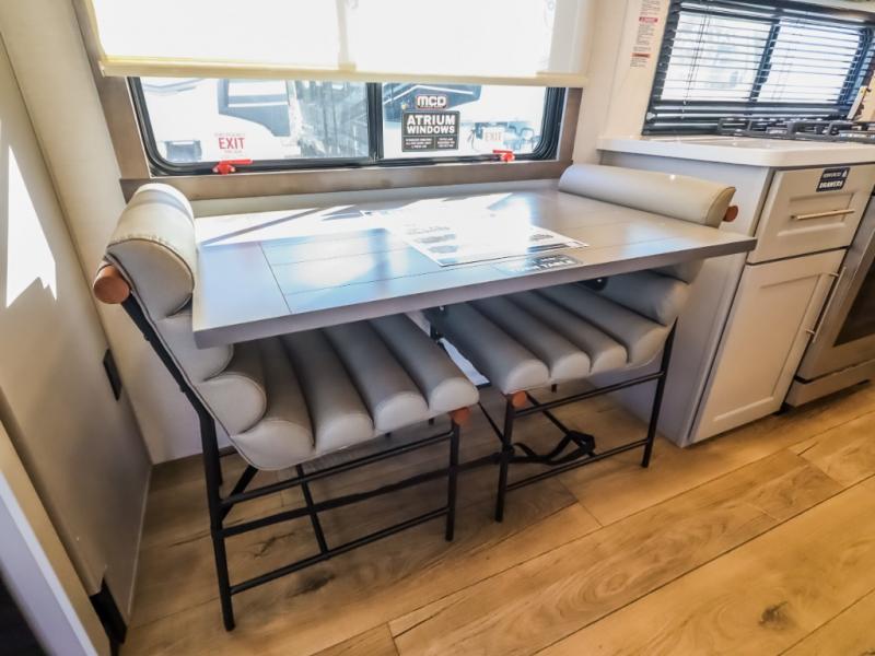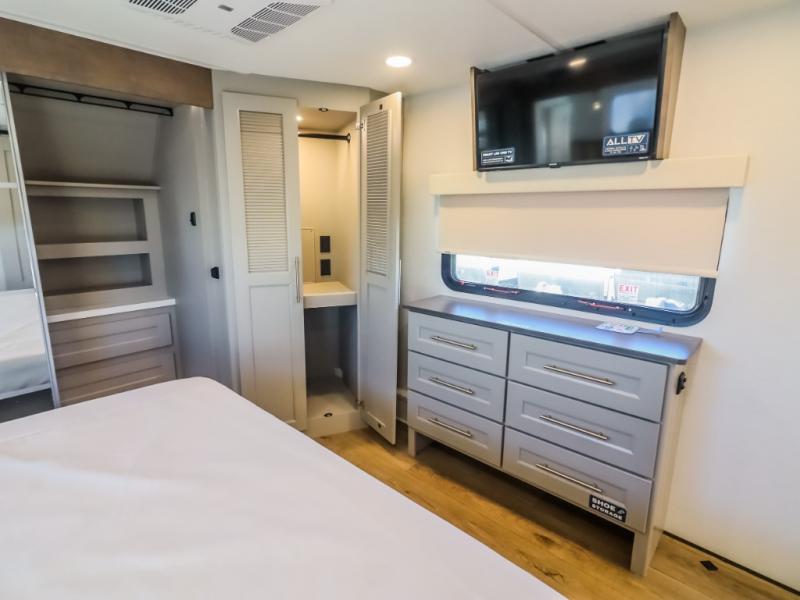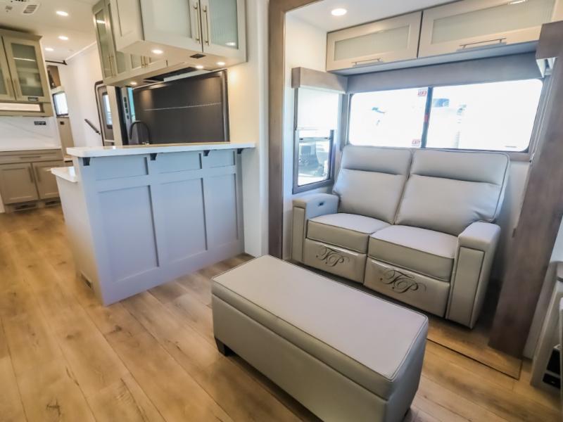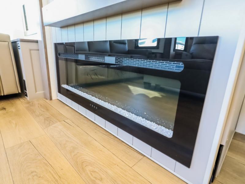 You will fall in love with this unit’s slide patio with picture window, the perfect spot to take in the breathtaking views. Enjoy outdoor cooking with the countertop prep area and pull-out grill, while the drop-down TV provides entertainment for all. Inside, rear living area features two sleeper sofas, perfect for lounging and relaxing. Overhead cabinets provide ample storage, while the 50” class smart TV offers endless entertainment options. Gather around the turn table dinette for meals or socializing. The kitchen is fully equipped with a microwave, sink, refrigerator, pantry, and hutch, making meal preparation and storage a breeze. Also this unit has a full bathroom and a cozy front bedroom which boast a king bed, ample closet, a TV, and so much more!