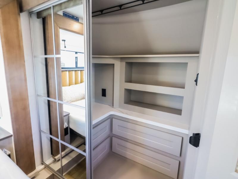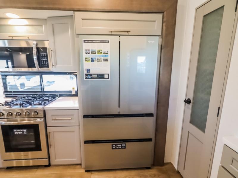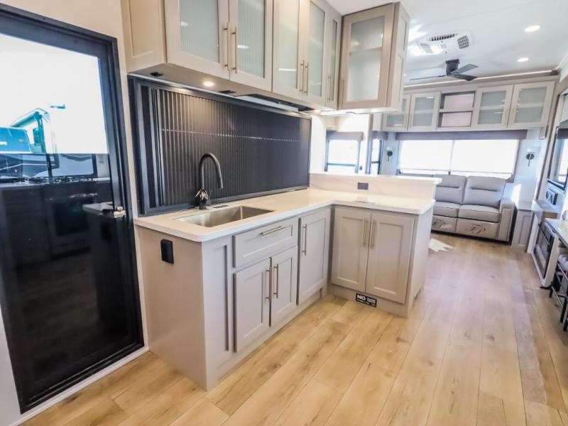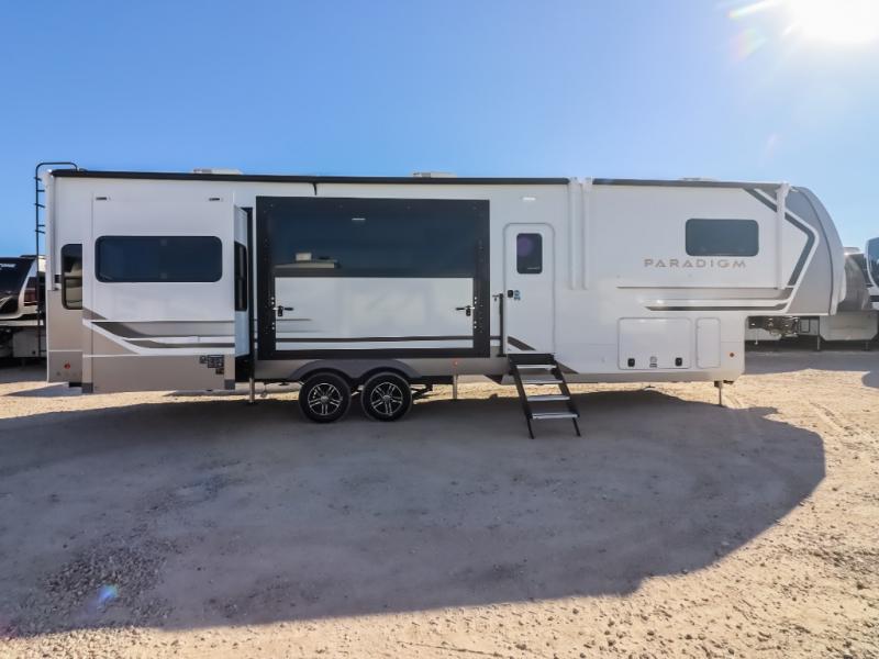 The Paradigm fifth wheels by Alliance RV are functional, high-quality, and luxurious for an unforgettable camping experience. There are three A/C units and a 40K BTU furnace to keep you comfortable year around, and you'll appreciate additional convenient amenities, like the all-in-one enclosed/heated utility center and the color coded and numbered wiring. A Helux Series coil spring pin box comes standard for hassle-free towing, along with Curt 8,000 lb. axles. You'll love the kitchen with its LG solid surface countertops and Lusso range, plus there is LED motion lighting in the pantry and a Maxx fan with a rain sensor to keep everything fresh when making dinner. Each model also includes an HD Smart TV in the living room and bedroom. And of course there are a variety of options you can choose from to further customize your fifth wheel; dual pane windows, Super Solar Plus, slide out awning toppers, and generator prep or a generator to name a few!