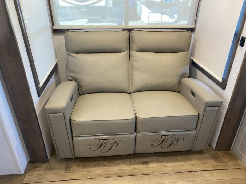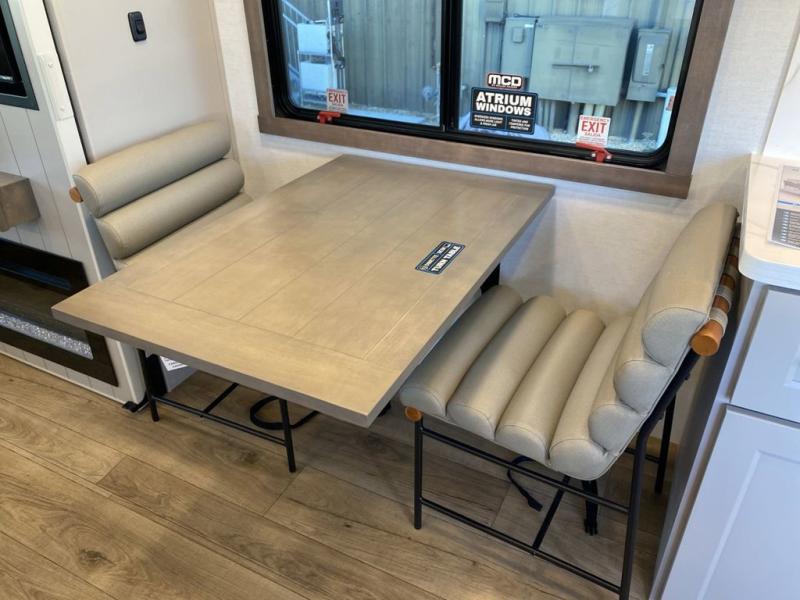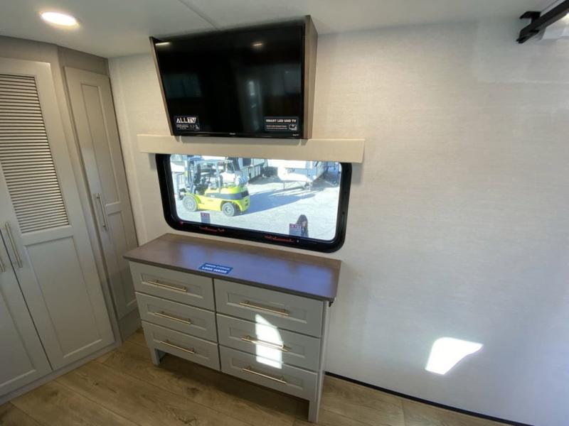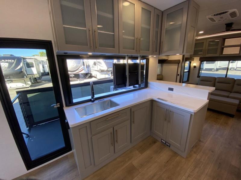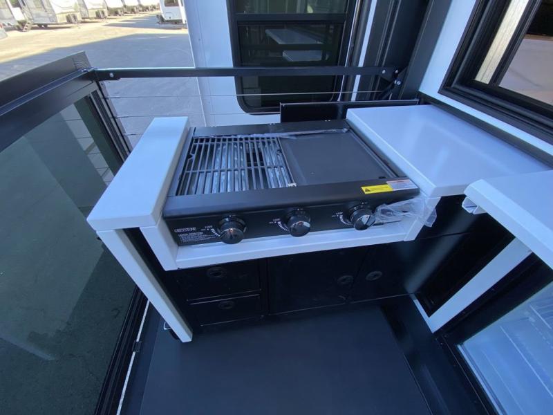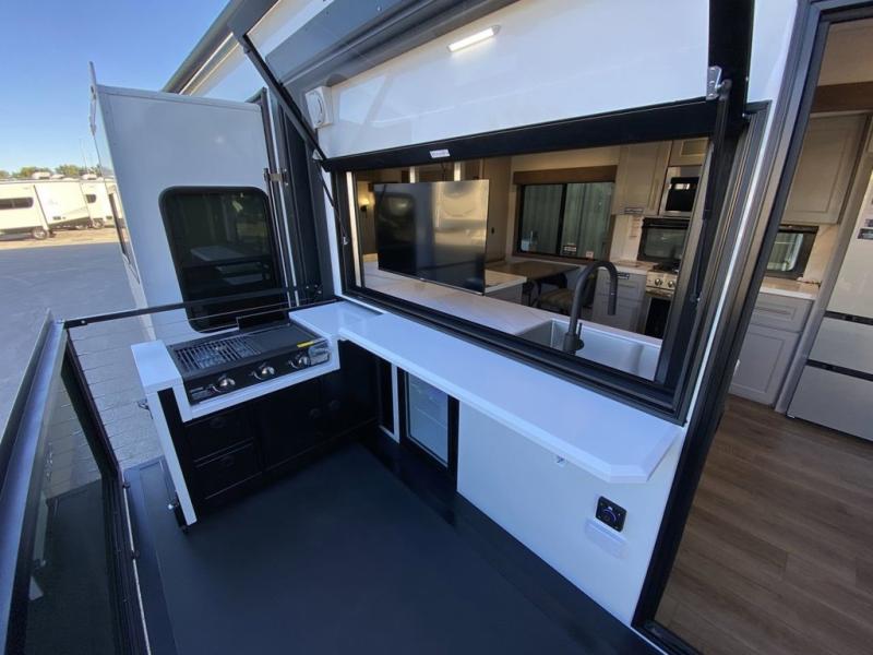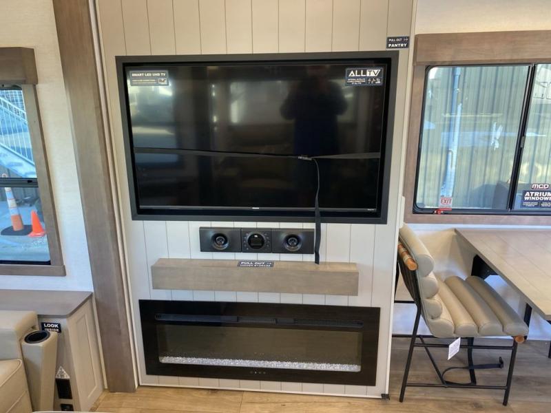 You will fall in love with this unit’s slide patio with picture window, the perfect spot to take in the breathtaking views. Enjoy outdoor cooking with the countertop prep area and pull-out grill, while the drop-down TV provides entertainment for all. Inside, rear living area features two sleeper sofas, perfect for lounging and relaxing. Overhead cabinets provide ample storage, while the 50” class smart TV offers endless entertainment options. Gather around the turn table dinette for meals or socializing. The kitchen is fully equipped with a microwave, sink, refrigerator, pantry, and hutch, making meal preparation and storage a breeze. Also this unit has a full bathroom and a cozy front bedroom which boast a king bed, ample closet, a TV, and so much more!