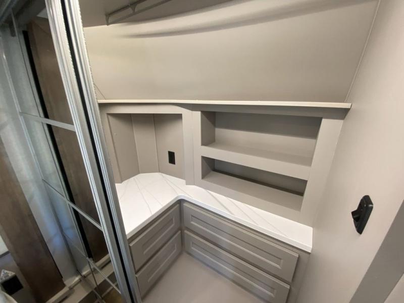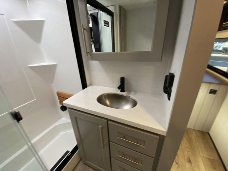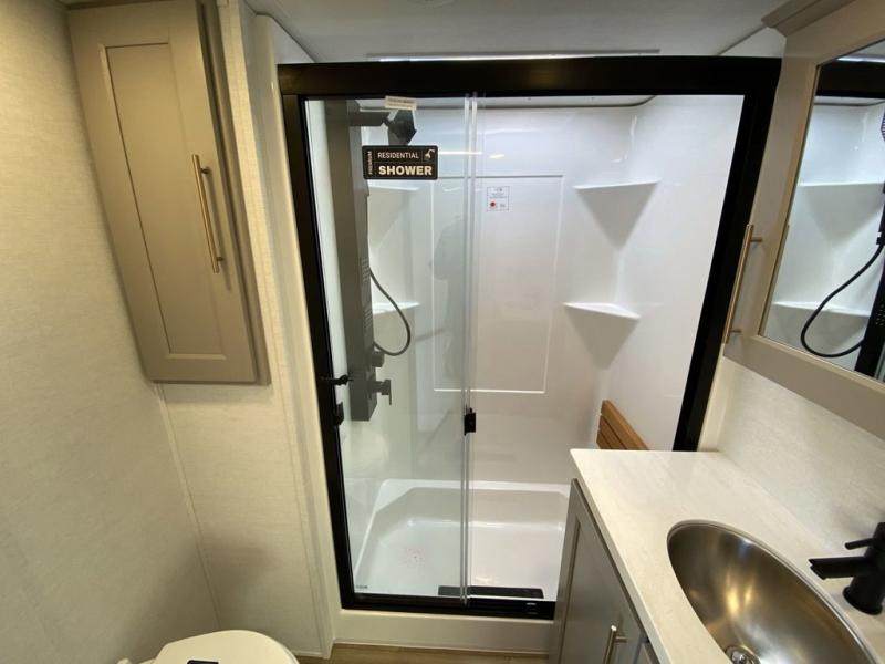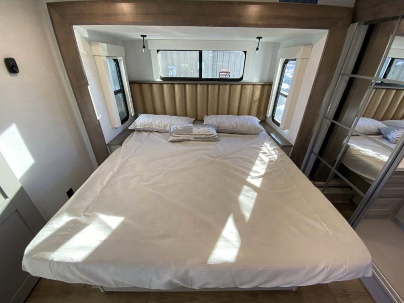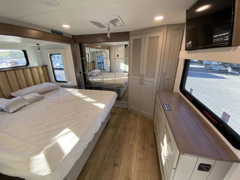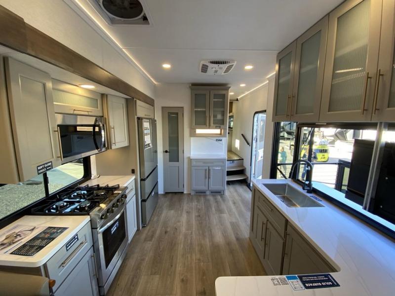 The Paradigm fifth wheels by Alliance RV are functional, high-quality, and luxurious for an unforgettable camping experience. There are three A/C units and a 40K BTU furnace to keep you comfortable year around, and you'll appreciate additional convenient amenities, like the all-in-one enclosed/heated utility center and the color coded and numbered wiring. A Helux Series coil spring pin box comes standard for hassle-free towing, along with Curt 8,000 lb. axles. You'll love the kitchen with its LG solid surface countertops and Lusso range, plus there is LED motion lighting in the pantry and a Maxx fan with a rain sensor to keep everything fresh when making dinner. Each model also includes an HD Smart TV in the living room and bedroom. And of course there are a variety of options you can choose from to further customize your fifth wheel; dual pane windows, Super Solar Plus, slide out awning toppers, and generator prep or a generator to name a few!