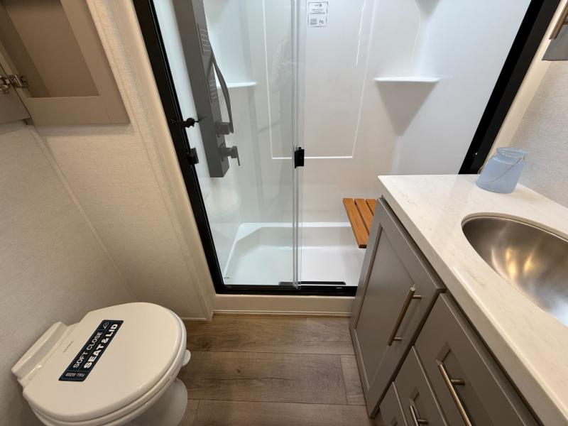 The Paradigm fifth wheels by Alliance RV are functional, high-quality, and luxurious for an unforgettable camping experience. There are three A/C units and a 40K BTU furnace to keep you comfortable year around, and you'll appreciate additional convenient amenities, like the all-in-one enclosed/heated utility center and the color coded and numbered wiring. A Helux Series coil spring pin box comes standard for hassle-free towing, along with Curt 8,000 lb. axles. You'll love the kitchen with its LG solid surface countertops and Lusso range, plus there is LED motion lighting in the pantry and a Maxx fan with a rain sensor to keep everything fresh when making dinner. Each model also includes an HD Smart TV in the living room and bedroom. And of course there are a variety of options you can choose from to further customize your fifth wheel; dual pane windows, Super Solar Plus, slide out awning toppers, and generator prep or a generator to name a few!