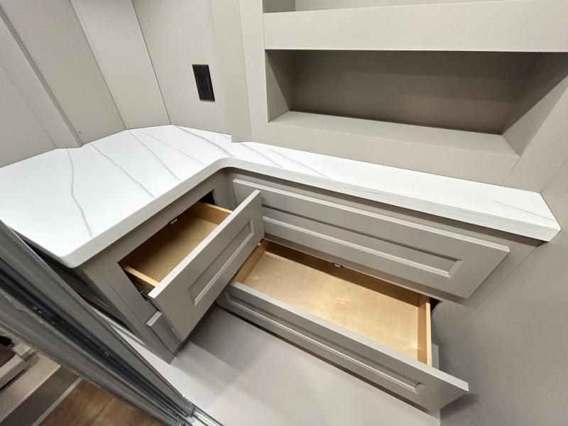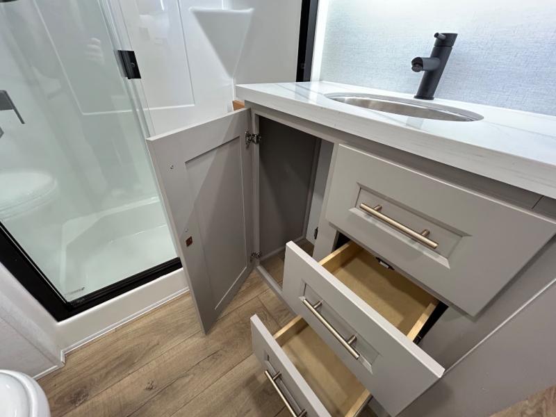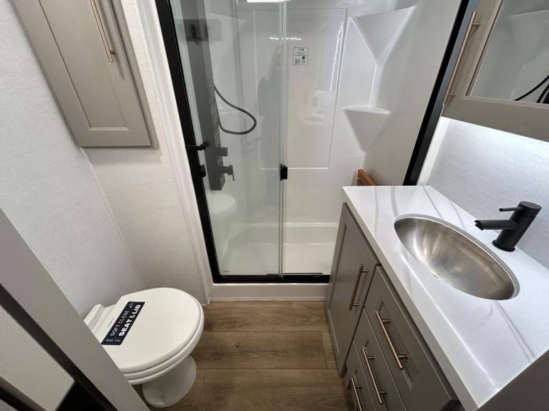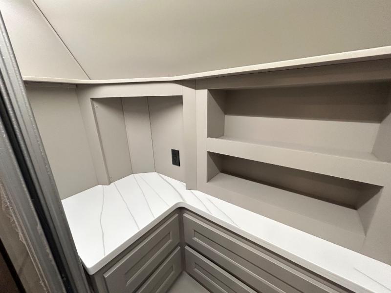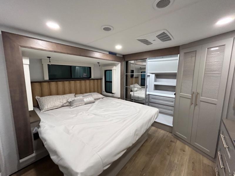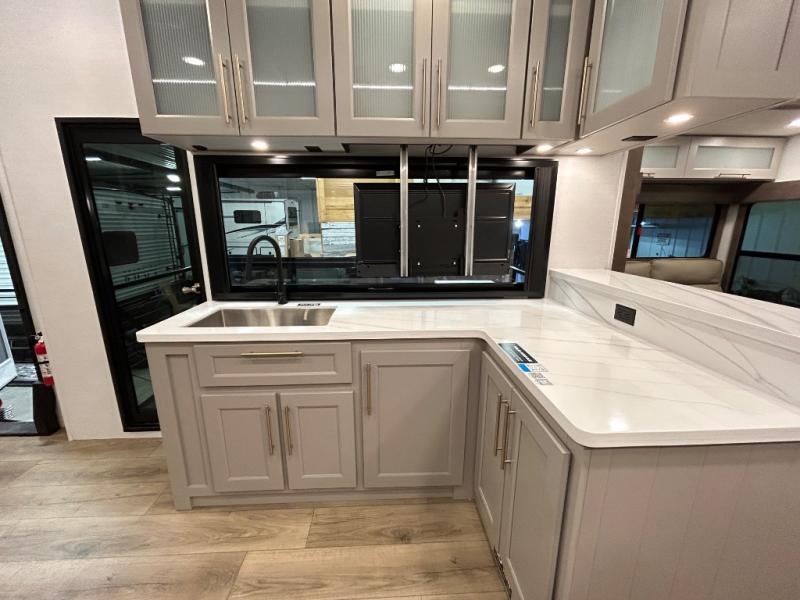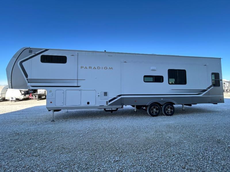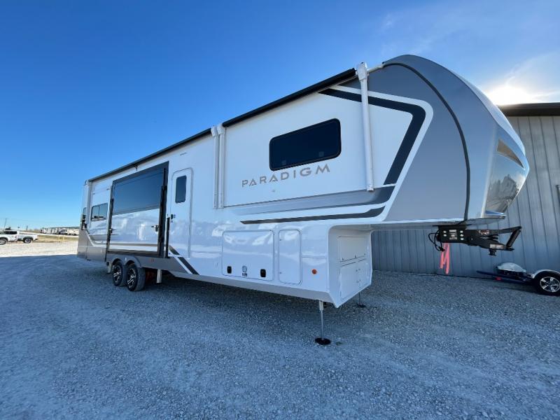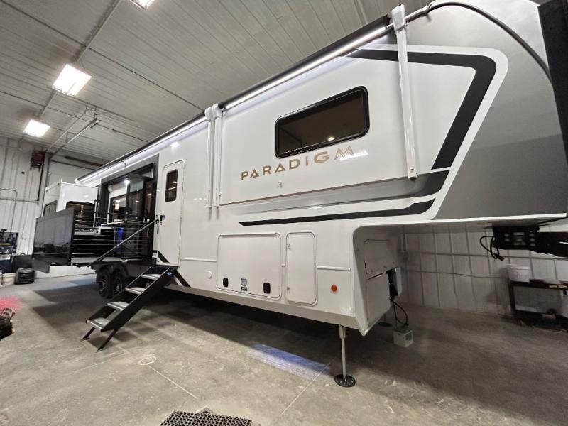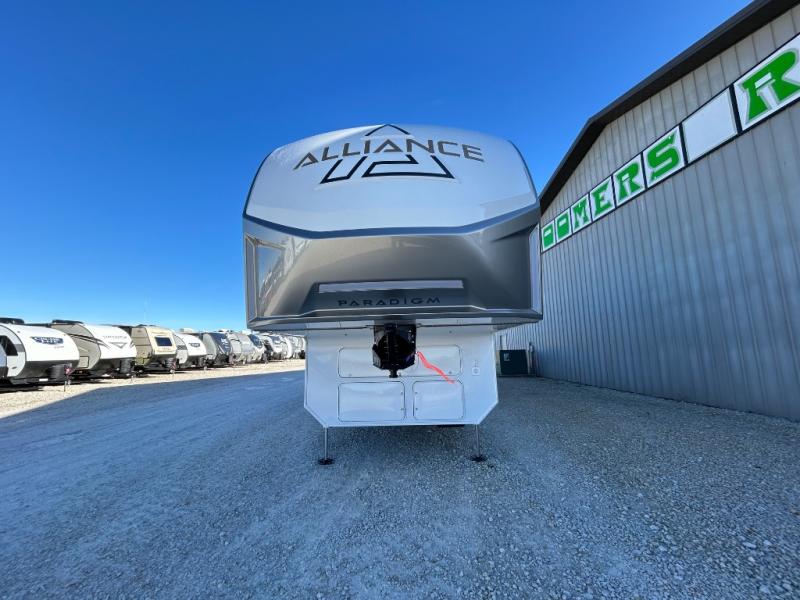 The Paradigm fifth wheels by Alliance RV are functional, high-quality, and luxurious for an unforgettable camping experience. There are three A/C units and a 40K BTU furnace to keep you comfortable year around, and you'll appreciate additional convenient amenities, like the all-in-one enclosed/heated utility center and the color coded and numbered wiring. A Helux Series coil spring pin box comes standard for hassle-free towing, along with Curt 8,000 lb. axles. You'll love the kitchen with its LG solid surface countertops and Lusso range, plus there is LED motion lighting in the pantry and a Maxx fan with a rain sensor to keep everything fresh when making dinner. Each model also includes an HD Smart TV in the living room and bedroom. And of course there are a variety of options you can choose from to further customize your fifth wheel; dual pane windows, Super Solar Plus, slide out awning toppers, and generator prep or a generator to name a few!