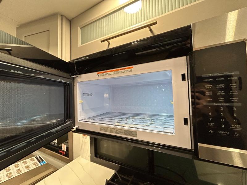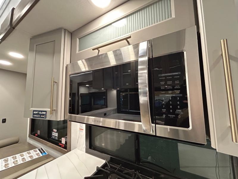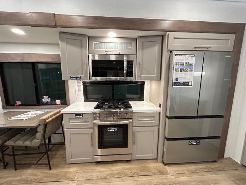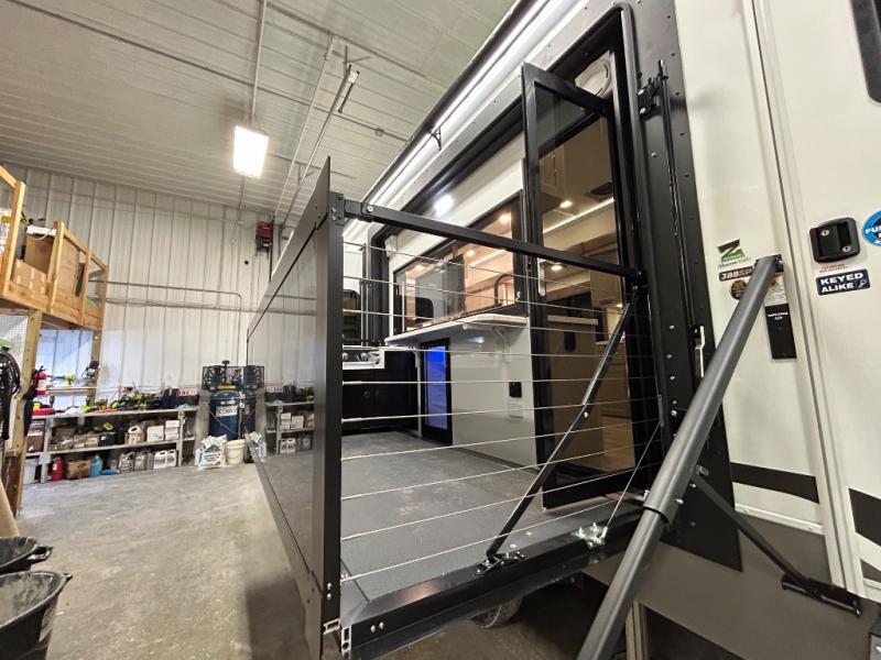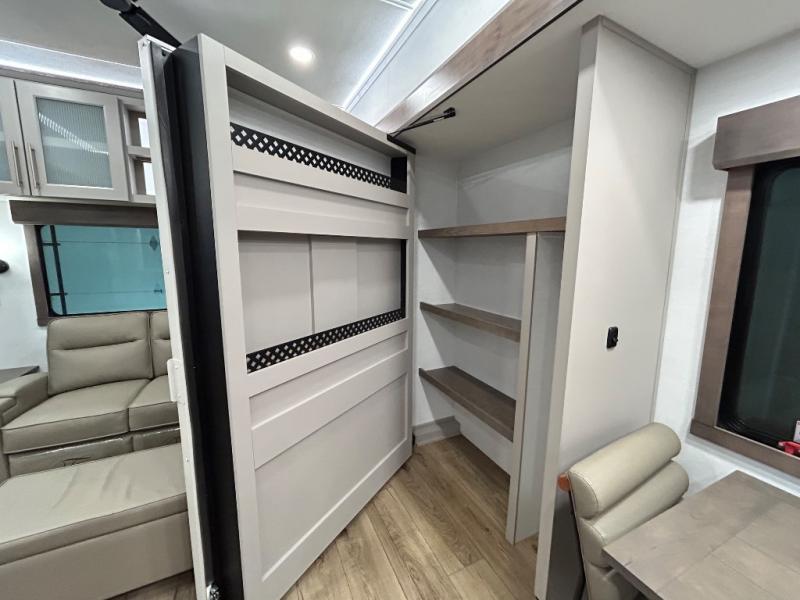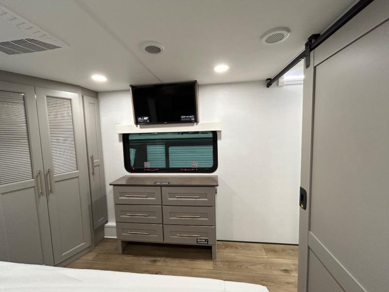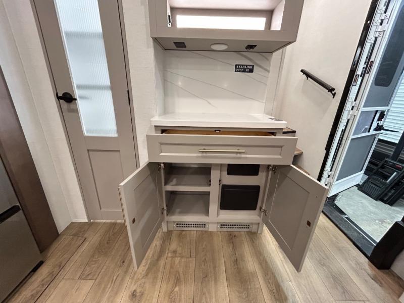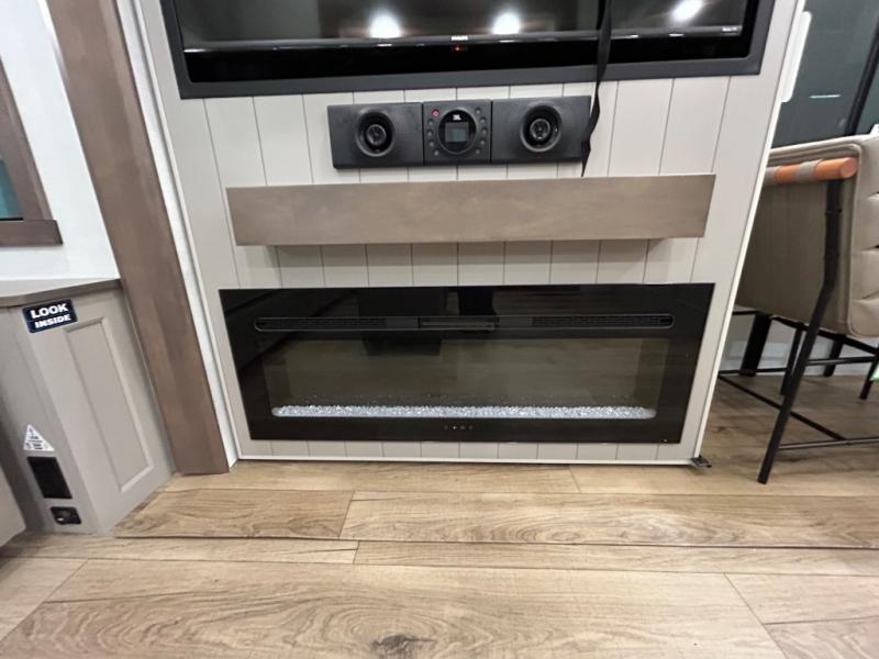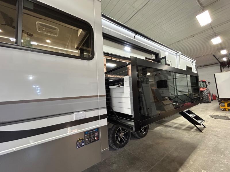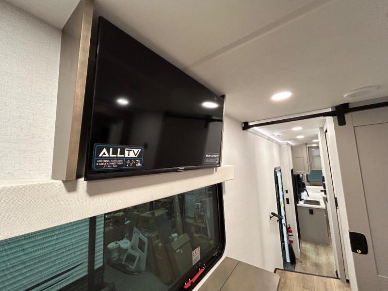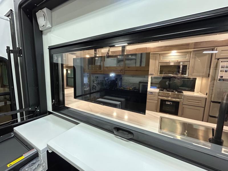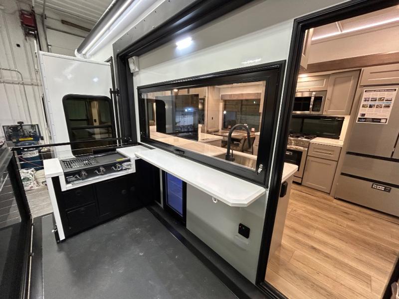 You will fall in love with this unit’s slide patio with picture window, the perfect spot to take in the breathtaking views. Enjoy outdoor cooking with the countertop prep area and pull-out grill, while the drop-down TV provides entertainment for all. Inside, rear living area features two sleeper sofas, perfect for lounging and relaxing. Overhead cabinets provide ample storage, while the 50” class smart TV offers endless entertainment options. Gather around the turn table dinette for meals or socializing. The kitchen is fully equipped with a microwave, sink, refrigerator, pantry, and hutch, making meal preparation and storage a breeze. Also this unit has a full bathroom and a cozy front bedroom which boast a king bed, ample closet, a TV, and so much more!