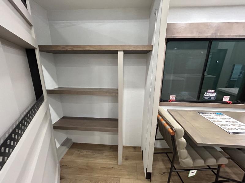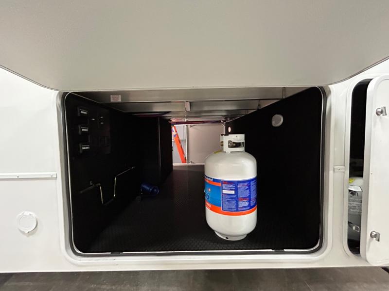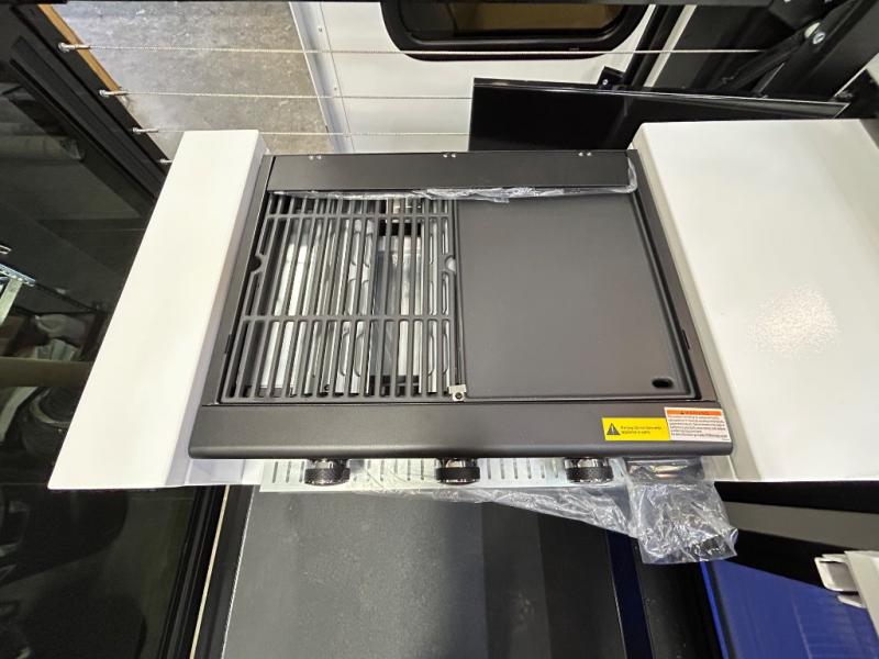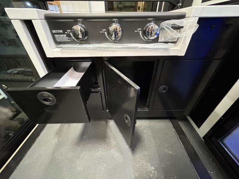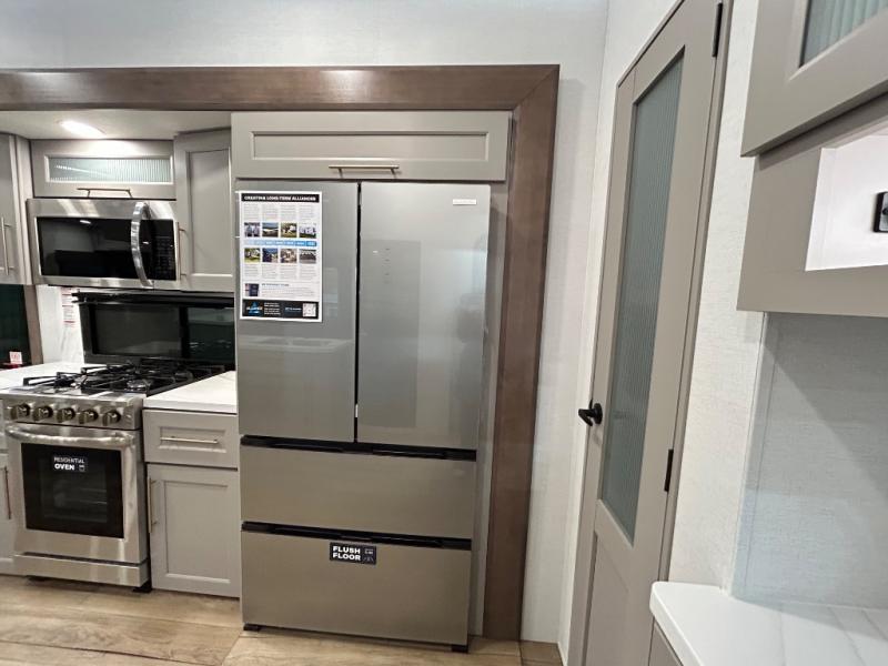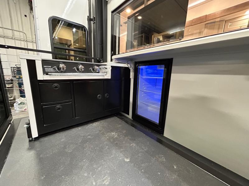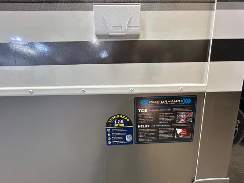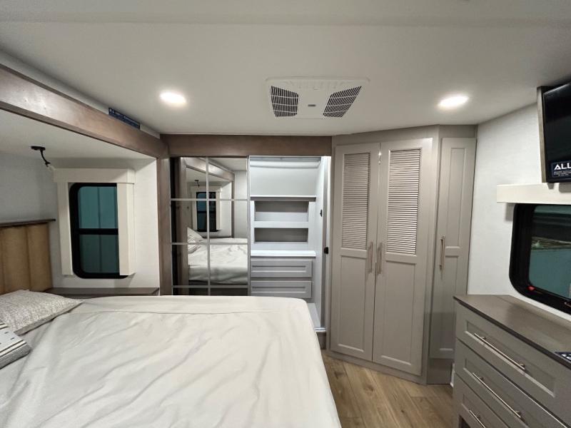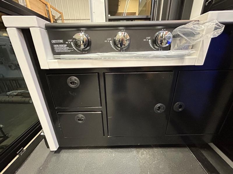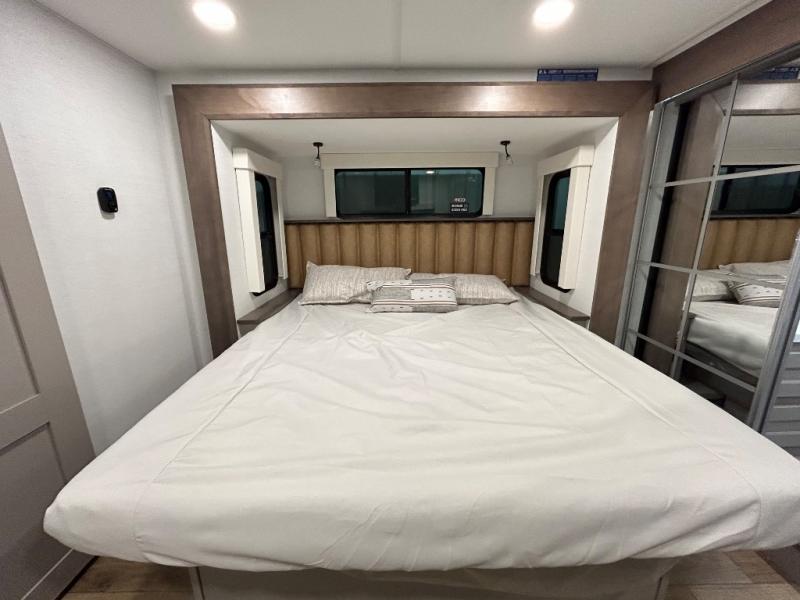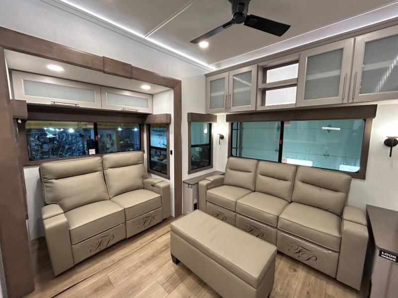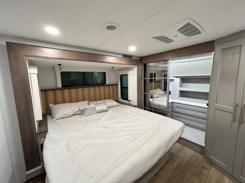 You will fall in love with this unit’s slide patio with picture window, the perfect spot to take in the breathtaking views. Enjoy outdoor cooking with the countertop prep area and pull-out grill, while the drop-down TV provides entertainment for all. Inside, rear living area features two sleeper sofas, perfect for lounging and relaxing. Overhead cabinets provide ample storage, while the 50” class smart TV offers endless entertainment options. Gather around the turn table dinette for meals or socializing. The kitchen is fully equipped with a microwave, sink, refrigerator, pantry, and hutch, making meal preparation and storage a breeze. Also this unit has a full bathroom and a cozy front bedroom which boast a king bed, ample closet, a TV, and so much more!