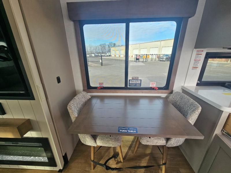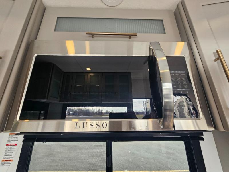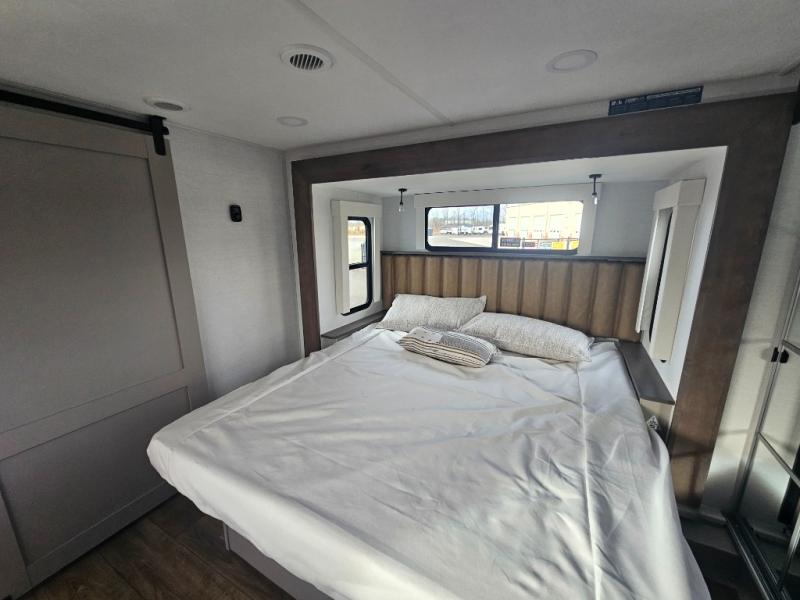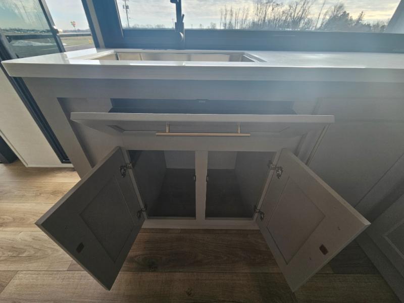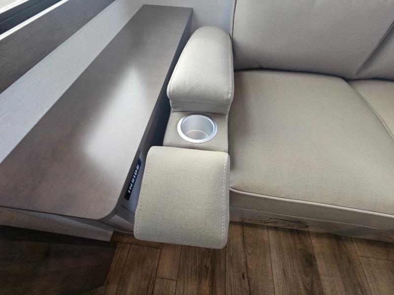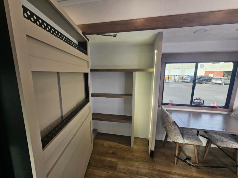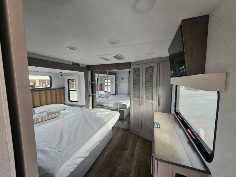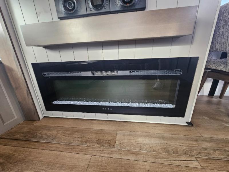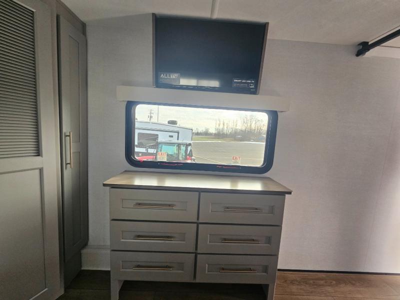 You will fall in love with this unit’s slide patio with picture window, the perfect spot to take in the breathtaking views. Enjoy outdoor cooking with the countertop prep area and pull-out grill, while the drop-down TV provides entertainment for all. Inside, rear living area features two sleeper sofas, perfect for lounging and relaxing. Overhead cabinets provide ample storage, while the 50” class smart TV offers endless entertainment options. Gather around the turn table dinette for meals or socializing. The kitchen is fully equipped with a microwave, sink, refrigerator, pantry, and hutch, making meal preparation and storage a breeze. Also this unit has a full bathroom and a cozy front bedroom which boast a king bed, ample closet, a TV, and so much more!