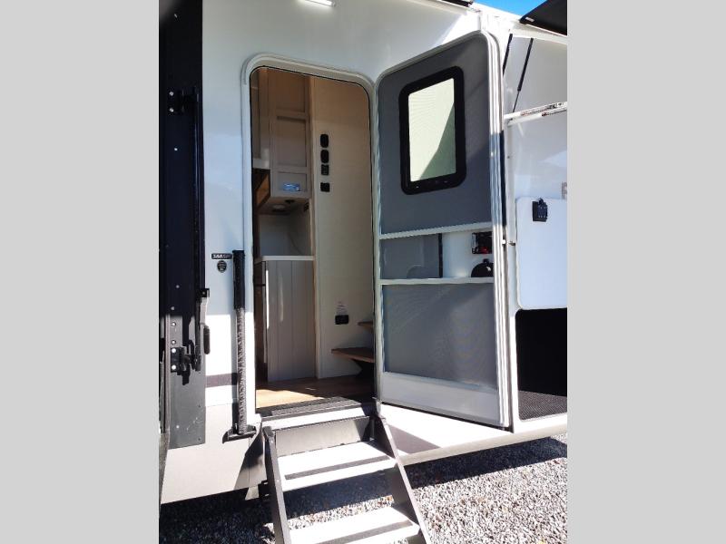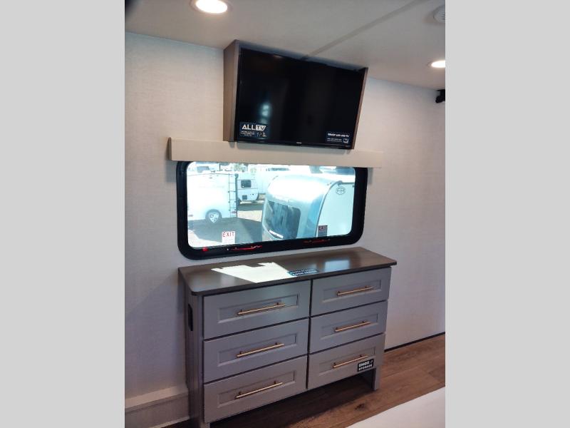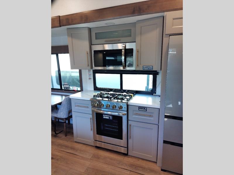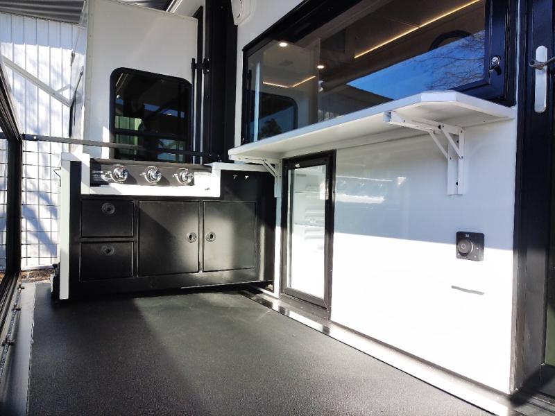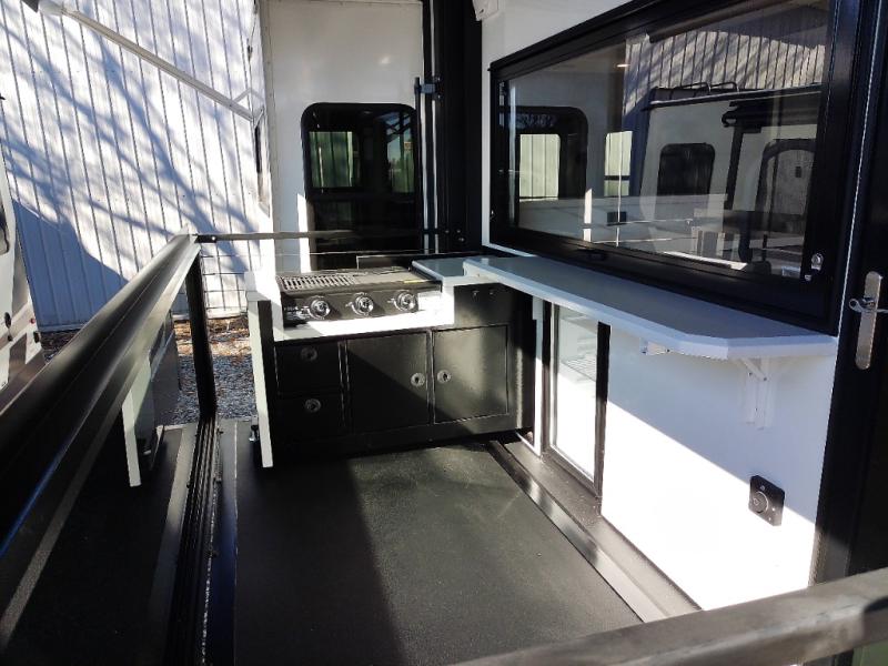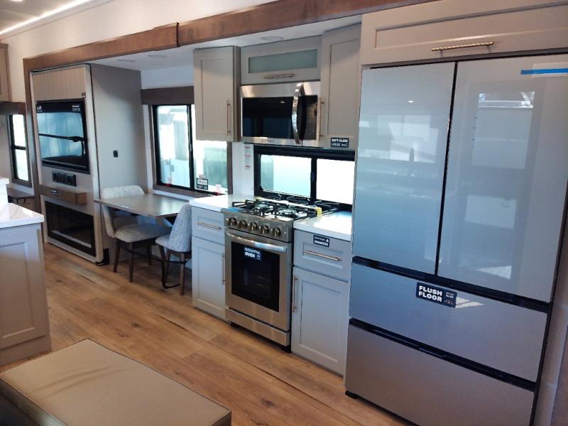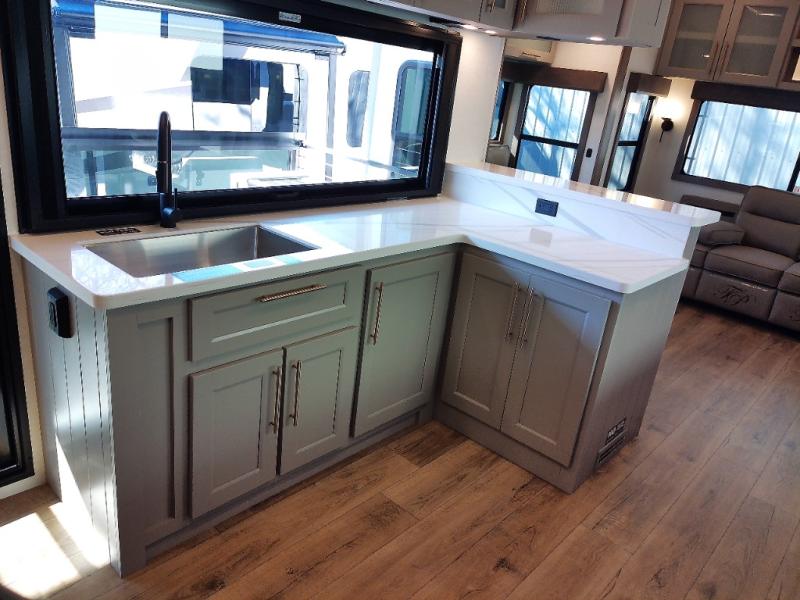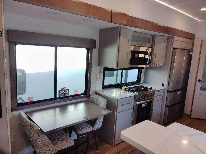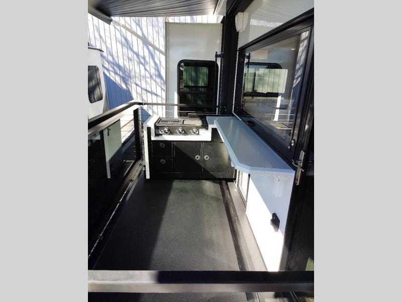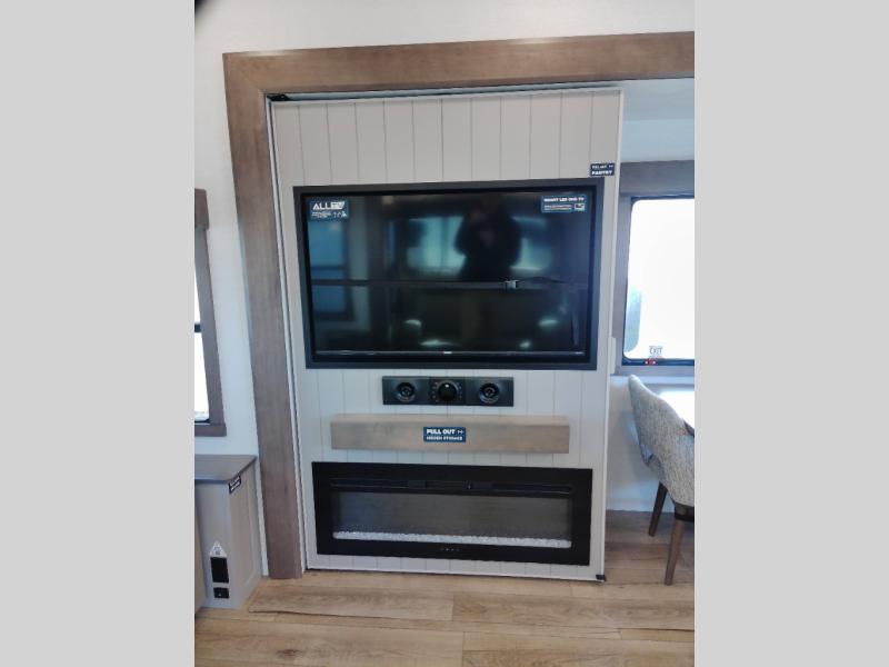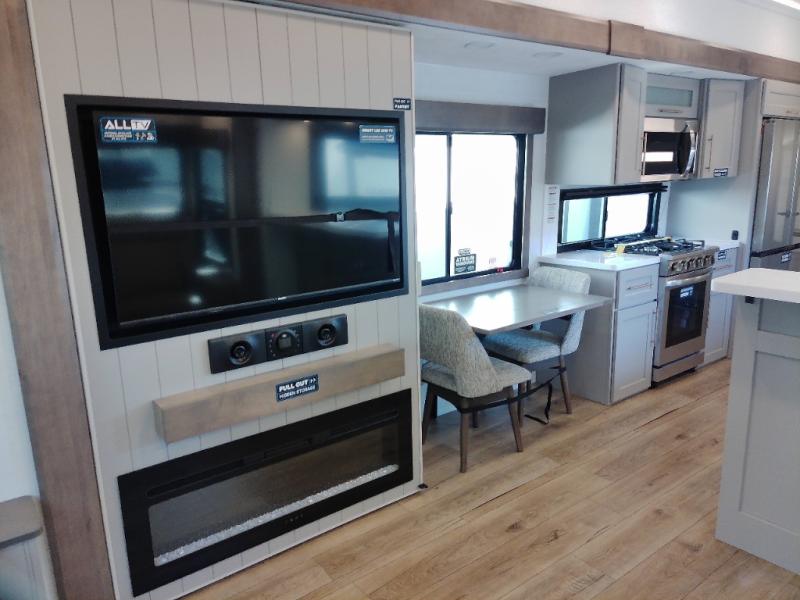 You will fall in love with this unit’s slide patio with picture window, the perfect spot to take in the breathtaking views. Enjoy outdoor cooking with the countertop prep area and pull-out grill, while the drop-down TV provides entertainment for all. Inside, rear living area features two sleeper sofas, perfect for lounging and relaxing. Overhead cabinets provide ample storage, while the 50” class smart TV offers endless entertainment options. Gather around the turn table dinette for meals or socializing. The kitchen is fully equipped with a microwave, sink, refrigerator, pantry, and hutch, making meal preparation and storage a breeze. Also this unit has a full bathroom and a cozy front bedroom which boast a king bed, ample closet, a TV, and so much more!