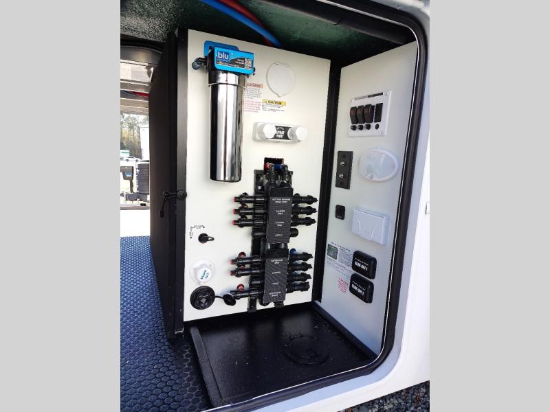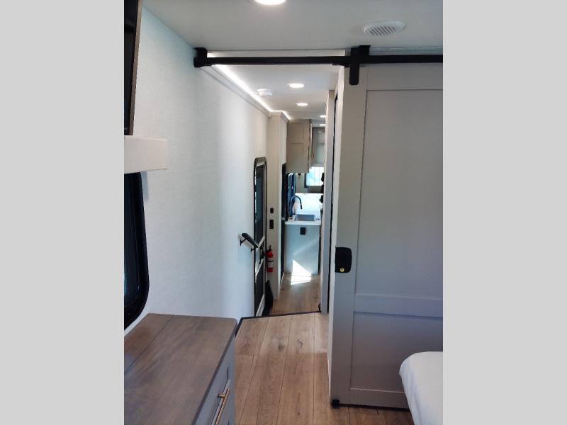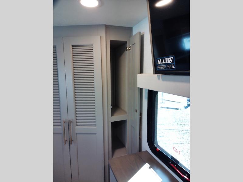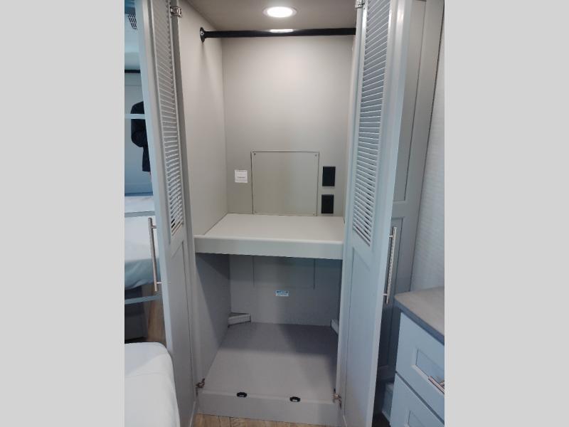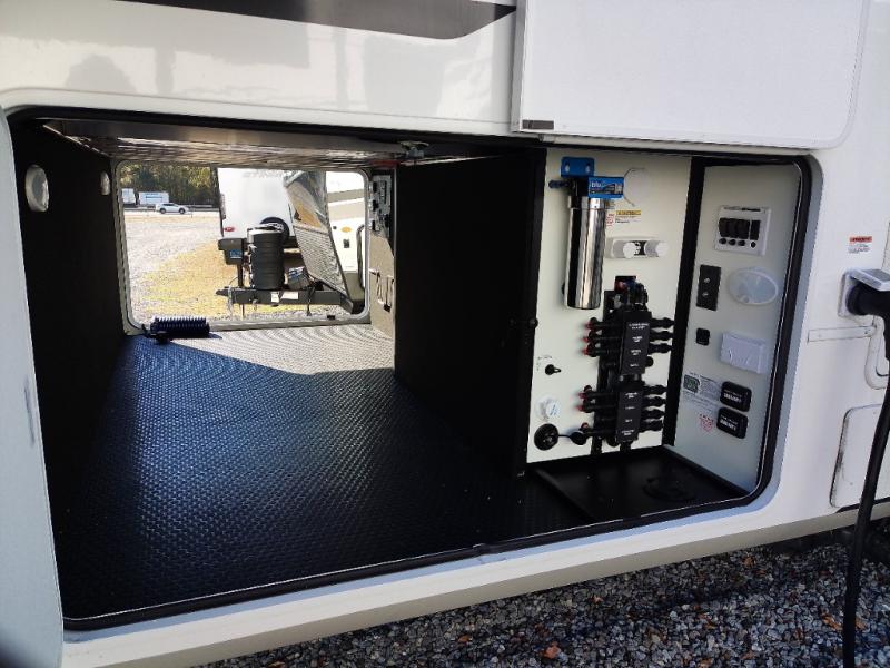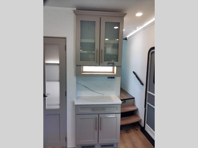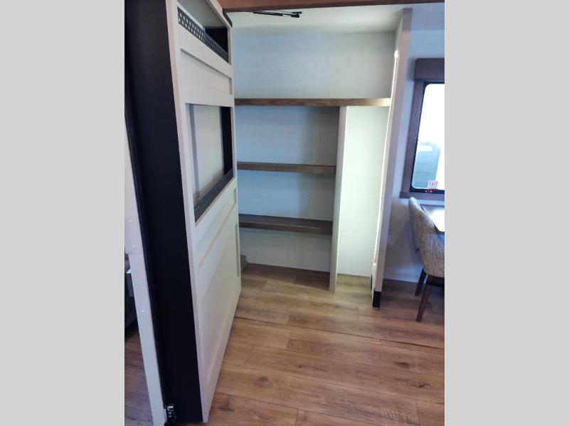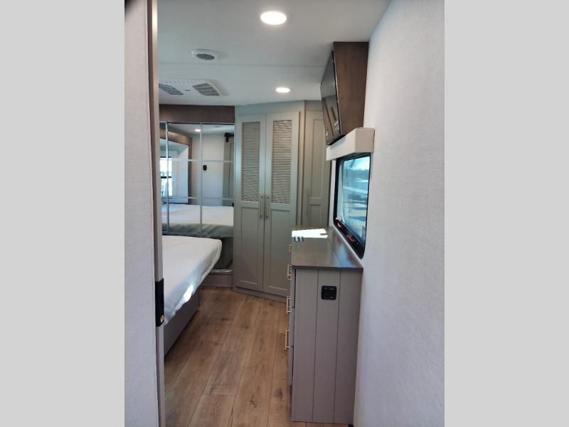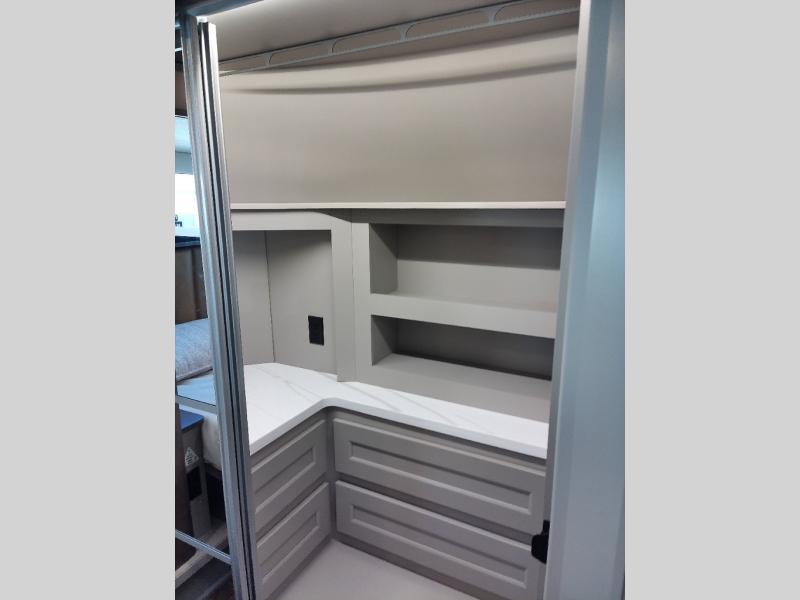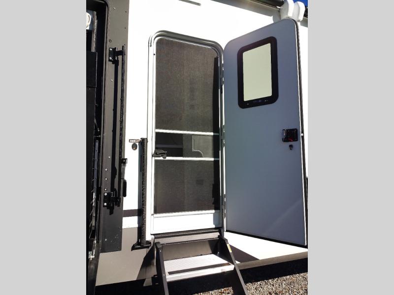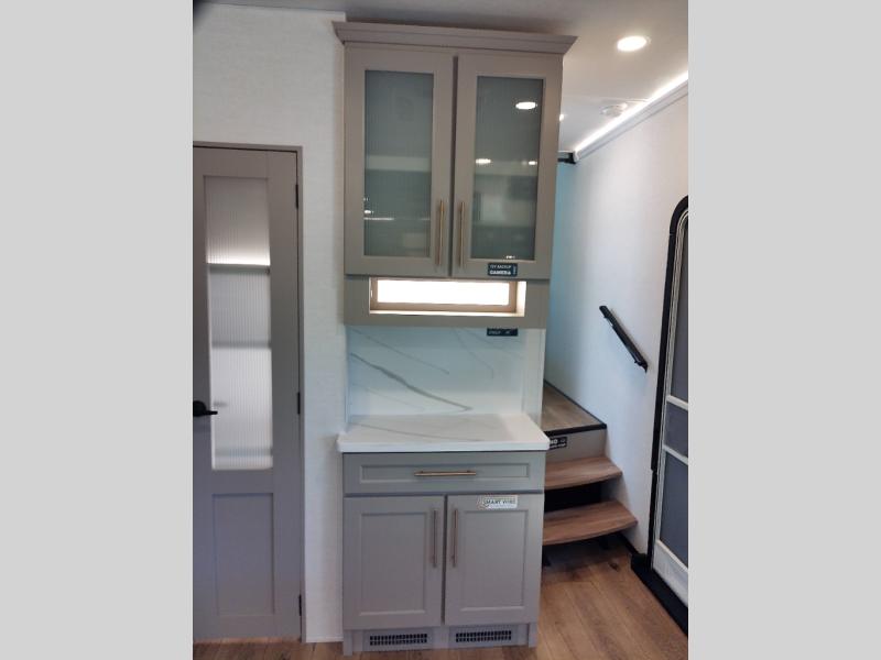 You will fall in love with this unit’s slide patio with picture window, the perfect spot to take in the breathtaking views. Enjoy outdoor cooking with the countertop prep area and pull-out grill, while the drop-down TV provides entertainment for all. Inside, rear living area features two sleeper sofas, perfect for lounging and relaxing. Overhead cabinets provide ample storage, while the 50” class smart TV offers endless entertainment options. Gather around the turn table dinette for meals or socializing. The kitchen is fully equipped with a microwave, sink, refrigerator, pantry, and hutch, making meal preparation and storage a breeze. Also this unit has a full bathroom and a cozy front bedroom which boast a king bed, ample closet, a TV, and so much more!