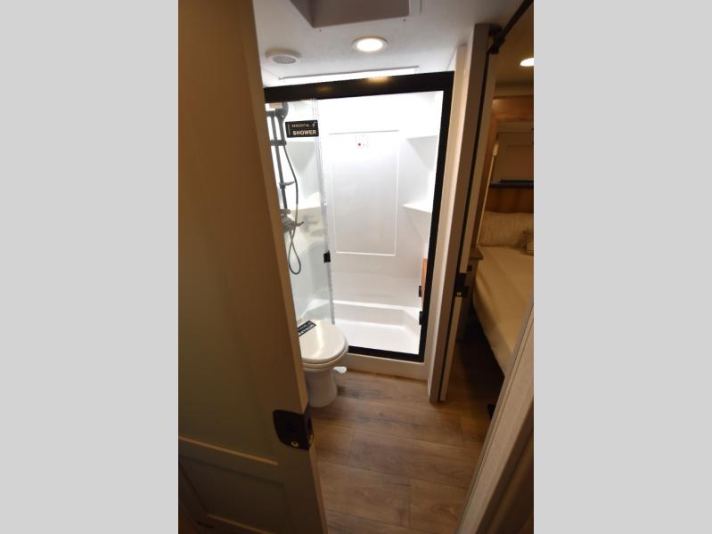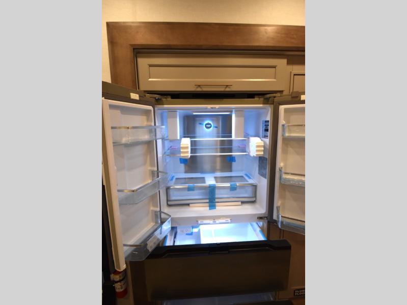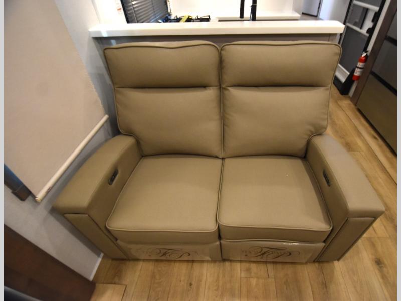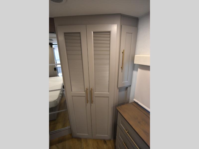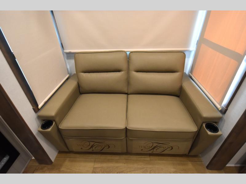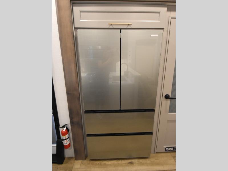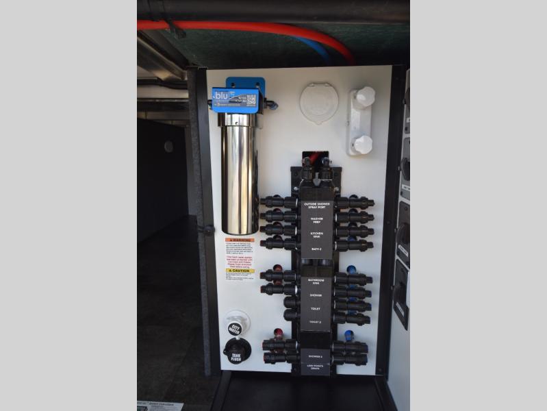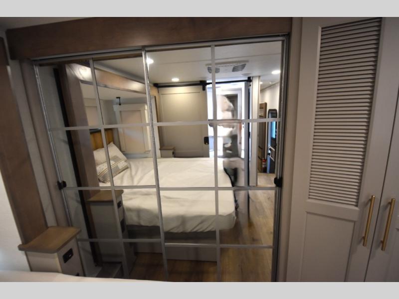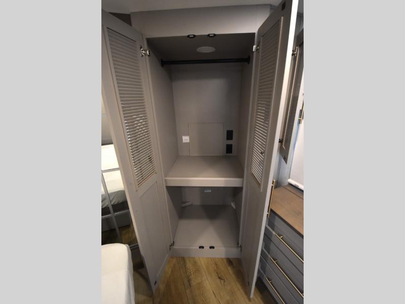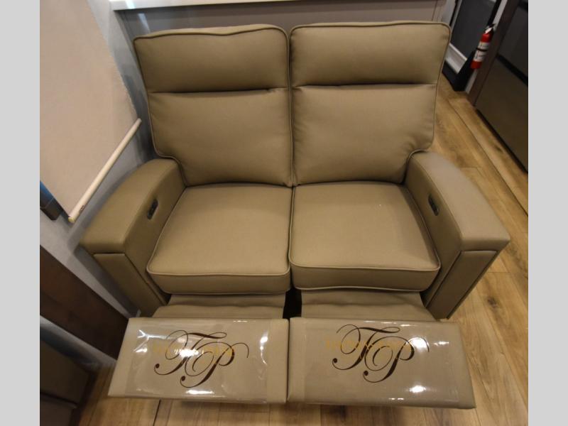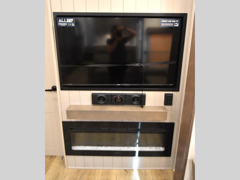 A spacious unit with sleeping for eight with plenty of choices to suit everyone! There is a front private bedroom with a king size bed that offers a large full front closet that has also been prepped for a washer and dryer if you choose that option. The front bath features a 40" x 30" shower and dual entry. Head down to the kitchen and living space at the bottom of the stairs to find a curbside slide that houses the 19 cu. ft. residential refrigerator, a pantry, and a swivel table and desk. As you continue on toward the rear of this coach, you will find a spacious living area along the roadside with a 50" Smart TV and a fireplace, a sofa sleeper slide, and a dual reclining loveseat. This makes a great gathering place for television watching, game playing, and even added sleeping space if needed at night. The rear private bedroom with its own private bath features a queen bed, two closets, and a Smart TV as well. The multipurpose loft area above can be accessed just before this rear bedroom entry by a ladder, and it is perfect for extra storage, or it can be used for added sleeping that the kiddos are sure to love.