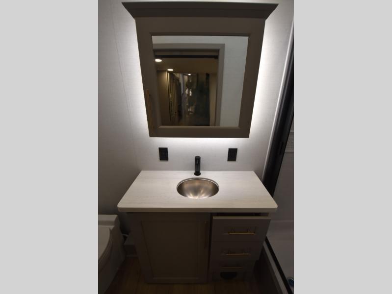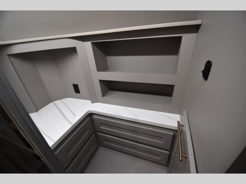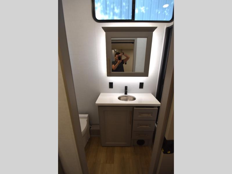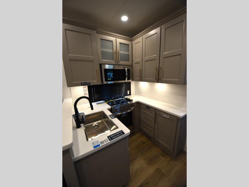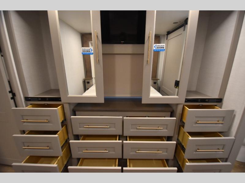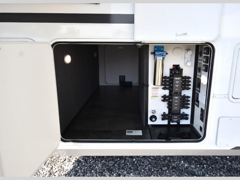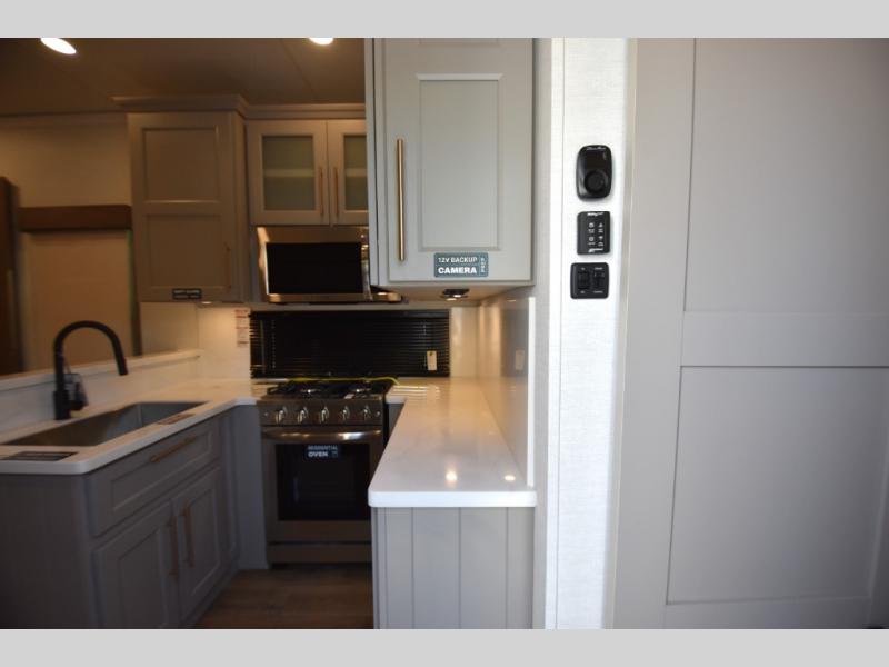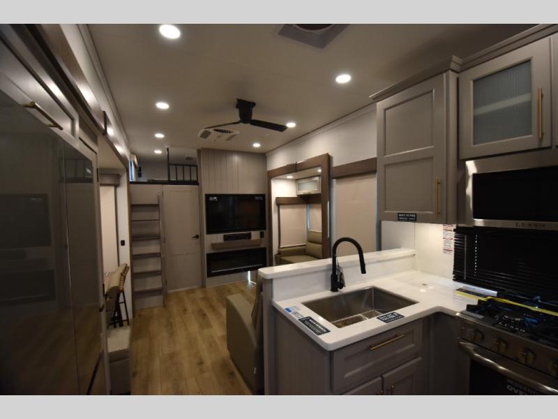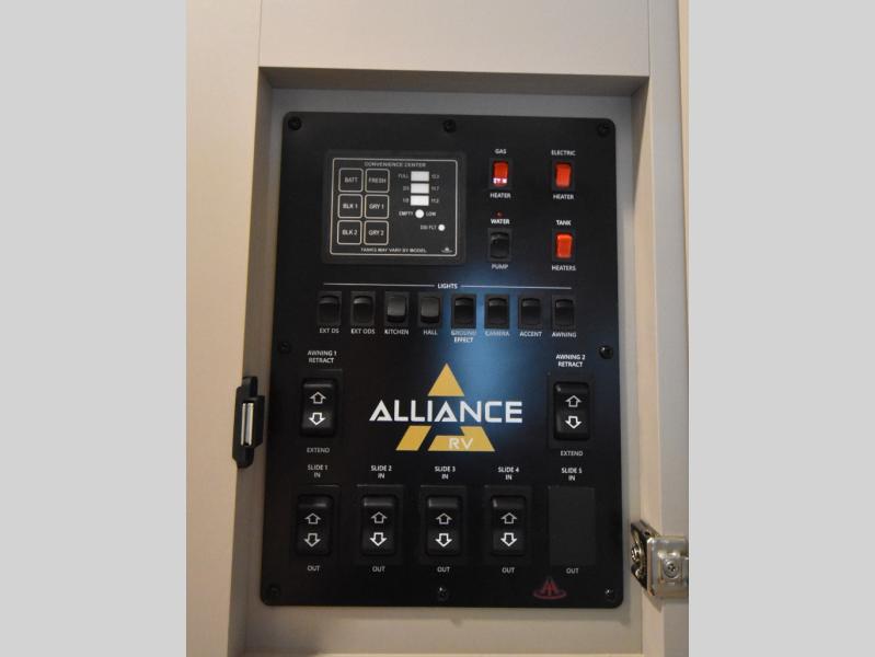 The Paradigm fifth wheels by Alliance RV are functional, high-quality, and luxurious for an unforgettable camping experience. There are three A/C units and a 40K BTU furnace to keep you comfortable year around, and you'll appreciate additional convenient amenities, like the all-in-one enclosed/heated utility center and the color coded and numbered wiring. A Rota-Flex pin box comes standard for hassle-free towing, along with Super-G 4,400 lb. rated tires and Dexter 7,000 lb. axles. You'll love the kitchen with its LG solid surface countertops and Lusso range, plus there is LED motion lighting in the pantry and a Maxx fan with a rain sensor to keep everything fresh when making dinner. Each model also includes an HD Smart TV in the living room and bedroom, plus a Winegard Air 360 antenna to keep you connected to the outside world. And of course there are a variety of options you can choose from to further customize your fifth wheel; dual pane windows, Super Solar Plus, slide out awning toppers, and generator prep or a generator to name a few!