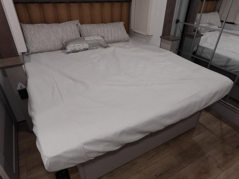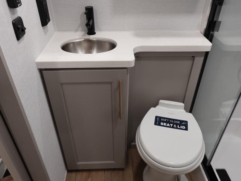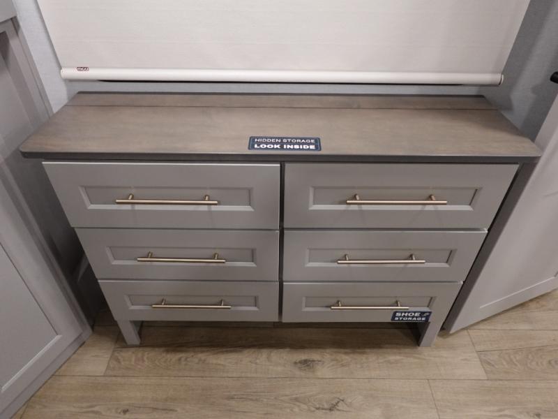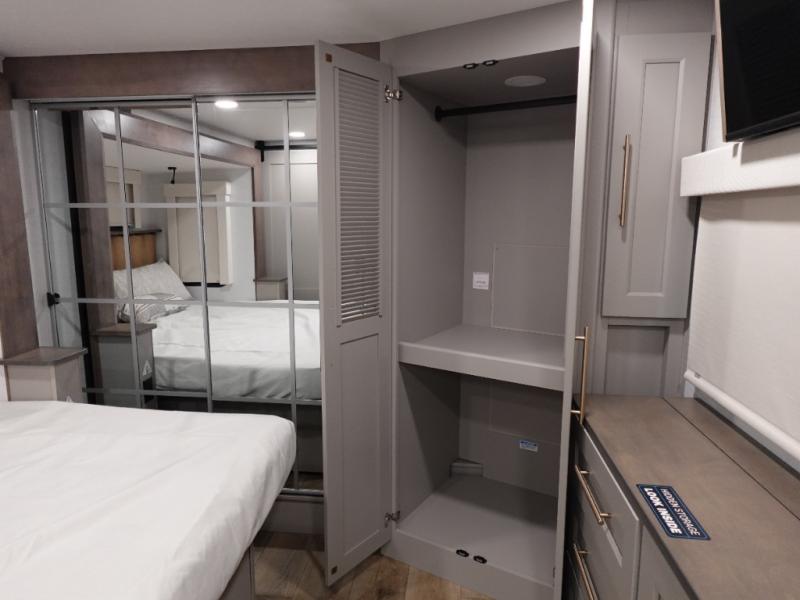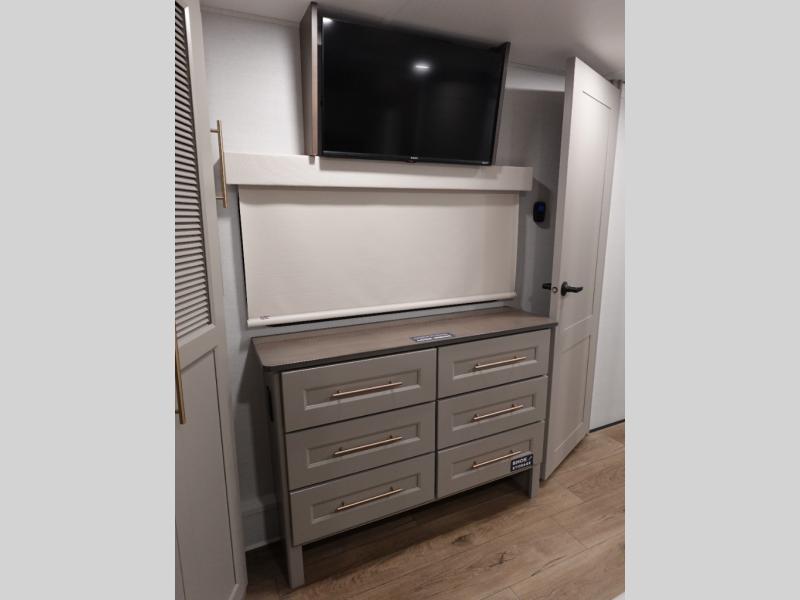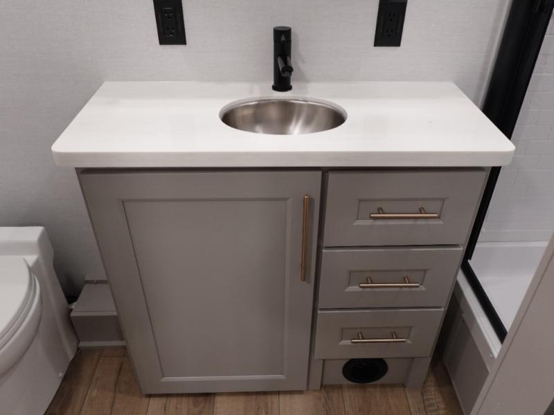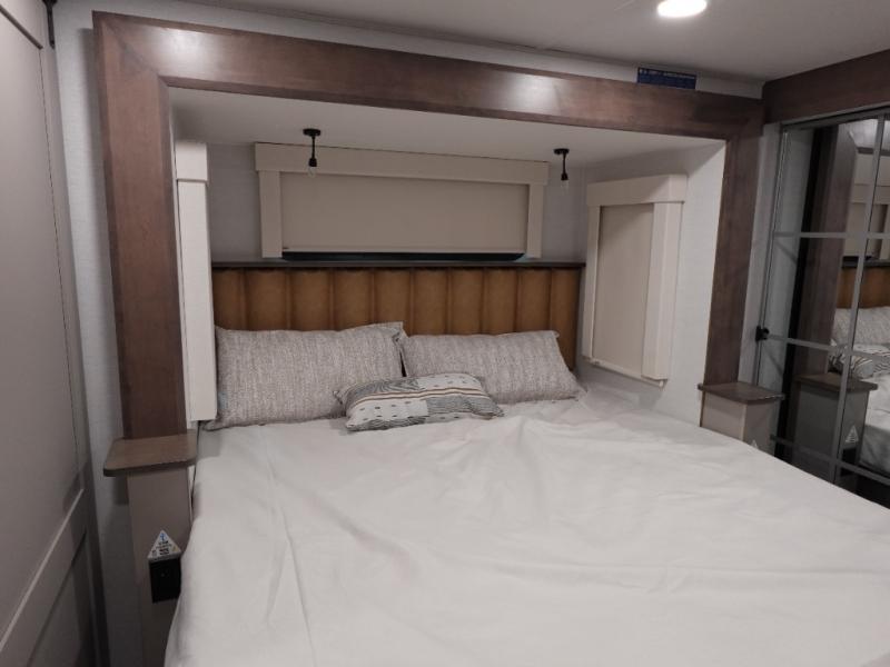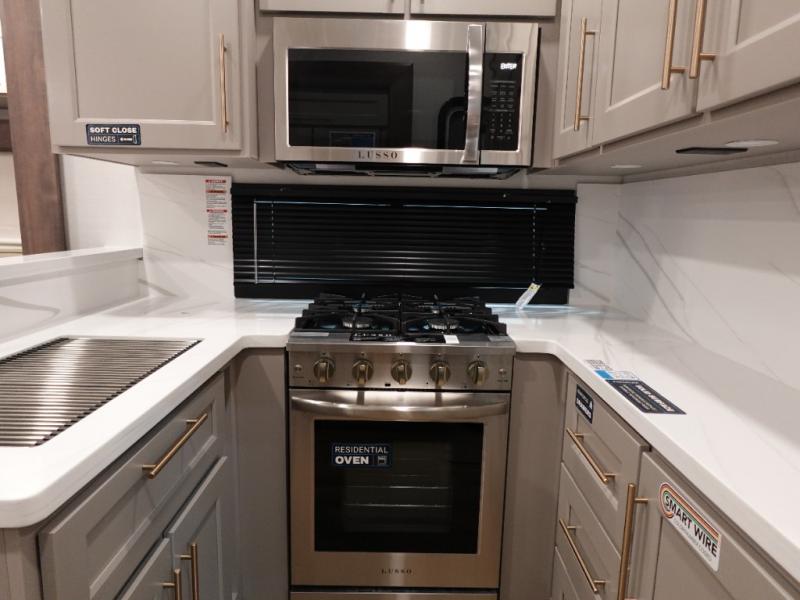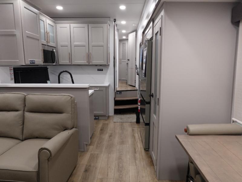 The Paradigm fifth wheels by Alliance RV are functional, high-quality, and luxurious for an unforgettable camping experience. There are three A/C units and a 40K BTU furnace to keep you comfortable year around, and you'll appreciate additional convenient amenities, like the all-in-one enclosed/heated utility center and the color coded and numbered wiring. A Helux Series coil spring pin box comes standard for hassle-free towing, along with Super-G 4,400 lb. rated tires and Dexter 7,000 lb. axles. You'll love the kitchen with its LG solid surface countertops and Lusso range, plus there is LED motion lighting in the pantry and a Maxx fan with a rain sensor to keep everything fresh when making dinner. Each model also includes an HD Smart TV in the living room and bedroom, plus a Winegard Air 360 antenna to keep you connected to the outside world.