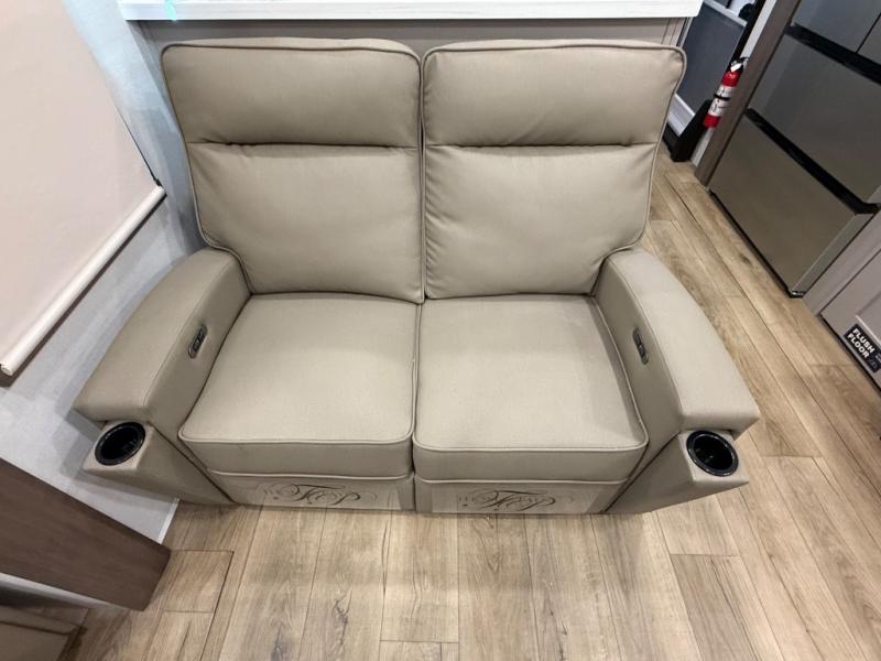 Spacious Living Area – Features plush seating, a tri-fold sofa, theater seats, and a large entertainment center with fireplace.