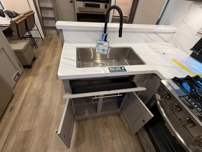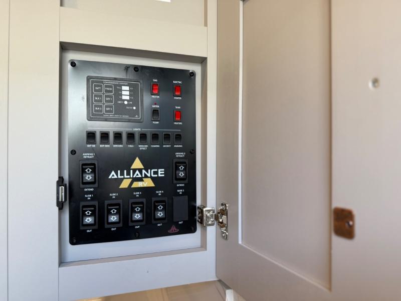 The Paradigm fifth wheels by Alliance RV are functional, high-quality, and luxurious for an unforgettable camping experience. There are three A/C units and a 40K BTU furnace to keep you comfortable year around, and you'll appreciate additional convenient amenities, like the all-in-one enclosed/heated utility center and the color coded and numbered wiring. A Helux Series coil spring pin box comes standard for hassle-free towing, along with Super-G 4,400 lb. rated tires and Dexter 7,000 lb. axles. You'll love the kitchen with its LG solid surface countertops and Lusso range, plus there is LED motion lighting in the pantry and a Maxx fan with a rain sensor to keep everything fresh when making dinner. Each model also includes an HD Smart TV in the living room and bedroom, plus a Winegard Air 360 antenna to keep you connected to the outside world. And of course there are a variety of options you can choose from to further customize your fifth wheel; dual pane windows, Super Solar Plus, slide out awning toppers, and generator prep or a generator to name a few!