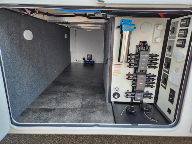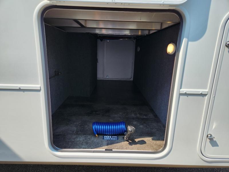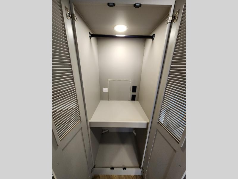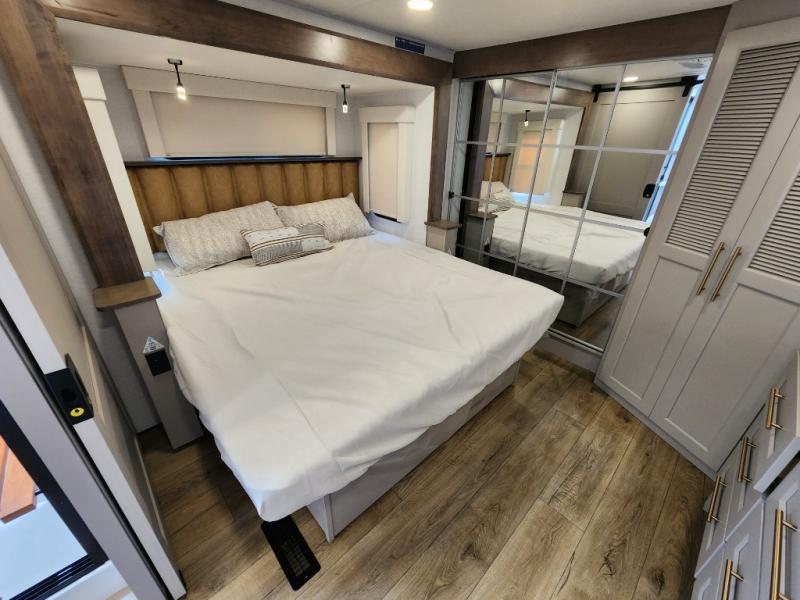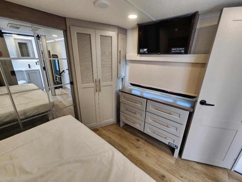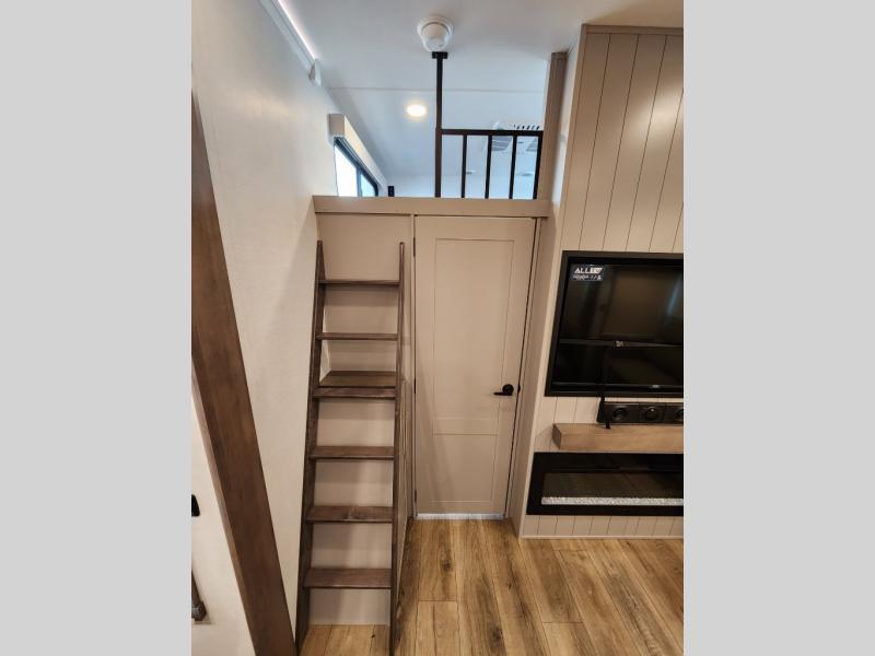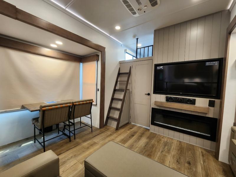 A spacious unit with sleeping for eight with plenty of choices to suit everyone! There is a front private bedroom with a king size bed that offers a large full front closet that has also been prepped for a washer and dryer if you choose that option. The front bath features a 40" x 30" shower and dual entry. Head down to the kitchen and living space at the bottom of the stairs to find a curbside slide that houses the 19 cu. ft. residential refrigerator, a pantry, and a swivel table and desk. As you continue on toward the rear of this coach, you will find a spacious living area along the roadside with a 50" Smart TV and a fireplace, a sofa sleeper slide, and a dual reclining loveseat. This makes a great gathering place for television watching, game playing, and even added sleeping space if needed at night. The rear private bedroom with its own private bath features a queen bed, two closets, and a Smart TV as well. The multipurpose loft area above can be accessed just before this rear bedroom entry by a ladder, and it is perfect for extra storage, or it can be used for added sleeping that the kiddos are sure to love.