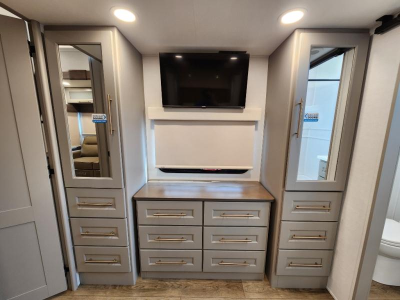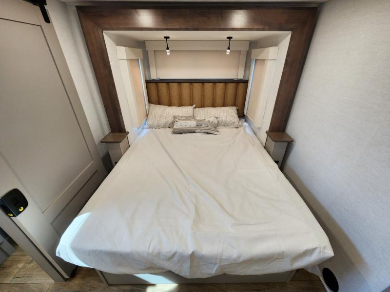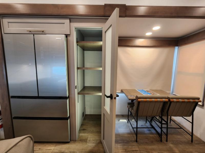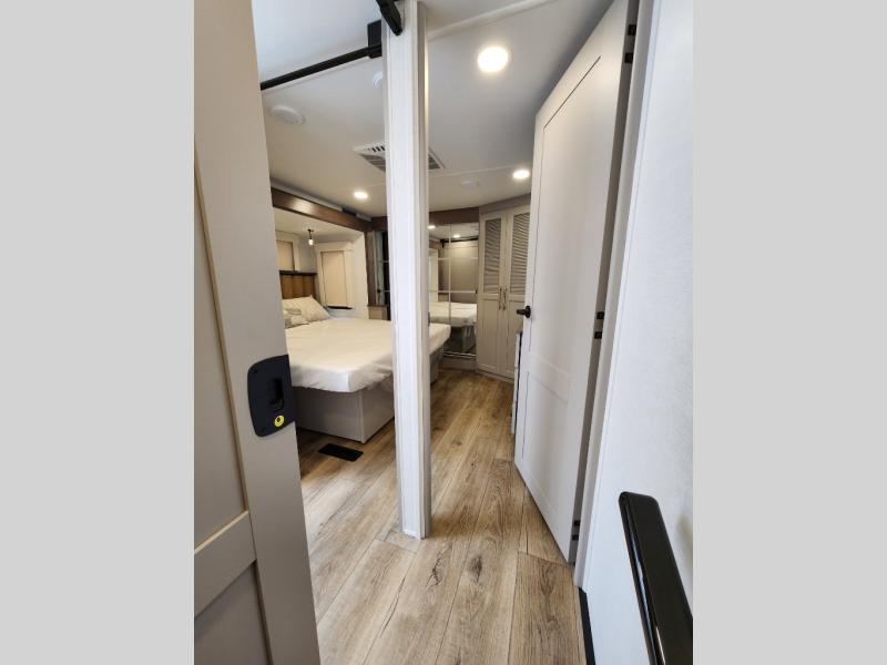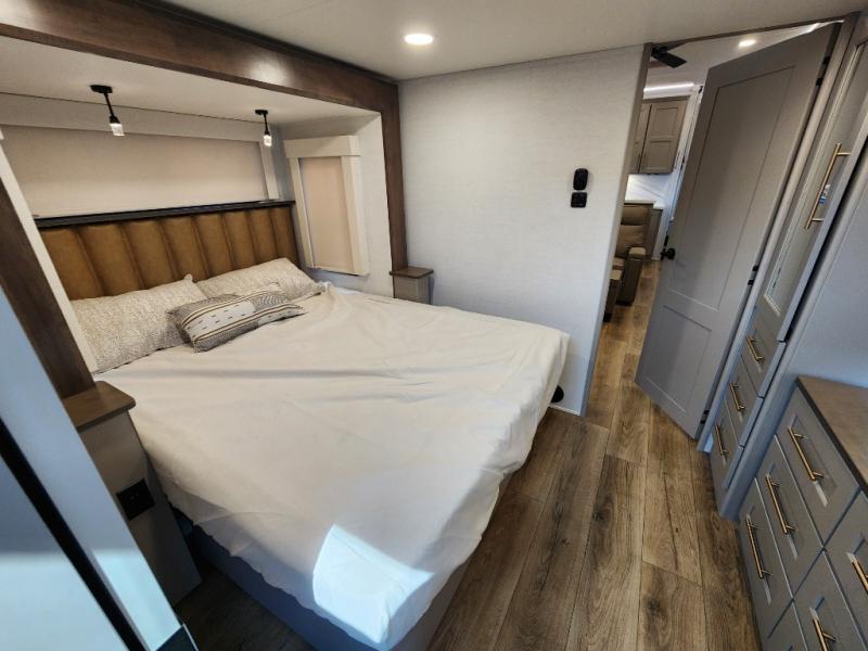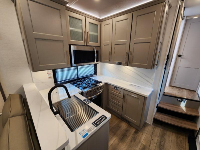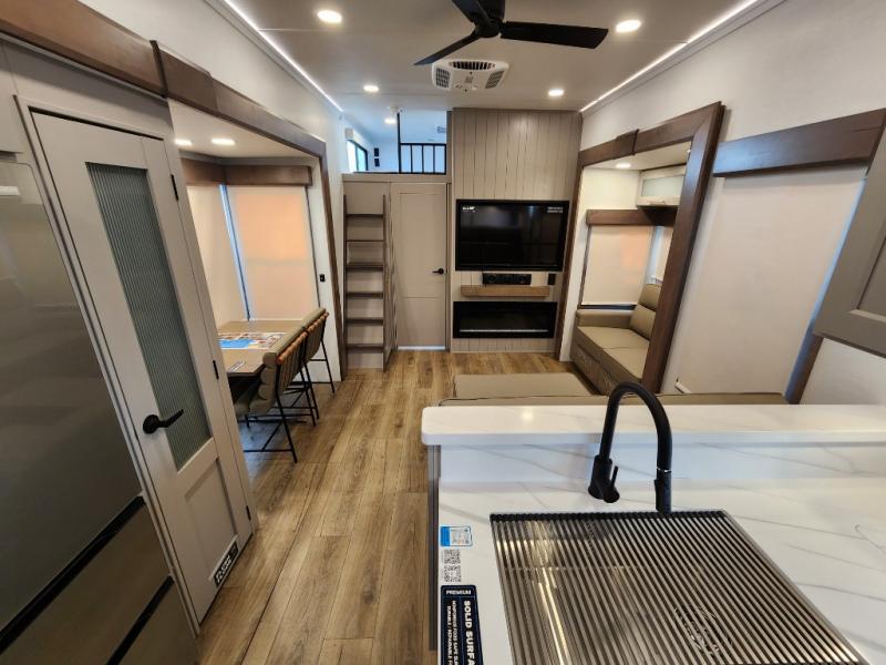 The Paradigm fifth wheels by Alliance RV are functional, high-quality, and luxurious for an unforgettable camping experience. There are three A/C units and a 40K BTU furnace to keep you comfortable year around, and you'll appreciate additional convenient amenities, like the all-in-one enclosed/heated utility center and the color coded and numbered wiring. A Helux Series coil spring pin box comes standard for hassle-free towing, along with Super-G 4,400 lb. rated tires and Dexter 7,000 lb. axles. You'll love the kitchen with its LG solid surface countertops and Lusso range, plus there is LED motion lighting in the pantry and a Maxx fan with a rain sensor to keep everything fresh when making dinner. Each model also includes an HD Smart TV in the living room and bedroom, plus a Winegard Air 360 antenna to keep you connected to the outside world. And of course there are a variety of options you can choose from to further customize your fifth wheel; dual pane windows, Super Solar Plus, slide out awning toppers, and generator prep or a generator to name a few!