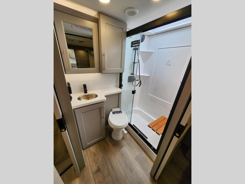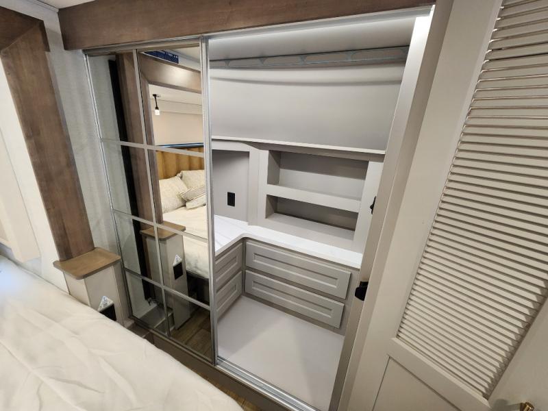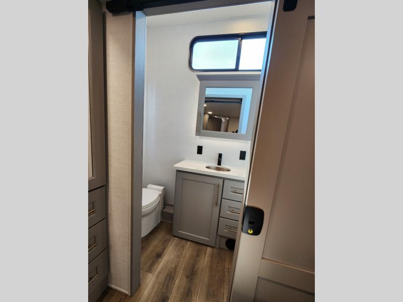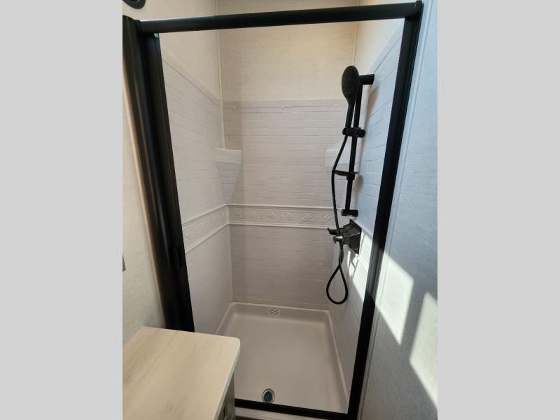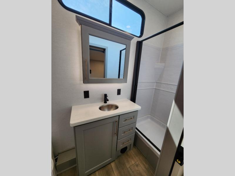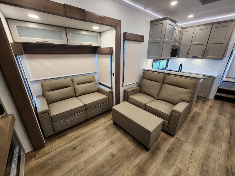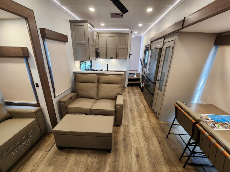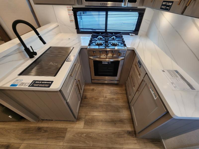 The Paradigm fifth wheels by Alliance RV are functional, high-quality, and luxurious for an unforgettable camping experience. There are three A/C units and a 40K BTU furnace to keep you comfortable year around, and you'll appreciate additional convenient amenities, like the all-in-one enclosed/heated utility center and the color coded and numbered wiring. A Helux Series coil spring pin box comes standard for hassle-free towing, along with Super-G 4,400 lb. rated tires and Dexter 7,000 lb. axles. You'll love the kitchen with its LG solid surface countertops and Lusso range, plus there is LED motion lighting in the pantry and a Maxx fan with a rain sensor to keep everything fresh when making dinner. Each model also includes an HD Smart TV in the living room and bedroom, plus a Winegard Air 360 antenna to keep you connected to the outside world. And of course there are a variety of options you can choose from to further customize your fifth wheel; dual pane windows, Super Solar Plus, slide out awning toppers, and generator prep or a generator to name a few!