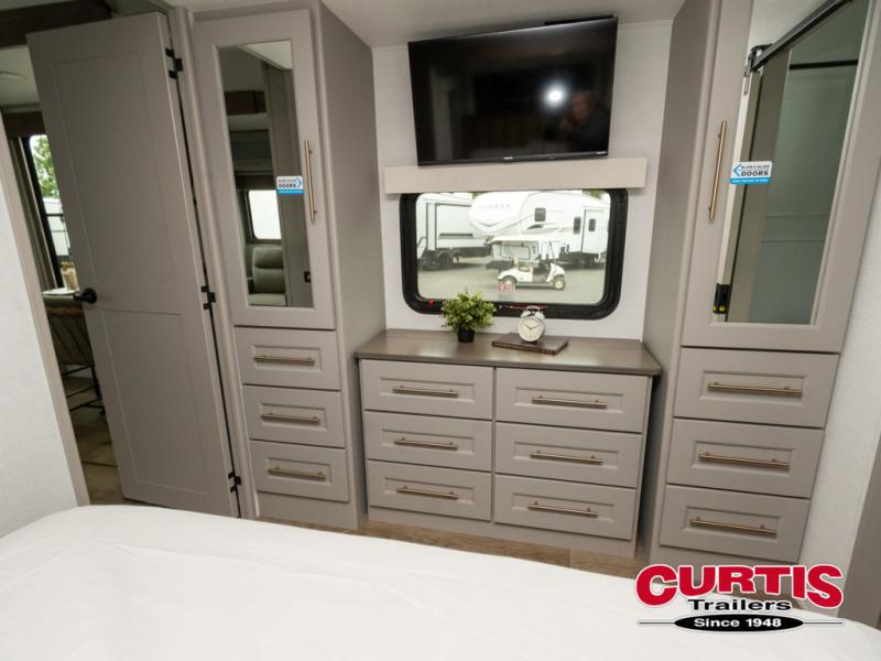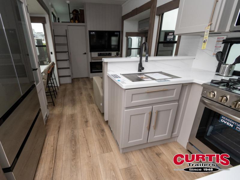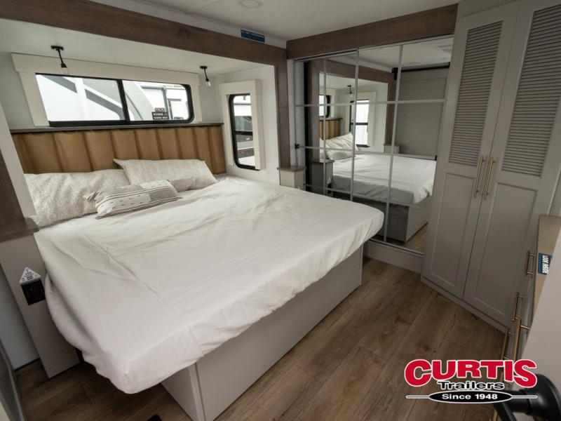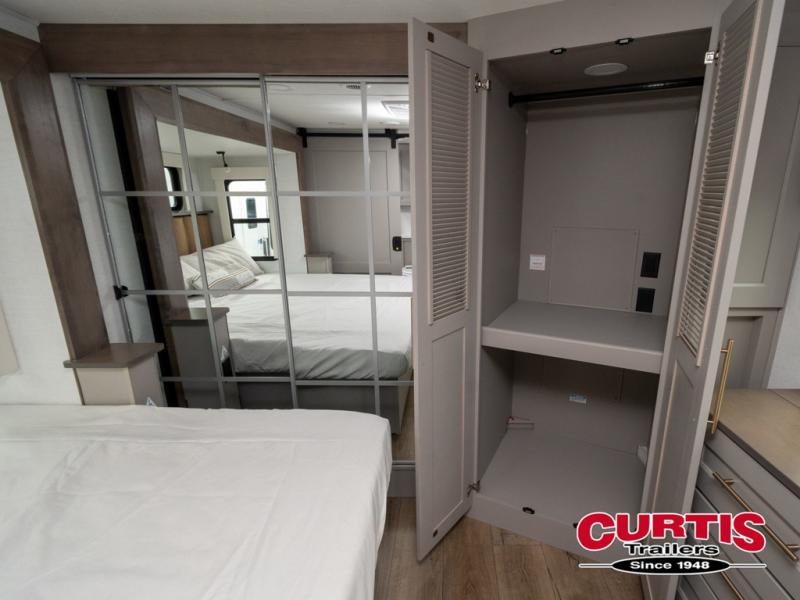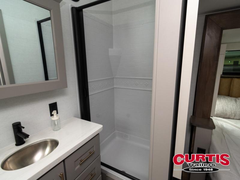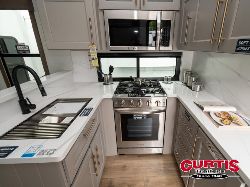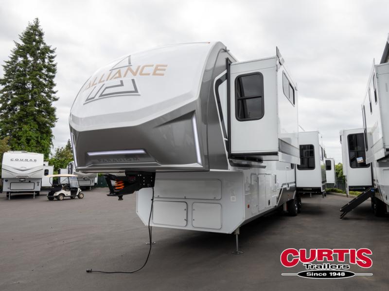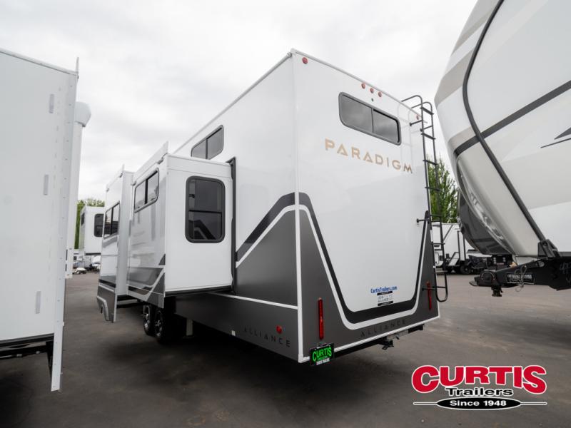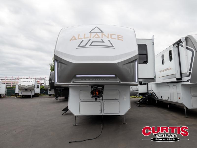 The Paradigm fifth wheels by Alliance RV are functional, high-quality, and luxurious for an unforgettable camping experience. There are three A/C units and a 40K BTU furnace to keep you comfortable year around, and you'll appreciate additional convenient amenities, like the all-in-one enclosed/heated utility center and the color coded and numbered wiring. A Helux Series coil spring pin box comes standard for hassle-free towing, along with Super-G 4,400 lb. rated tires and Dexter 7,000 lb. axles. You'll love the kitchen with its LG solid surface countertops and Lusso range, plus there is LED motion lighting in the pantry and a Maxx fan with a rain sensor to keep everything fresh when making dinner. Each model also includes an HD Smart TV in the living room and bedroom, plus a Winegard Air 360 antenna to keep you connected to the outside world. And of course there are a variety of options you can choose from to further customize your fifth wheel; dual pane windows, Super Solar Plus, slide out awning toppers, and generator prep or a generator to name a few!