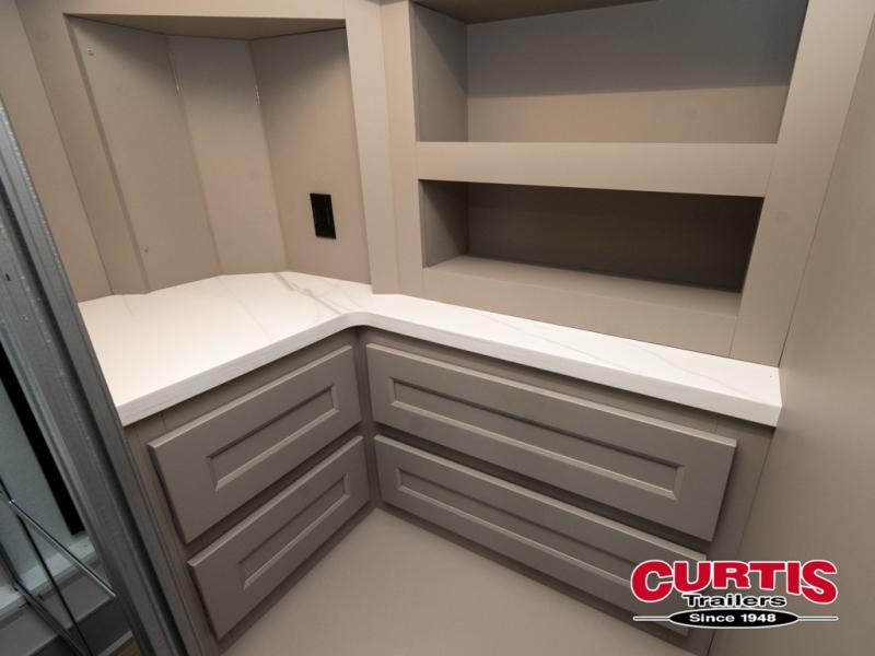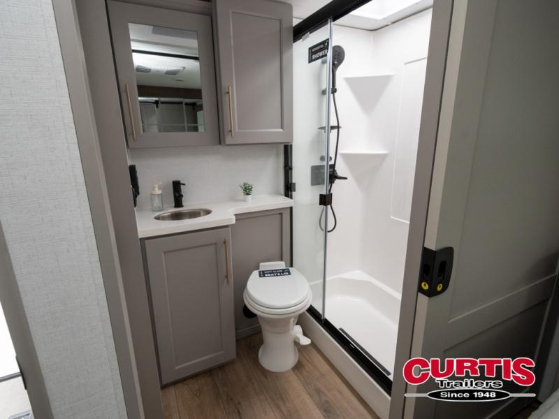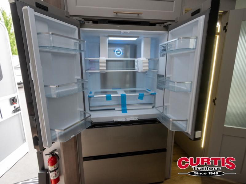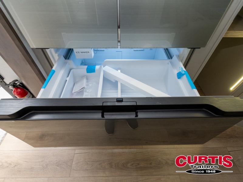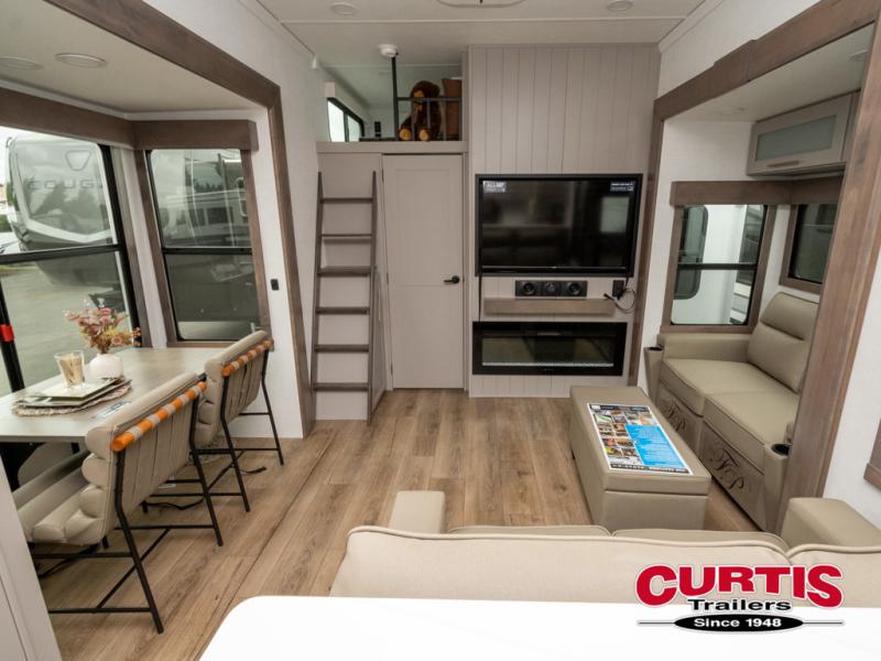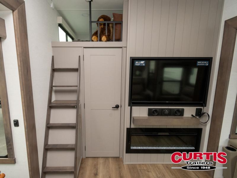 A spacious unit with sleeping for eight with plenty of choices to suit everyone! There is a front private bedroom with a king size bed that offers a large full front closet that has also been prepped for a washer and dryer if you choose that option. The front bath features a 40" x 30" shower and dual entry. Head down to the kitchen and living space at the bottom of the stairs to find a curbside slide that houses the 19 cu. ft. residential refrigerator, a pantry, and a swivel table and desk. As you continue on toward the rear of this coach, you will find a spacious living area along the roadside with a 50" Smart TV and a fireplace, a sofa sleeper slide, and a dual reclining loveseat. This makes a great gathering place for television watching, game playing, and even added sleeping space if needed at night. The rear private bedroom with its own private bath features a queen bed, two closets, and a Smart TV as well. The multipurpose loft area above can be accessed just before this rear bedroom entry by a ladder, and it is perfect for extra storage, or it can be used for added sleeping that the kiddos are sure to love.