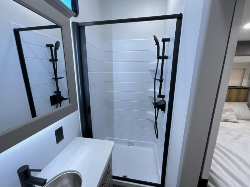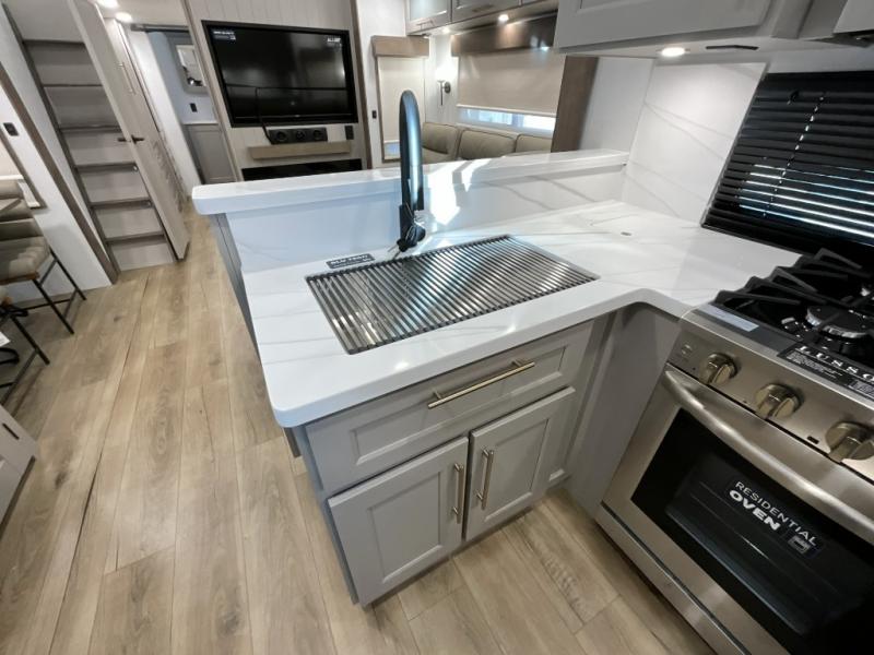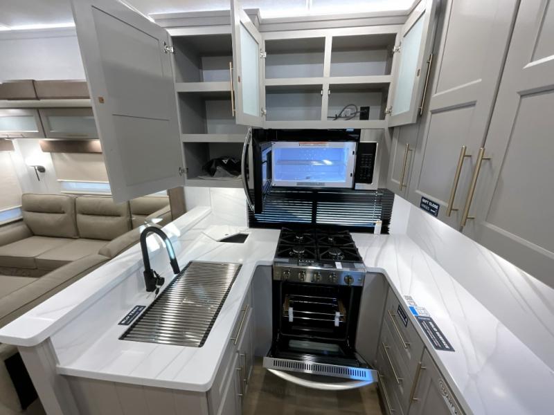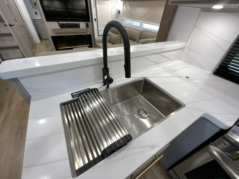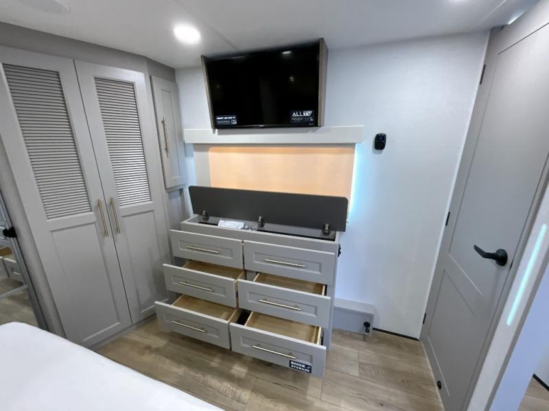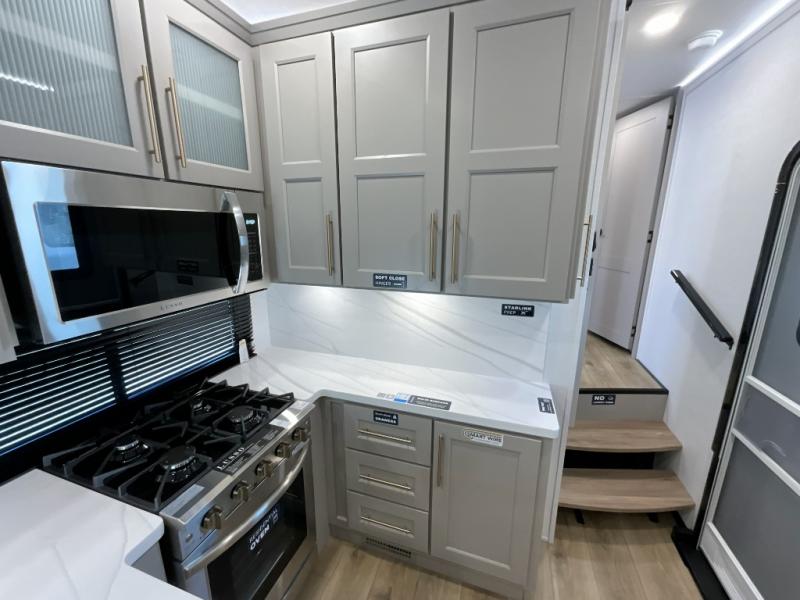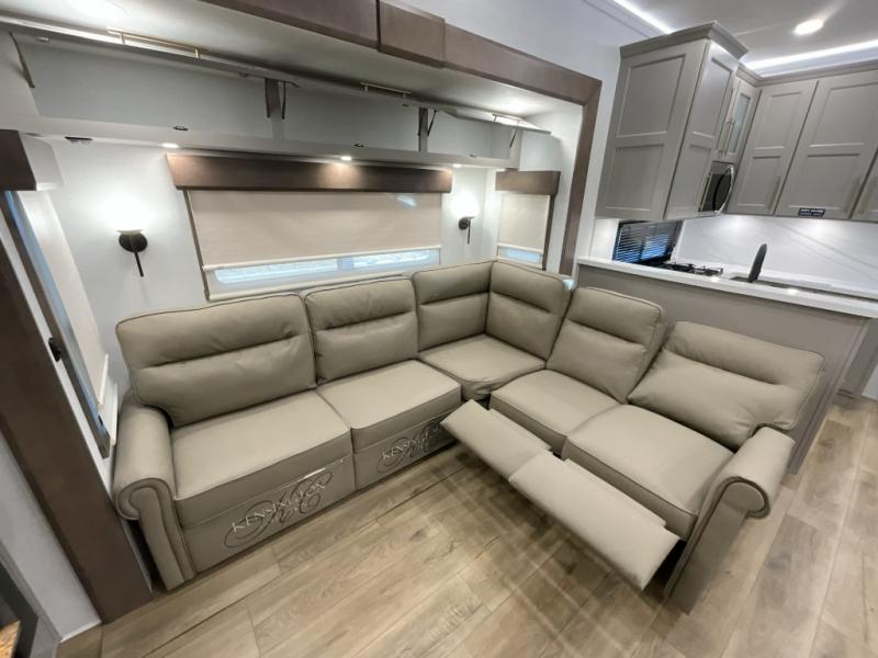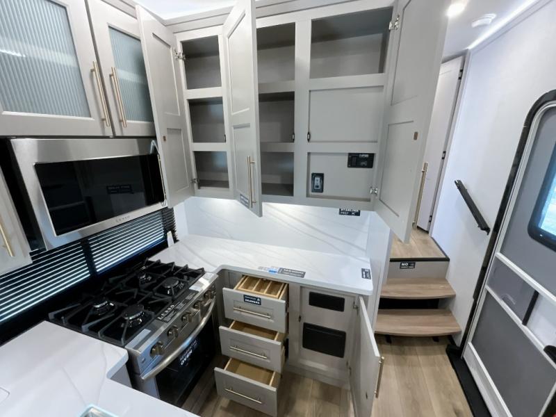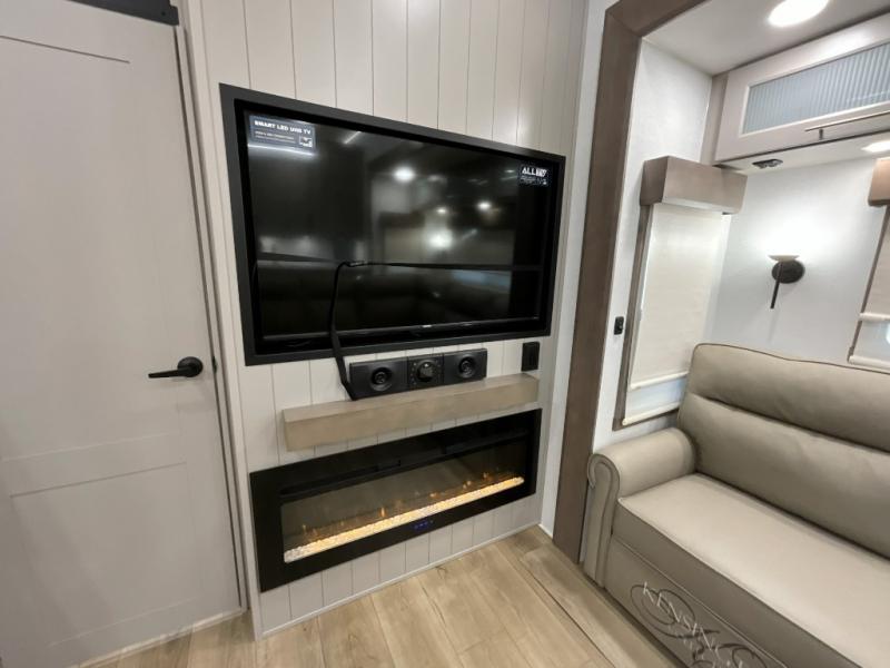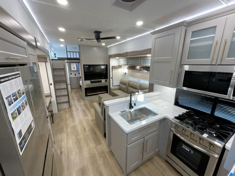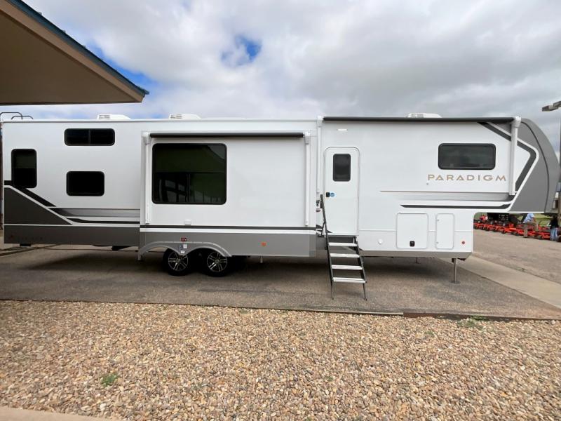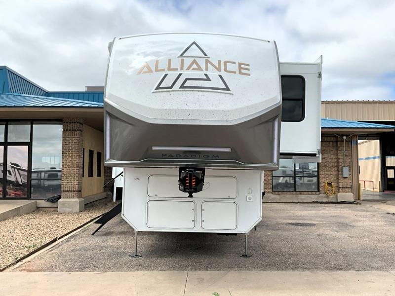 The Paradigm fifth wheels by Alliance RV are functional, high-quality, and luxurious for an unforgettable camping experience. There are three A/C units and a 40K BTU furnace to keep you comfortable year around, and you'll appreciate additional convenient amenities, like the all-in-one enclosed/heated utility center and the color coded and numbered wiring. A Helux Series coil spring pin box comes standard for hassle-free towing, along with Super-G 4,400 lb. rated tires and Dexter 7,000 lb. axles. You'll love the kitchen with its LG solid surface countertops and Lusso range, plus there is LED motion lighting in the pantry and a Maxx fan with a rain sensor to keep everything fresh when making dinner. Each model also includes an HD Smart TV in the living room and bedroom, plus a Winegard Air 360 antenna to keep you connected to the outside world. And of course there are a variety of options you can choose from to further customize your fifth wheel; dual pane windows, Super Solar Plus, slide out awning toppers, and generator prep or a generator to name a few!